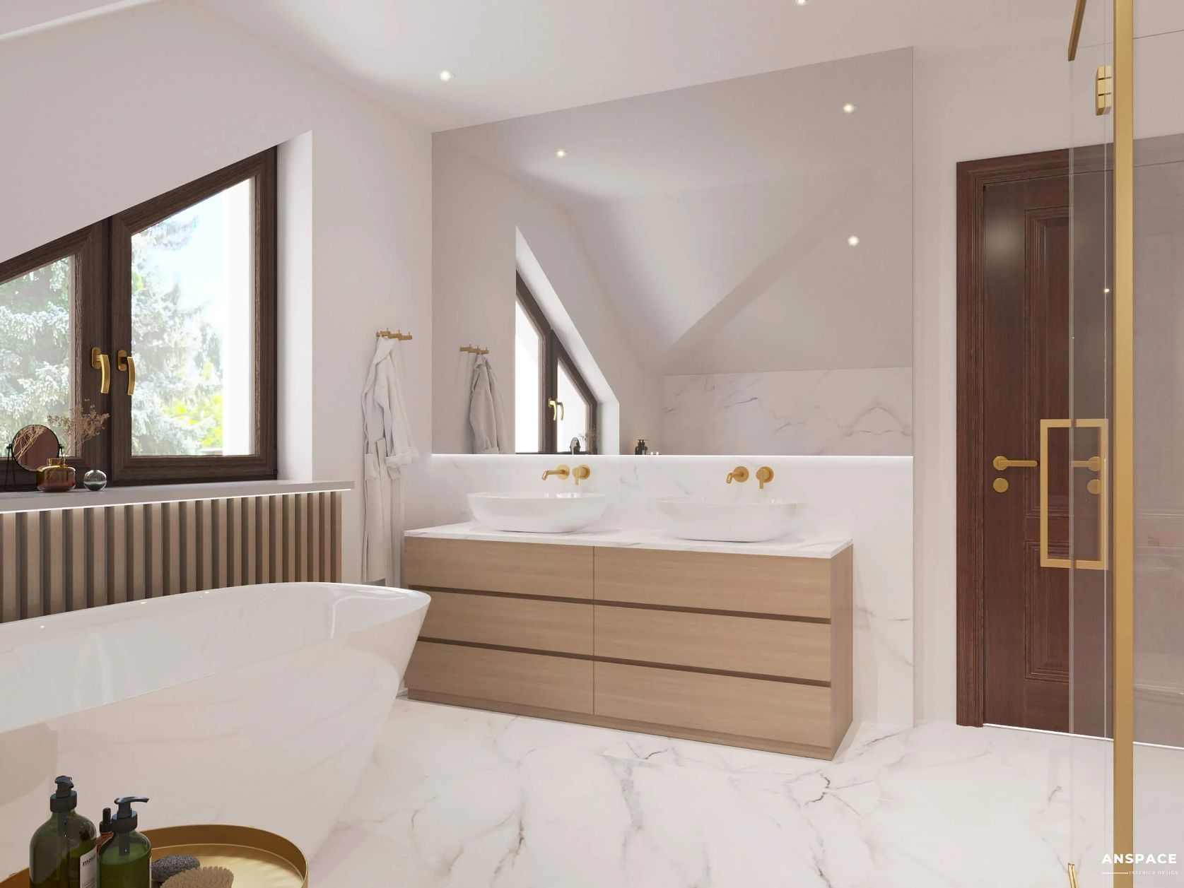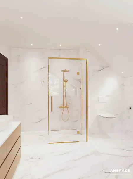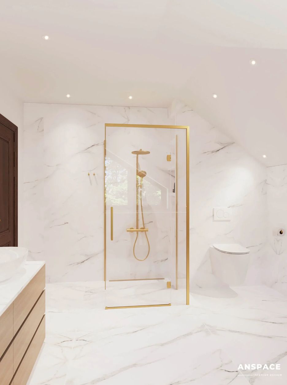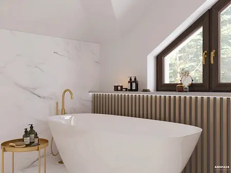 Centralnym punktem aranżacji jest wolnostojąca wanna, subtelnie współgrająca z lamelowym wykończeniem pod parapetem. Łazienka ze skosem i wanną została zaprojektowana w jasnych tonacjach, z marmurowymi powierzchniami i złotymi akcentami, które nadają wnętrzu wyrafinowany charakter.
