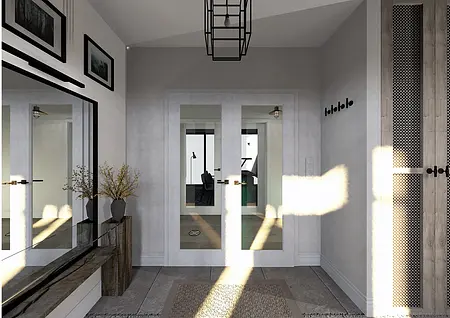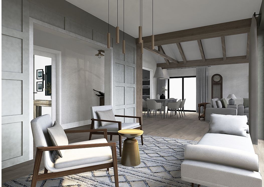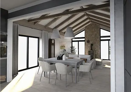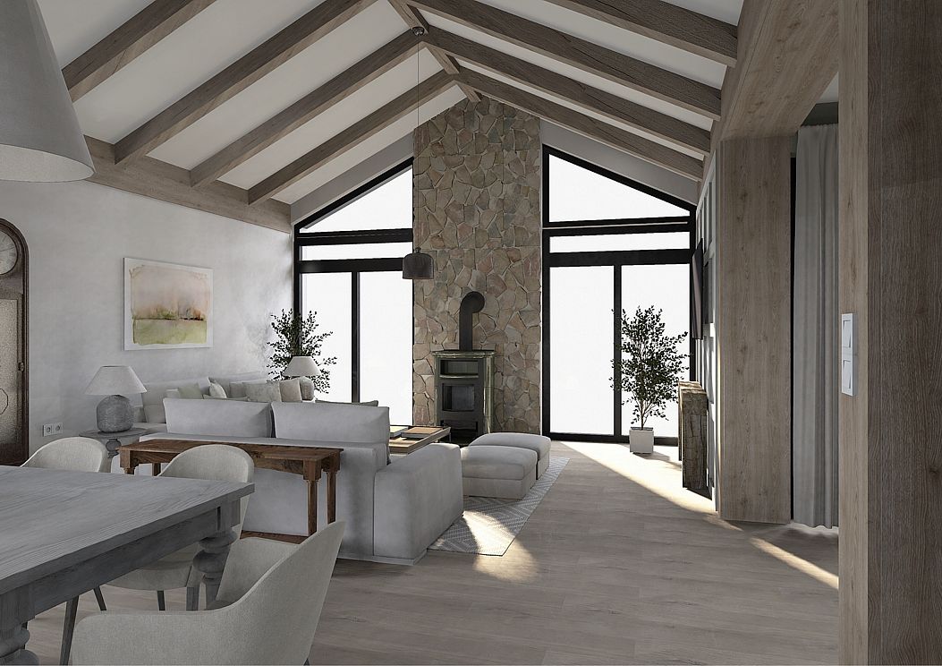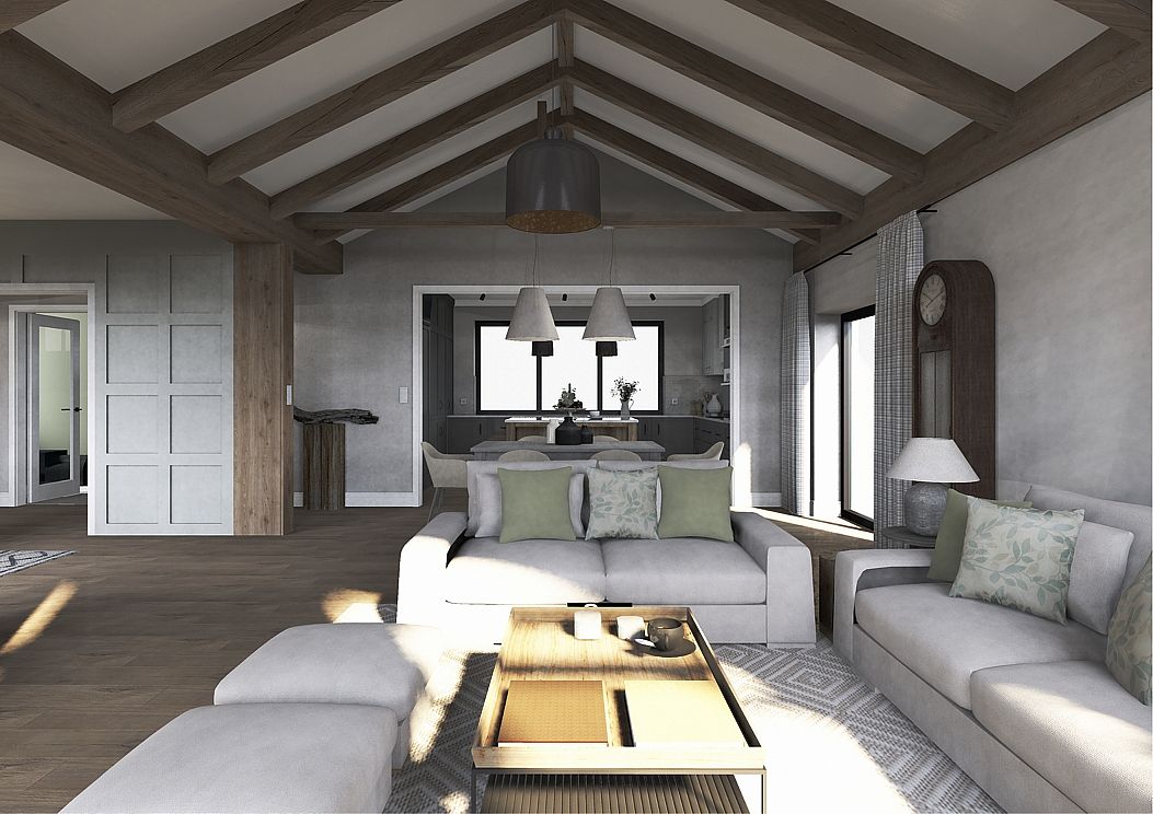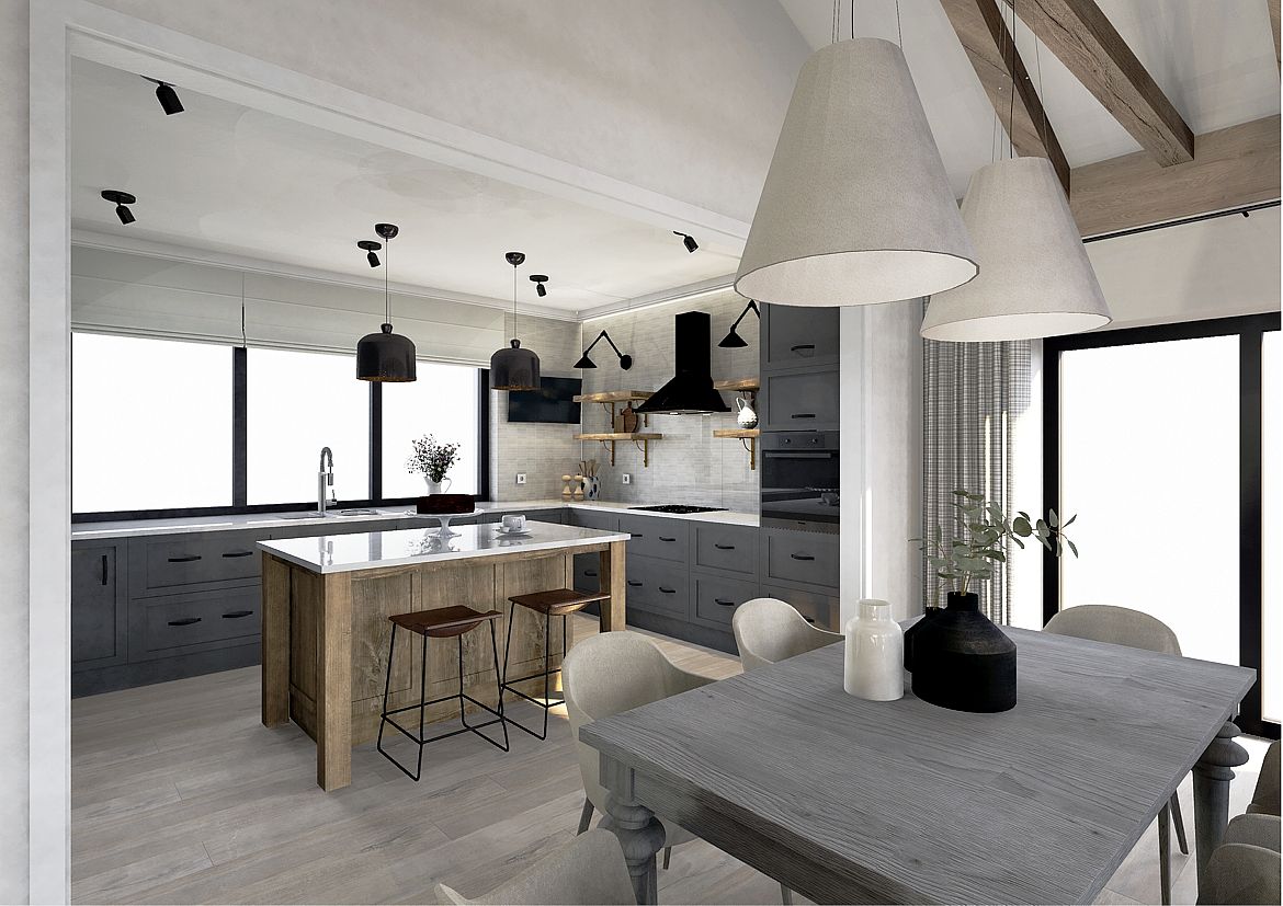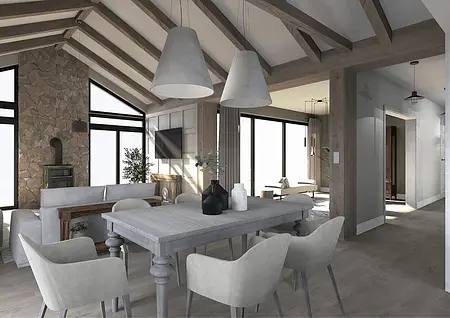 Elegancja spotyka pasję. Nowy rozdział w sercu natury. To nie jest projekt o powolnym odpoczynku – to projekt o pasji, działaniu i powrocie do korzeni w wielkim stylu. Inwestorzy, para dojrzałych, pełnych energii ludzi, postanowili zamienić miejski zgiełk na przestrzeń, w której natura dyktuje warunki, a oni nadają jej nowoczesny kształt. Dom otoczony naturą, sadami i agroturystyką stał się manifestem ich nowej drogi. Dojrzały design w nowoczesnym wydaniu Wnętrze w stylu Modern Farmhouse zaprojektowałam tak, by łączyło sielski klimat z luksusowym wykończeniem. To przestrzeń dla ludzi, którzy wiedzą, czego chcą: ma być szlachetnie, wygodnie i z klasą, która przetrwa próbę czasu. Co wyróżnia ten projekt? Reprezentacyjna strefa dzienna: serce domu, w którym wysoka jakość materiałów spotyka się z domowym ciepłem. To tu będą zapadać decyzje o zbiorach i tu będą goszczeni pierwsi goście agroturystyki. Harmonia barw i struktur: wykorzystaliśmy paletę „nowoczesnej wsi” – czyste biele, głębo