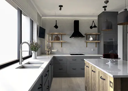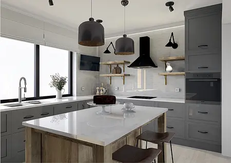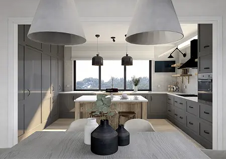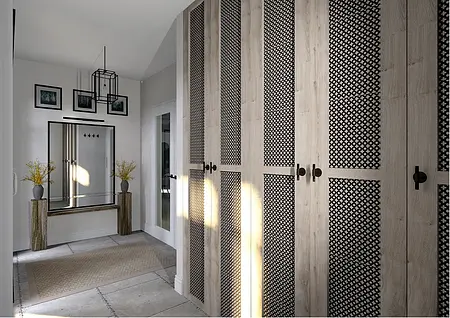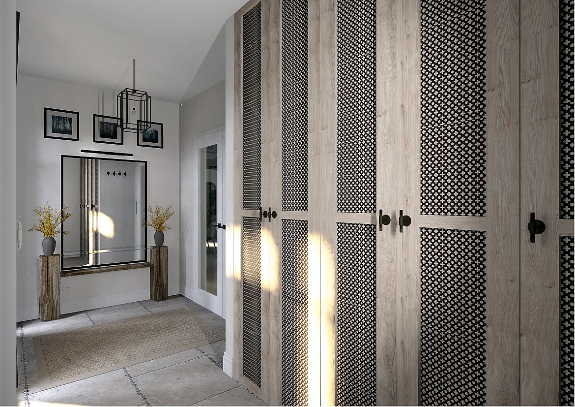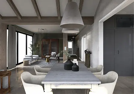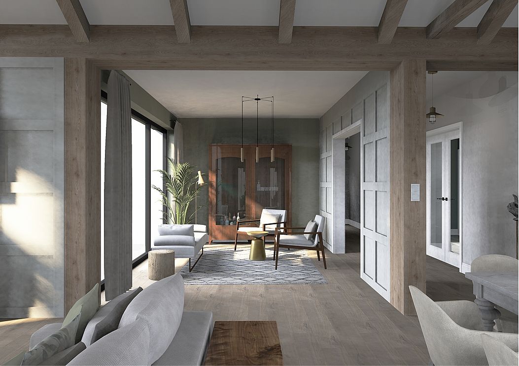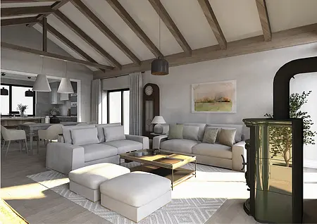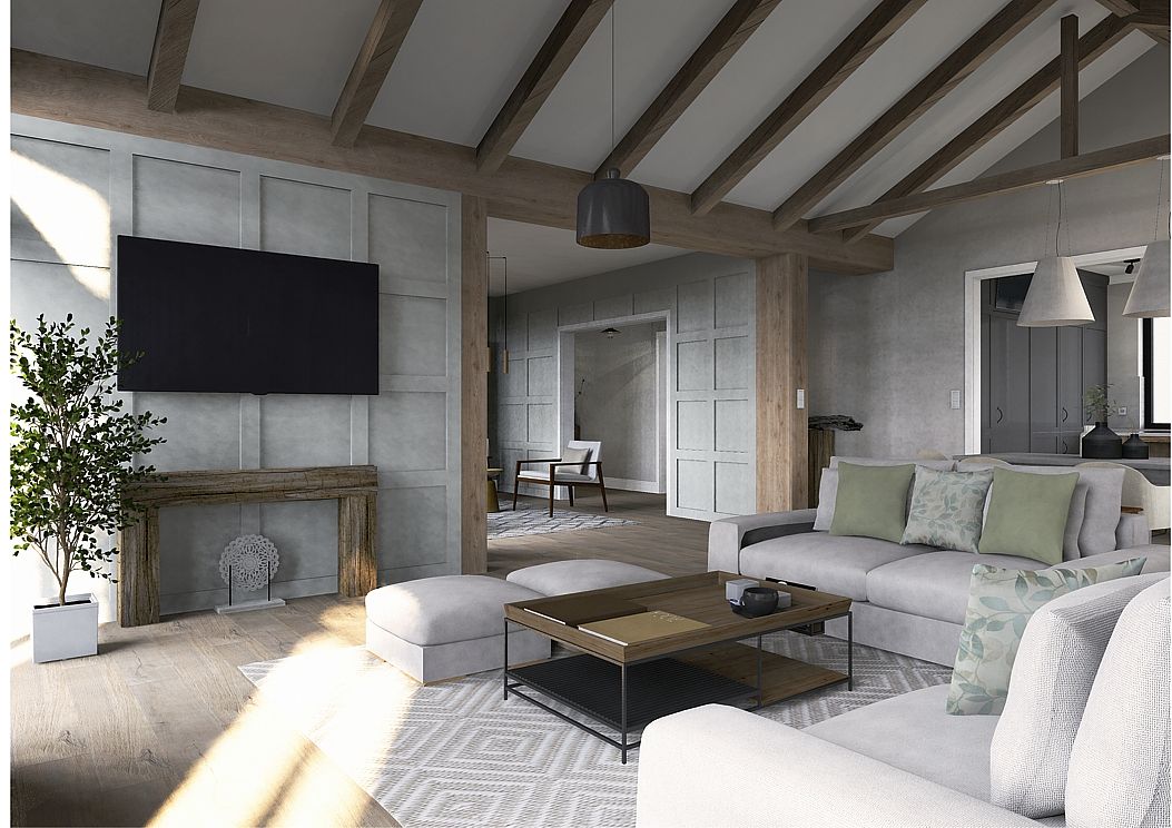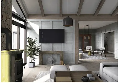 Elegancja spotyka pasję. Nowy rozdział w sercu natury. To nie jest projekt o powolnym odpoczynku – to projekt o pasji, działaniu i powrocie do korzeni w wielkim stylu. Inwestorzy, para dojrzałych, pełnych energii ludzi, postanowili zamienić miejski zgiełk na przestrzeń, w której natura dyktuje warunki, a oni nadają jej nowoczesny kształt. Dom otoczony naturą, sadami i agroturystyką stał się manifestem ich nowej drogi. Dojrzały design w nowoczesnym wydaniu Wnętrze w stylu Modern Farmhouse zaprojektowałam tak, by łączyło sielski klimat z luksusowym wykończeniem. To przestrzeń dla ludzi, którzy wiedzą, czego chcą: ma być szlachetnie, wygodnie i z klasą, która przetrwa próbę czasu. Co wyróżnia ten projekt? Reprezentacyjna strefa dzienna: serce domu, w którym wysoka jakość materiałów spotyka się z domowym ciepłem. To tu będą zapadać decyzje o zbiorach i tu będą goszczeni pierwsi goście agroturystyki. Harmonia barw i struktur: wykorzystaliśmy paletę „nowoczesnej wsi” – czyste biele, głębo