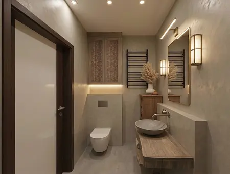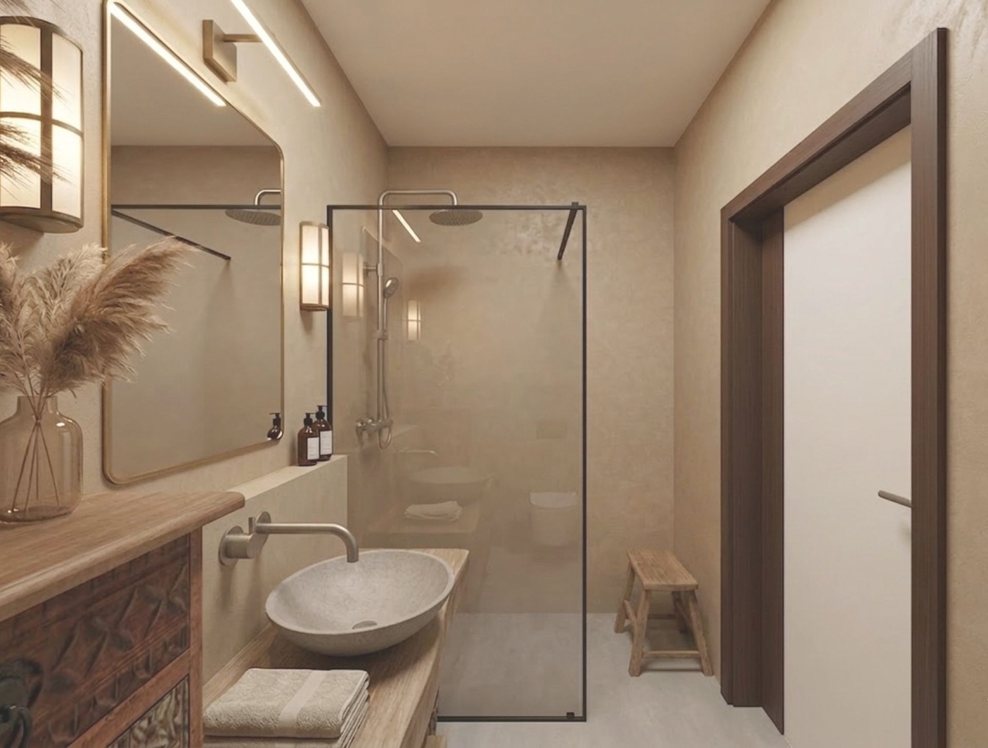 W skrócie: To wnętrze, w którym surowość mikrocementu spotyka się z ciepłem naturalnych tynków, tworząc organiczną, sprzyjającą regeneracji przestrzeń w