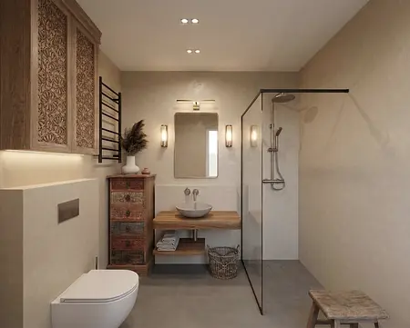 Naturalne materie: Wykorzystanie tadelaktu (tradycyjnego marokańskiego tynku wapiennego), który dzięki polerowaniu kamieniem zyskuje wodoodporność i aksamitny połysk, oraz oddychających tynków glinianych regulujących mikroklimat wnętrza.