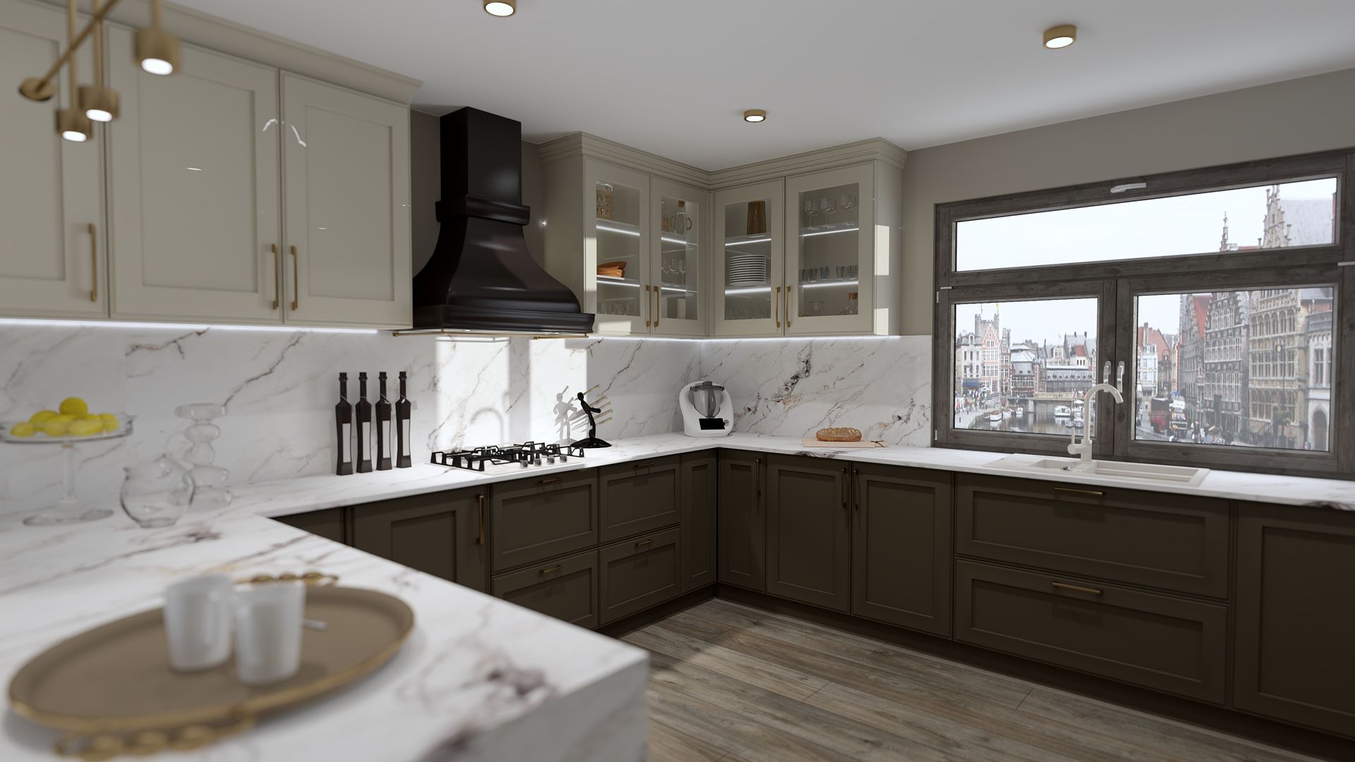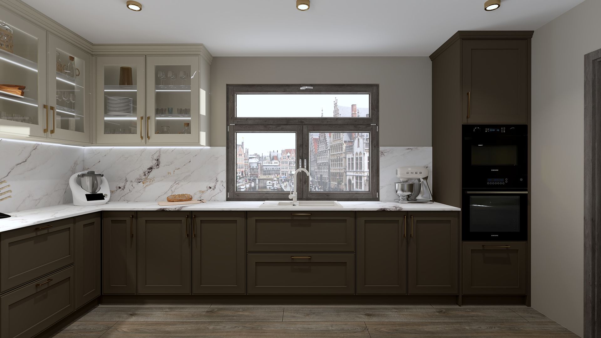 Nowoczesne wnętrze salonu z brązowymi meblami, szarymi ścianami i dużymi oknami. 8 zdjęć w projekcie Zobacz projekt