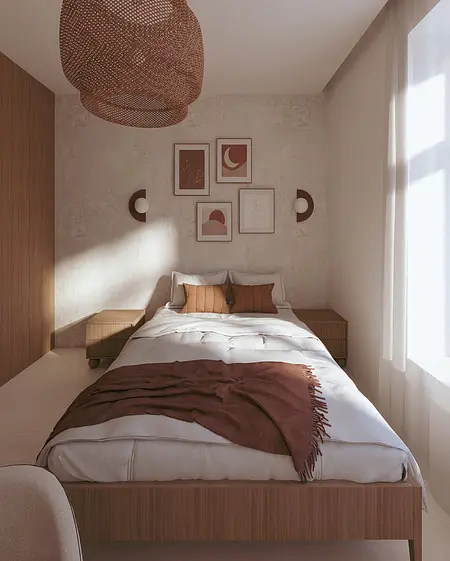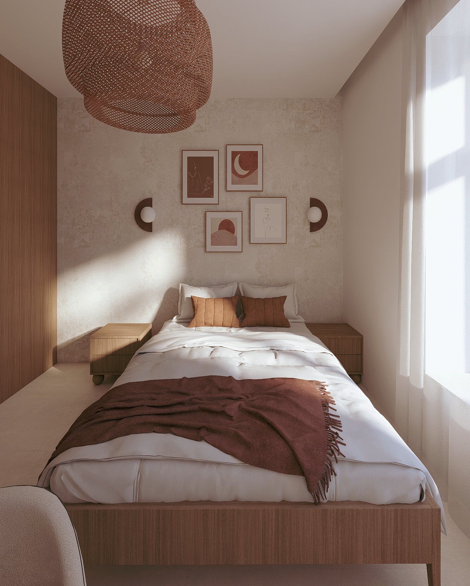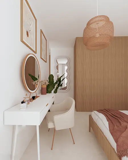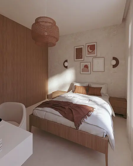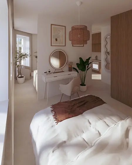 - sypialnię, która łączy jasne, przestronne wnętrze z ciepłymi akcentami drewna i ziemistych barw. Naturalne materiały, subtelne oświetlenie i delikatne tekstylia tworzą harmonijną przestrzeń, w której można odpocząć i zrelaksować się po długim dniu.