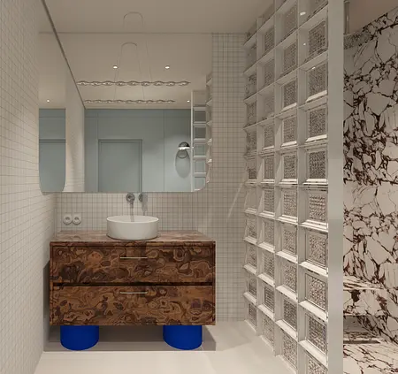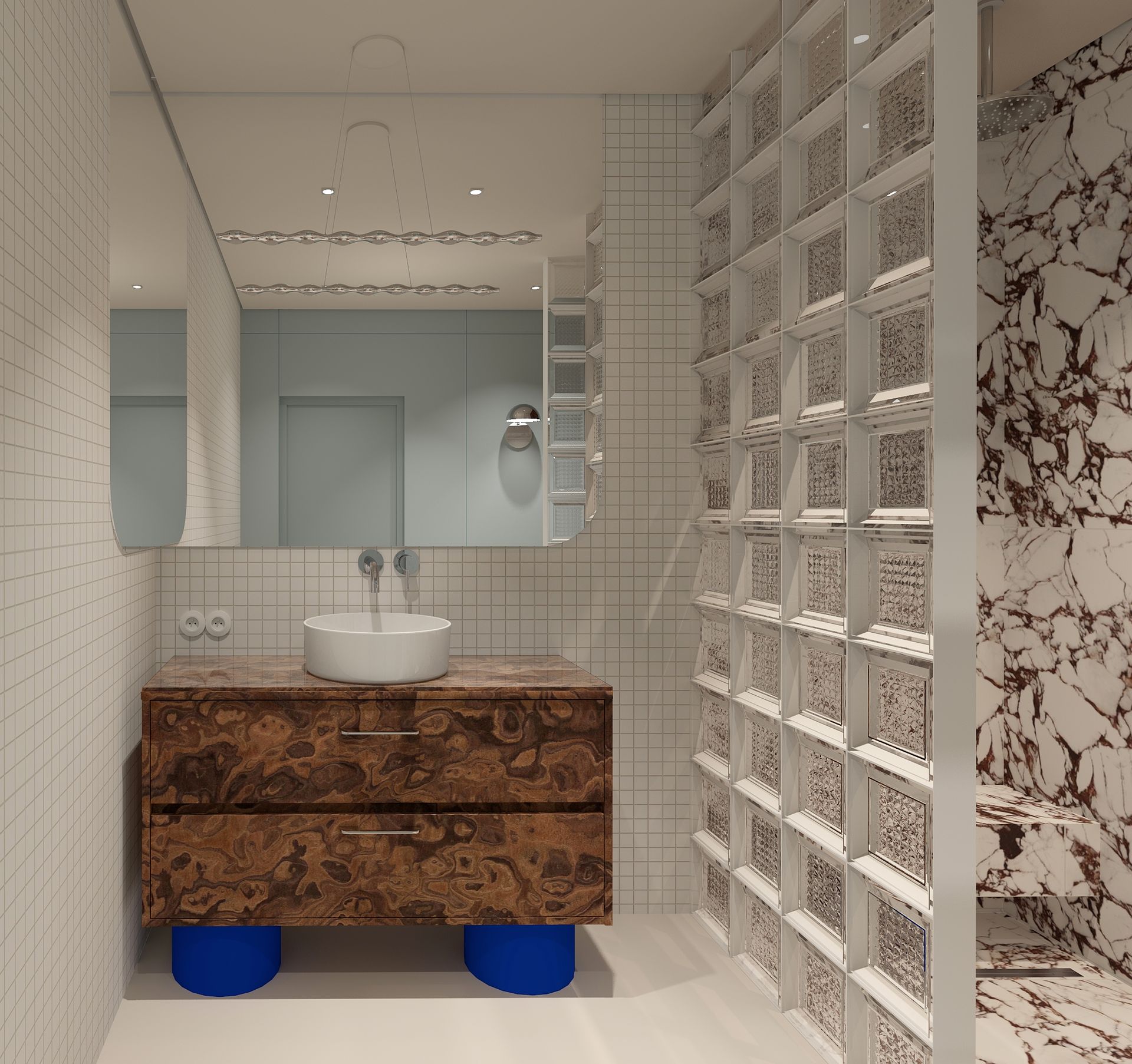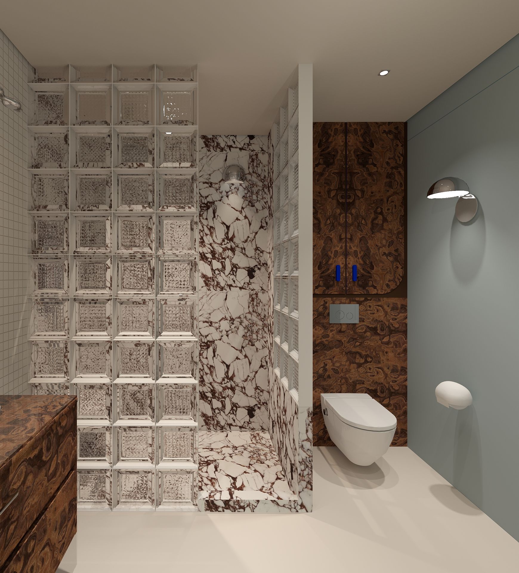 Łazienka pełna kontrastów i faktur, gdzie surowa geometria spotyka organiczne desenie. Prysznicowa ściana z luksferów wprowadza grę światła, budując subtelną granicę między strefami, a fornir o wyrazistym rysunku dodaje wnętrzu ciepła i głębi. Nie mogło zabraknąć kobaltowych akcentów, które jak zawsze dodają energii ;)💫