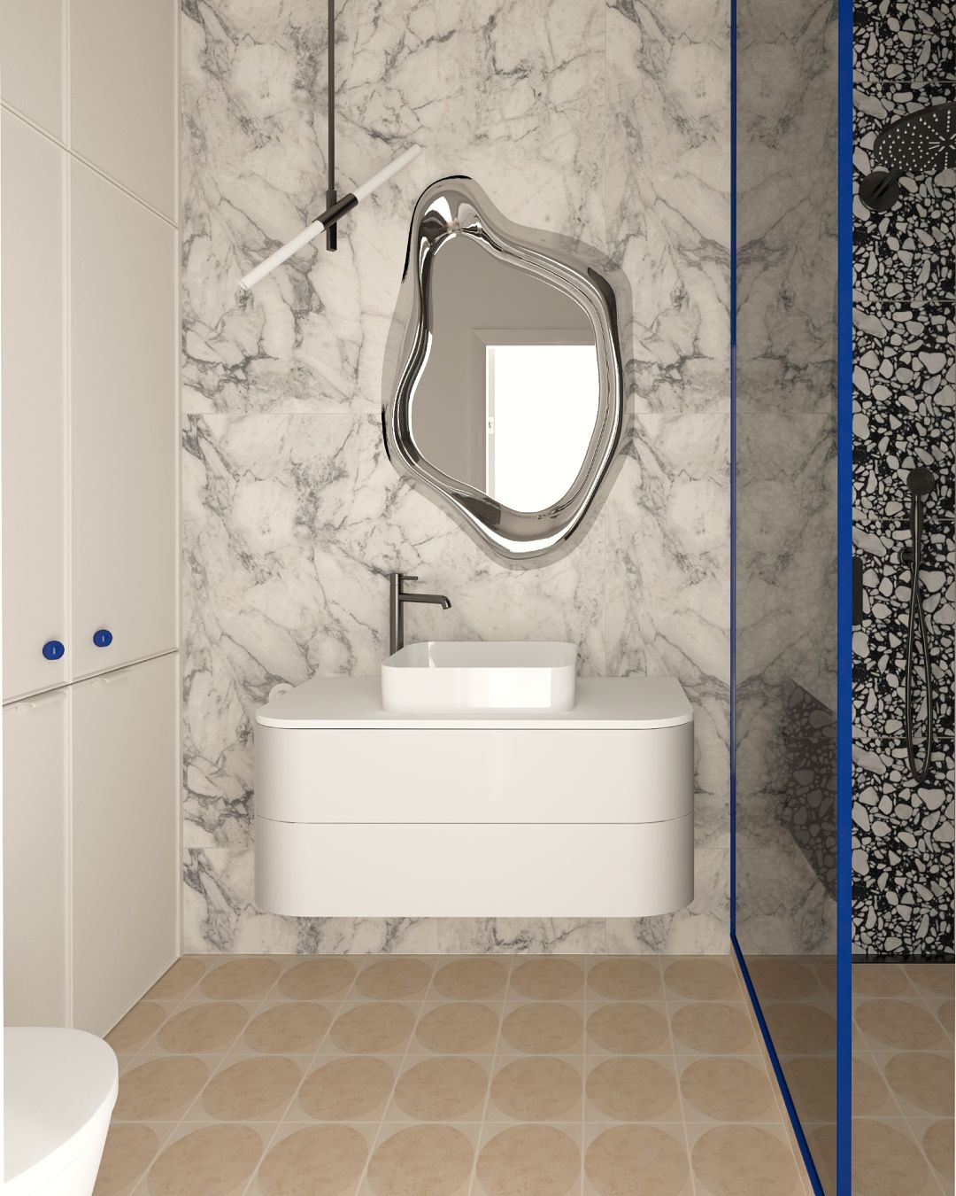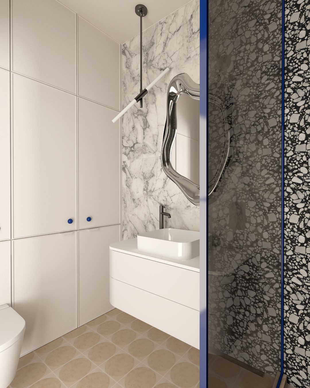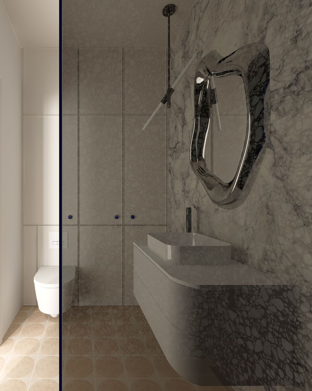 Takie założenie towarzyszyło projektowi łazienki w jednym z wrocławskich apartamentów. Dzięki zastosowaniu niskiego stelaża podtynkowego mogliśmy umieścić pralkę tuż nad nim, uwalniając dodatkową przestrzeń. Ścianka prysznicowa prowadzona do samego sufitu pozwoliła z kolei powiększyć optycznie powierzchnię tej 4,5-metrowej łazienki.