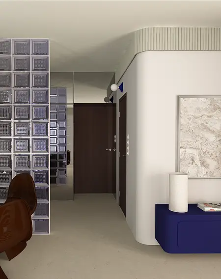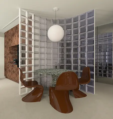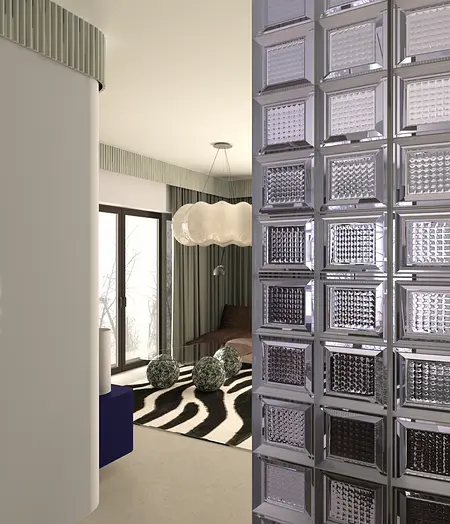W tym wnętrzu kamień przeplata się ze śmiałym fornirem, luksferowe przeszklenia dzielą przestrzeń ale nie światło, odważny bakłażan w dodatkach gra rolę wisienki na torcie, a to wszystko odbija się w lustrach, potęgując efekt przestrzeni i blasku.