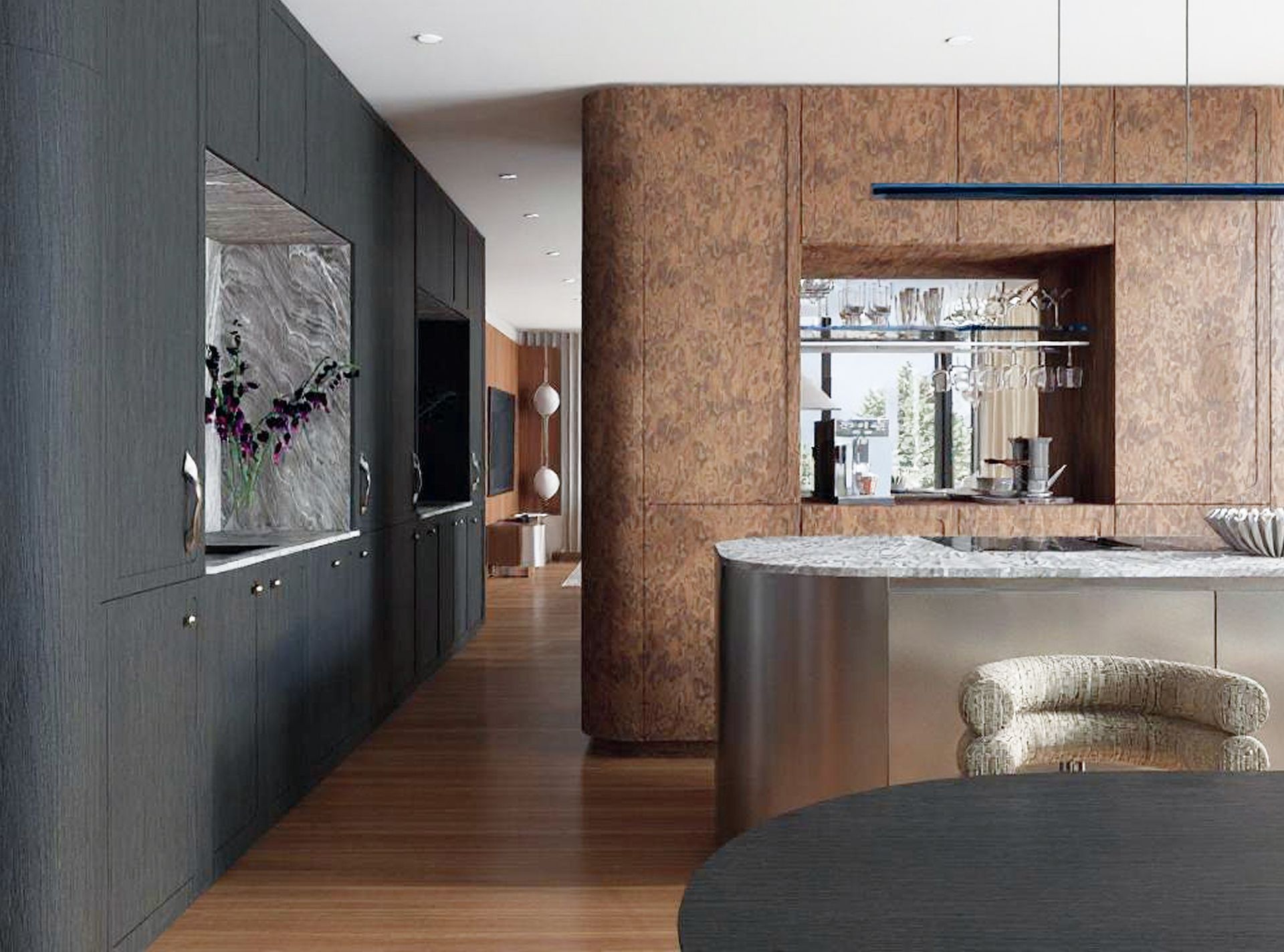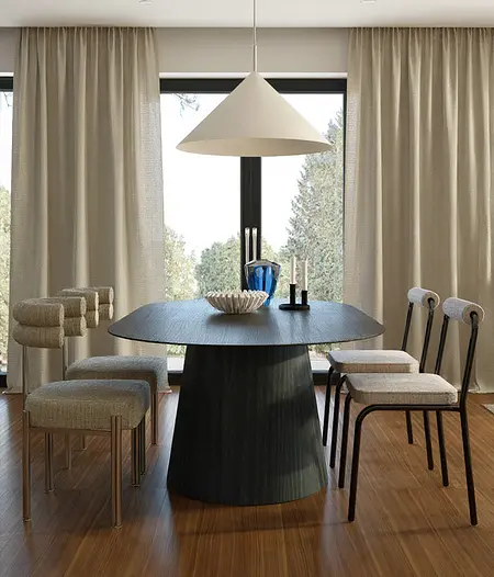 To wnętrze to harmonijne połączenie formy, faktury i światła. Czyste linie mebli, subtelna paleta barw i szlachetność materiałów tworzą charakterne wnętrze — eleganckie i przytulne zarazem.
