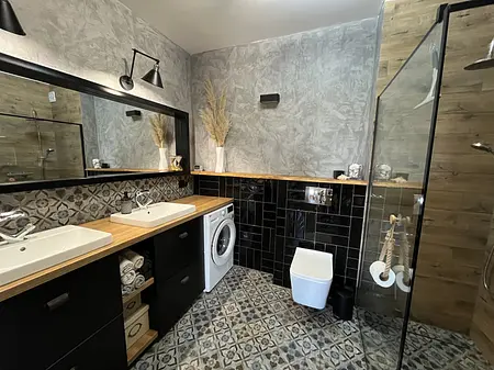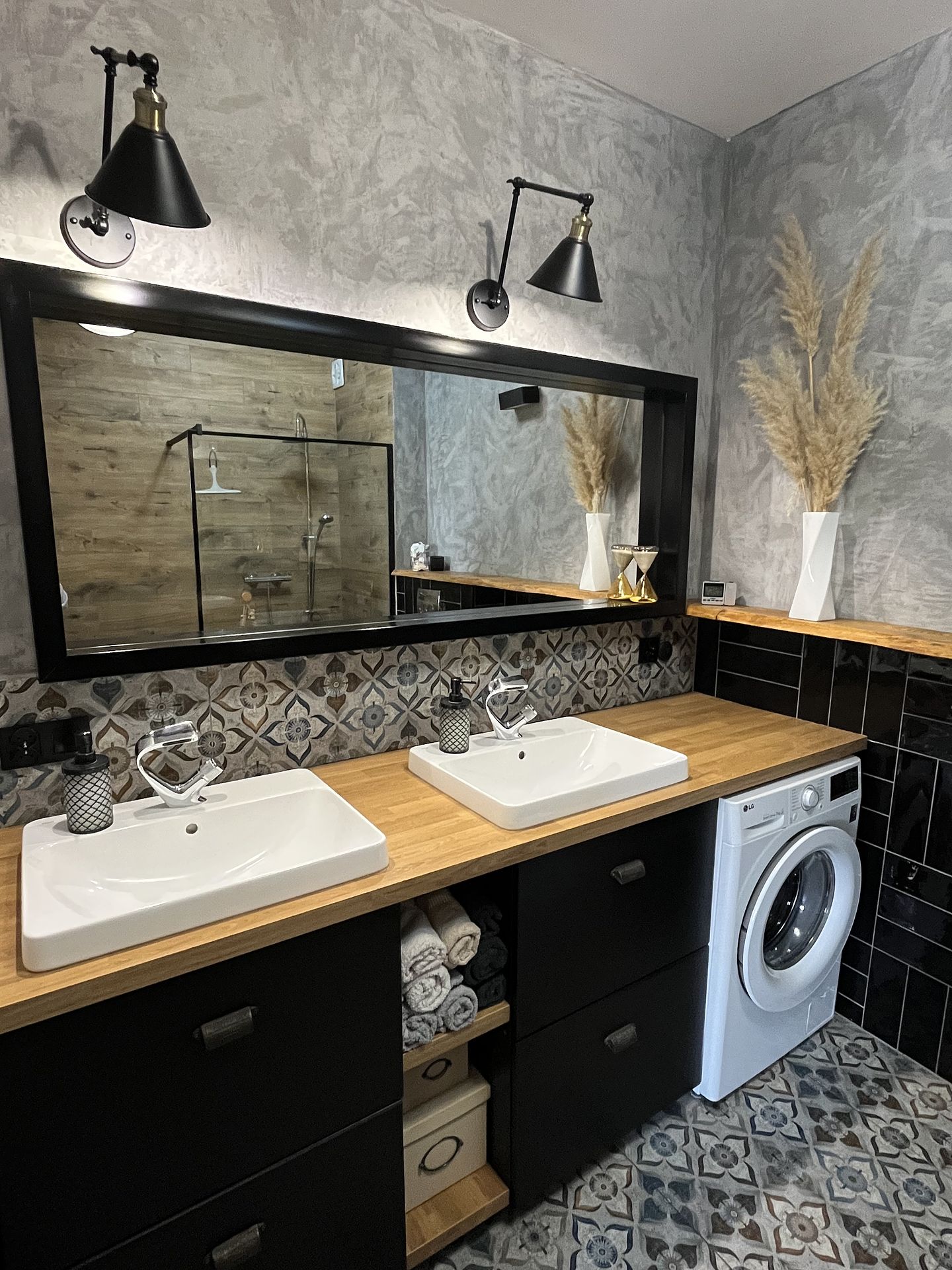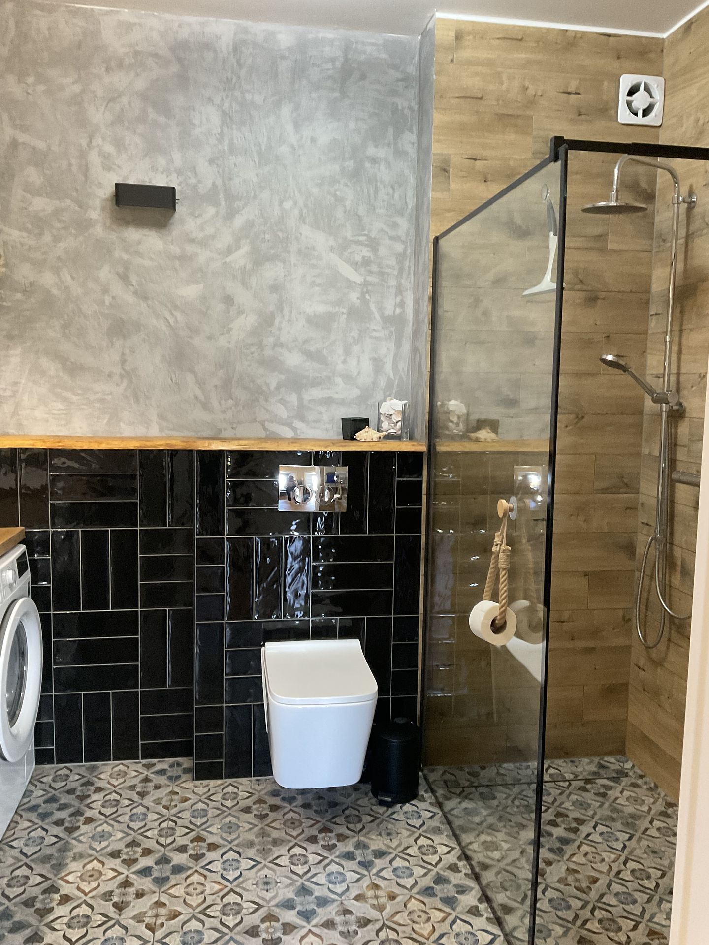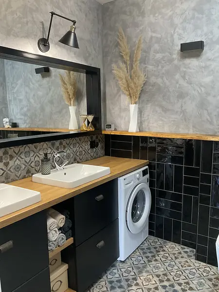Potrzeby klientów: - pralka pod blatem łazienkowym - ciemne kolory, przytulnie - charakternie, beton na ścianie - ekonomiczne rozwiązania Odpowiedź projektowa: - beton dekoracyjny na ścianie - dobór płytki podłogowej- postarzanej, z klasycznym hiszpańskim wzorem - czarna płytka ścienna z połyskiem - drewniana pólka , drewnopodobny blat - udało się zamknąć w niewysokim budżecie