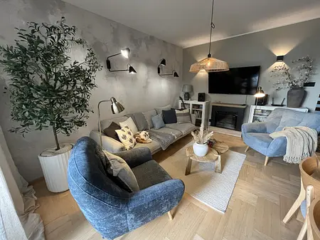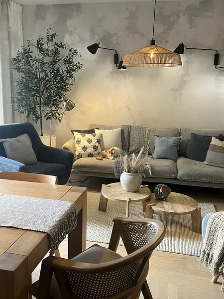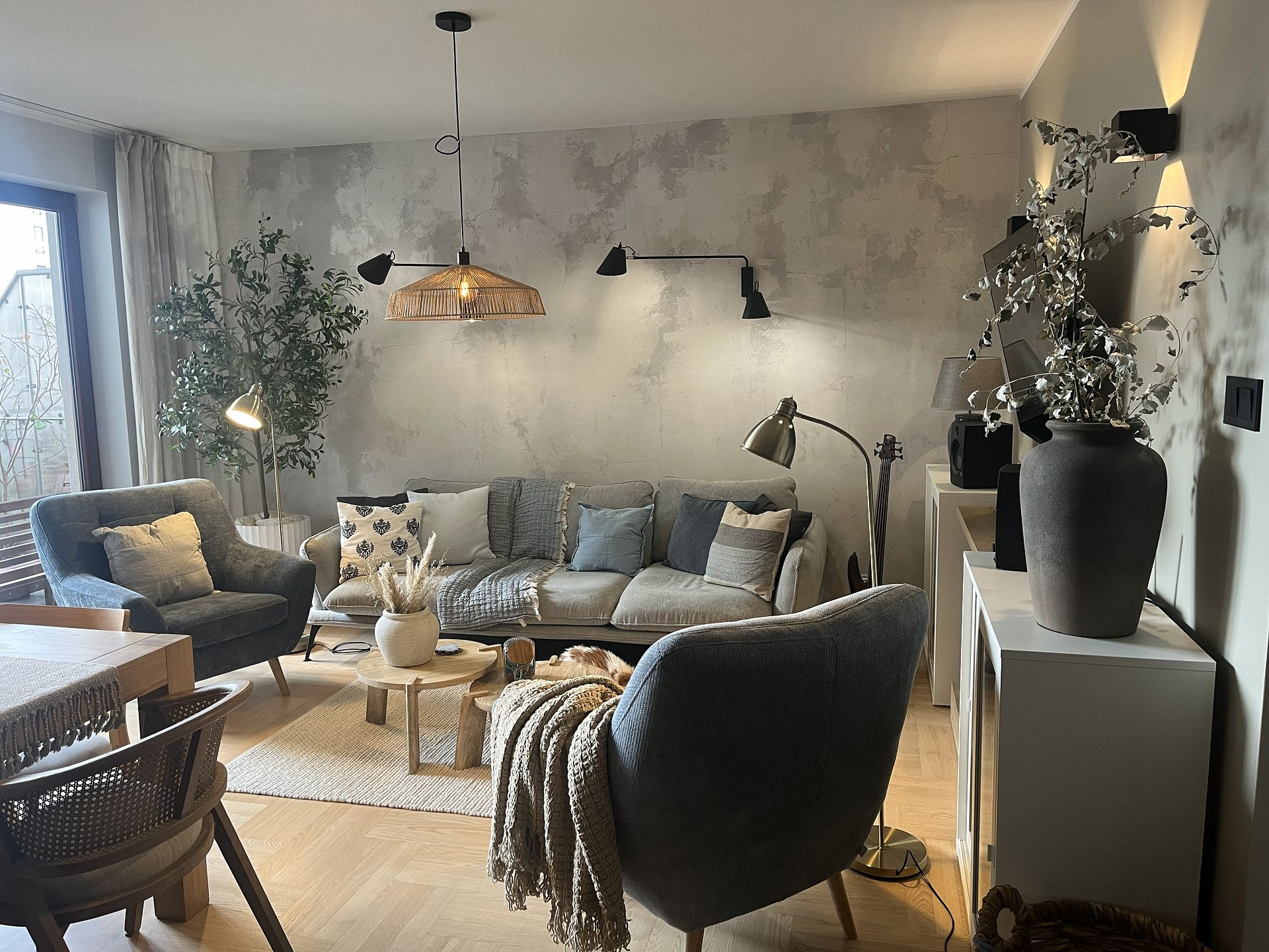 - przytulność zapewniła stonowana paleta kolorów inspirowana plażą Bałtycką. podłogi drewniane w przytłaczającym ciemnym pomarańczowo - czerwonym odcieniu zostały wycyklinowane i uzyskaliśmy naturalny neutralny odcień drewna