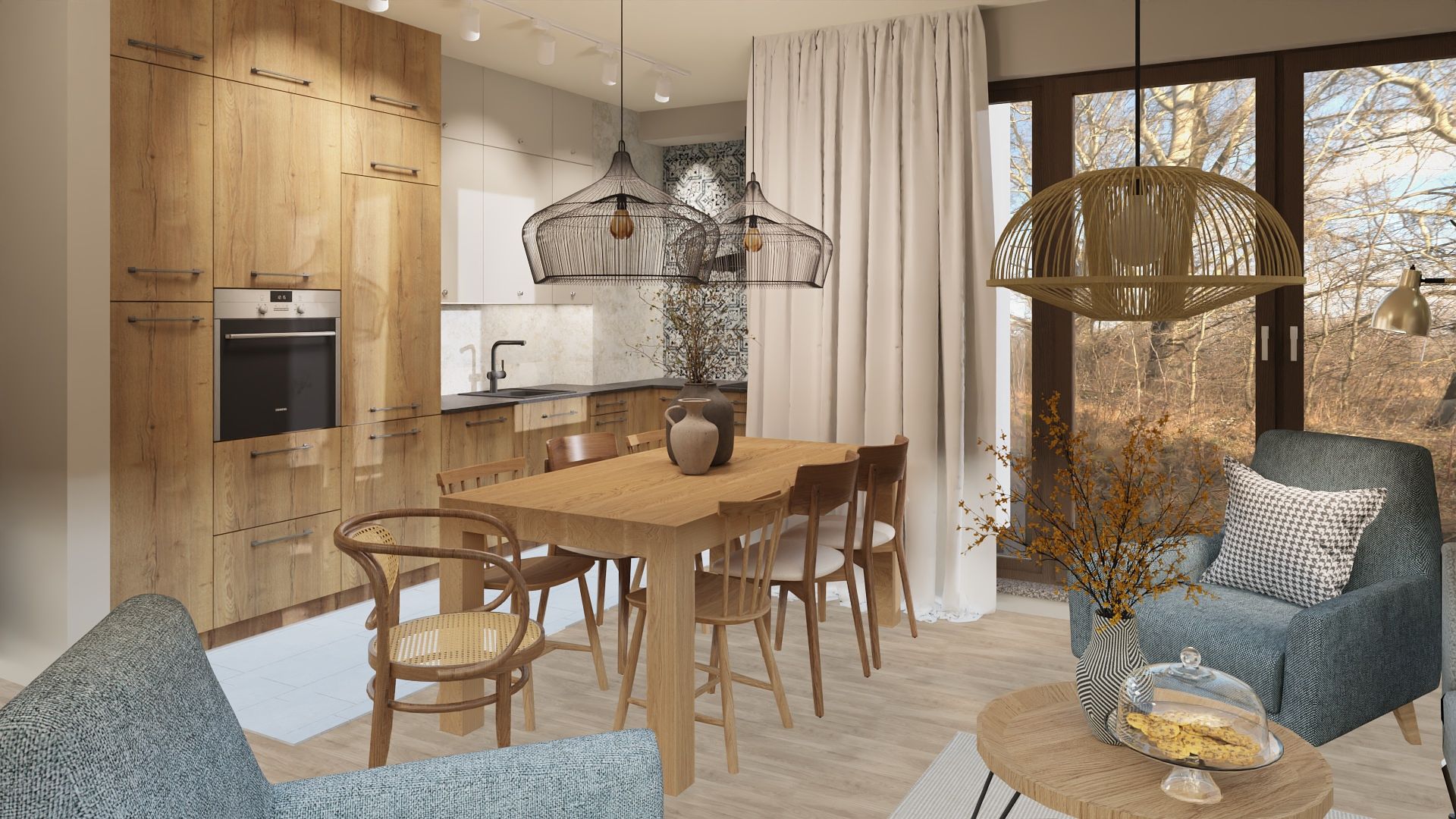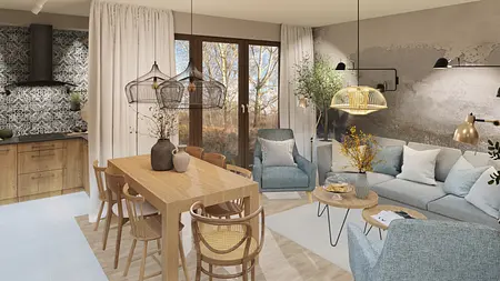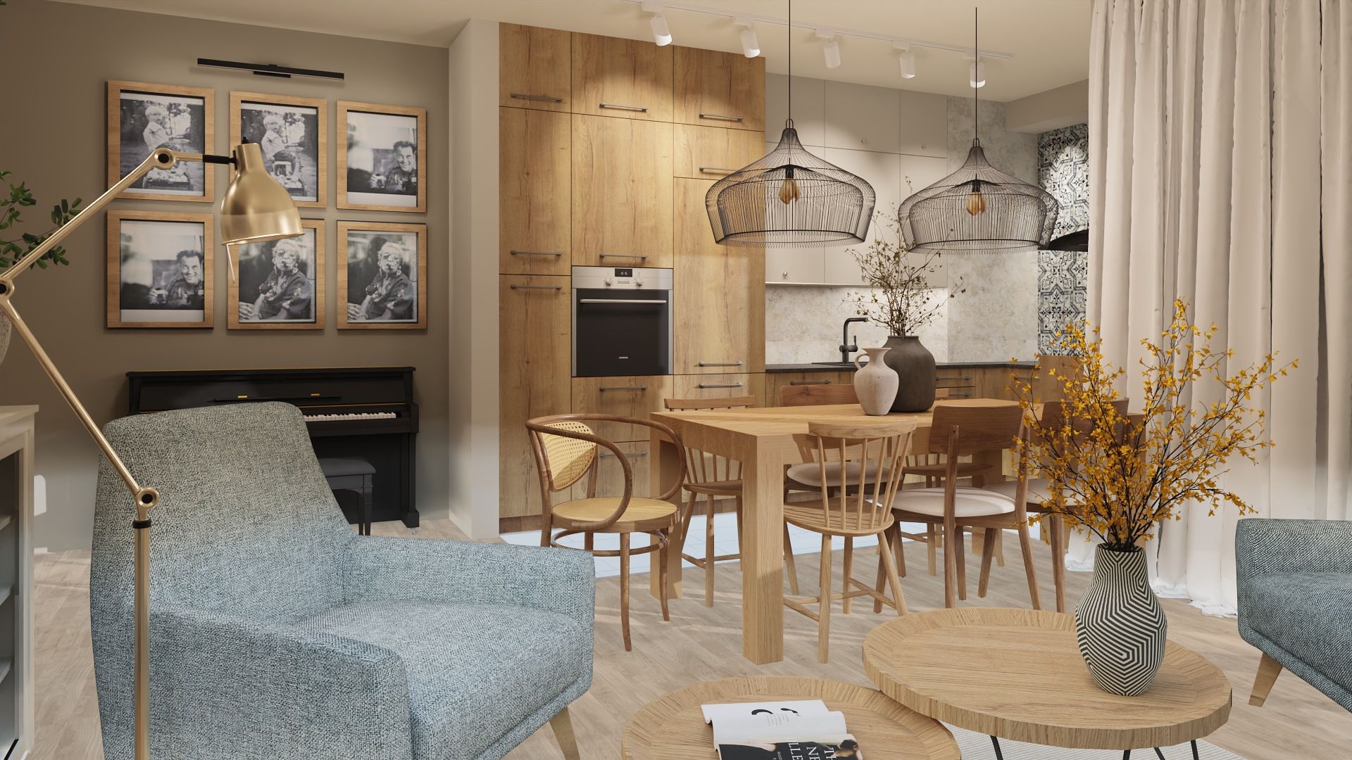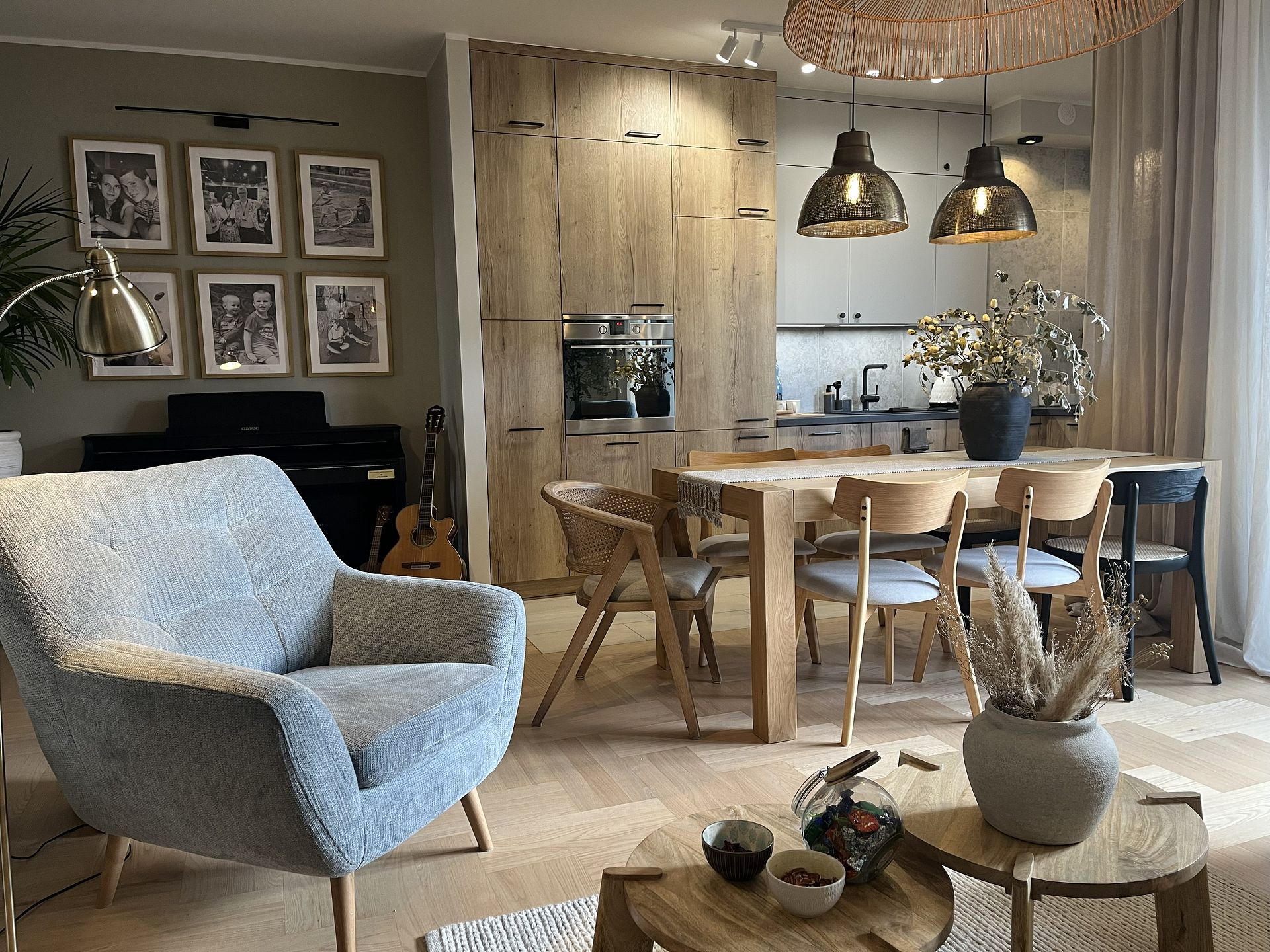 - wyzwaniem było połączenie kliku funkcji: salonu, jadalni, kuchni, kącika muzycznego w jednej niewielkiej przestrzeni mieszkania w bloku;