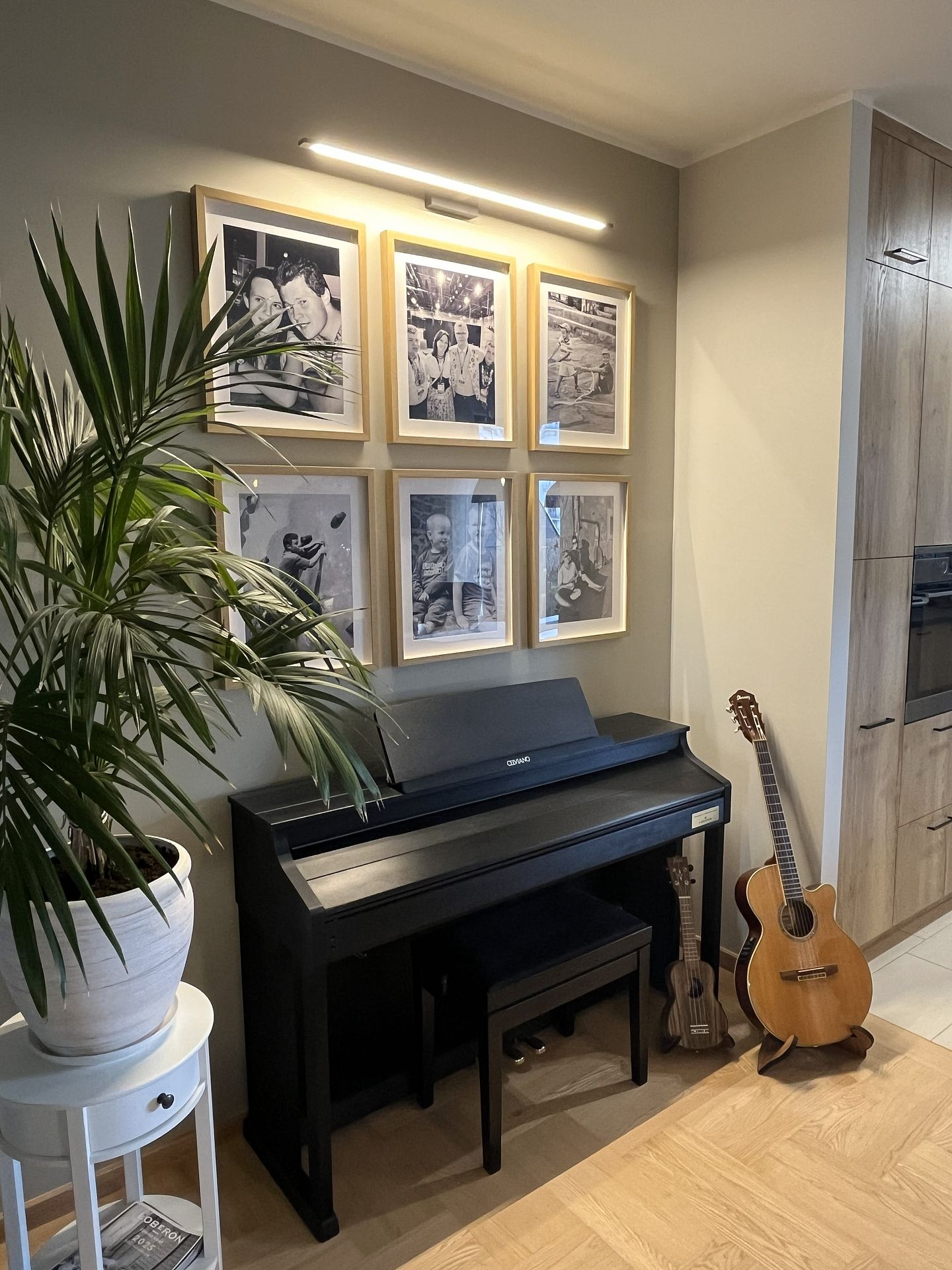 - kącik muzyczny zaprojektowany z galerią czarno - białych zdjęć rodzinnych