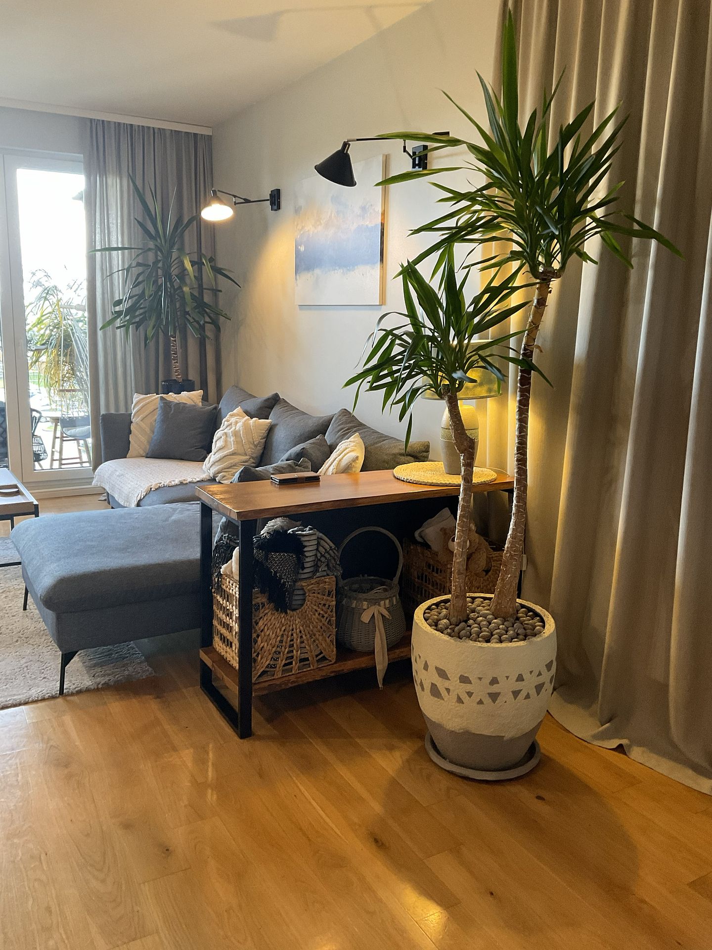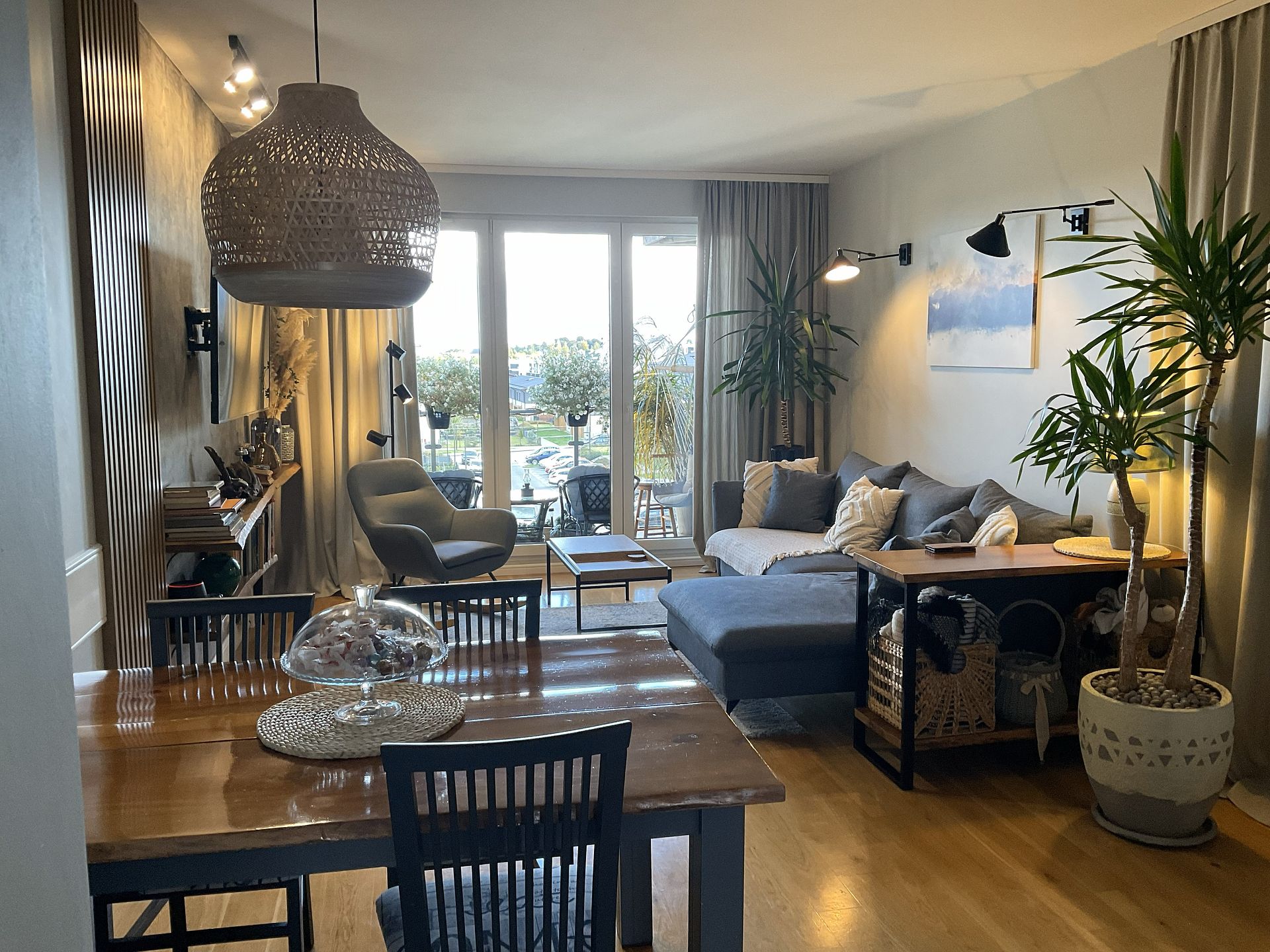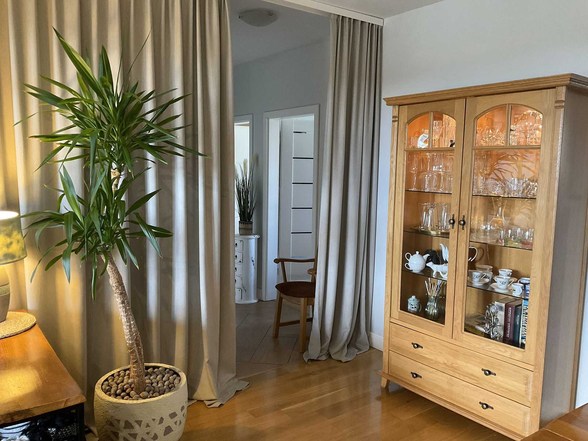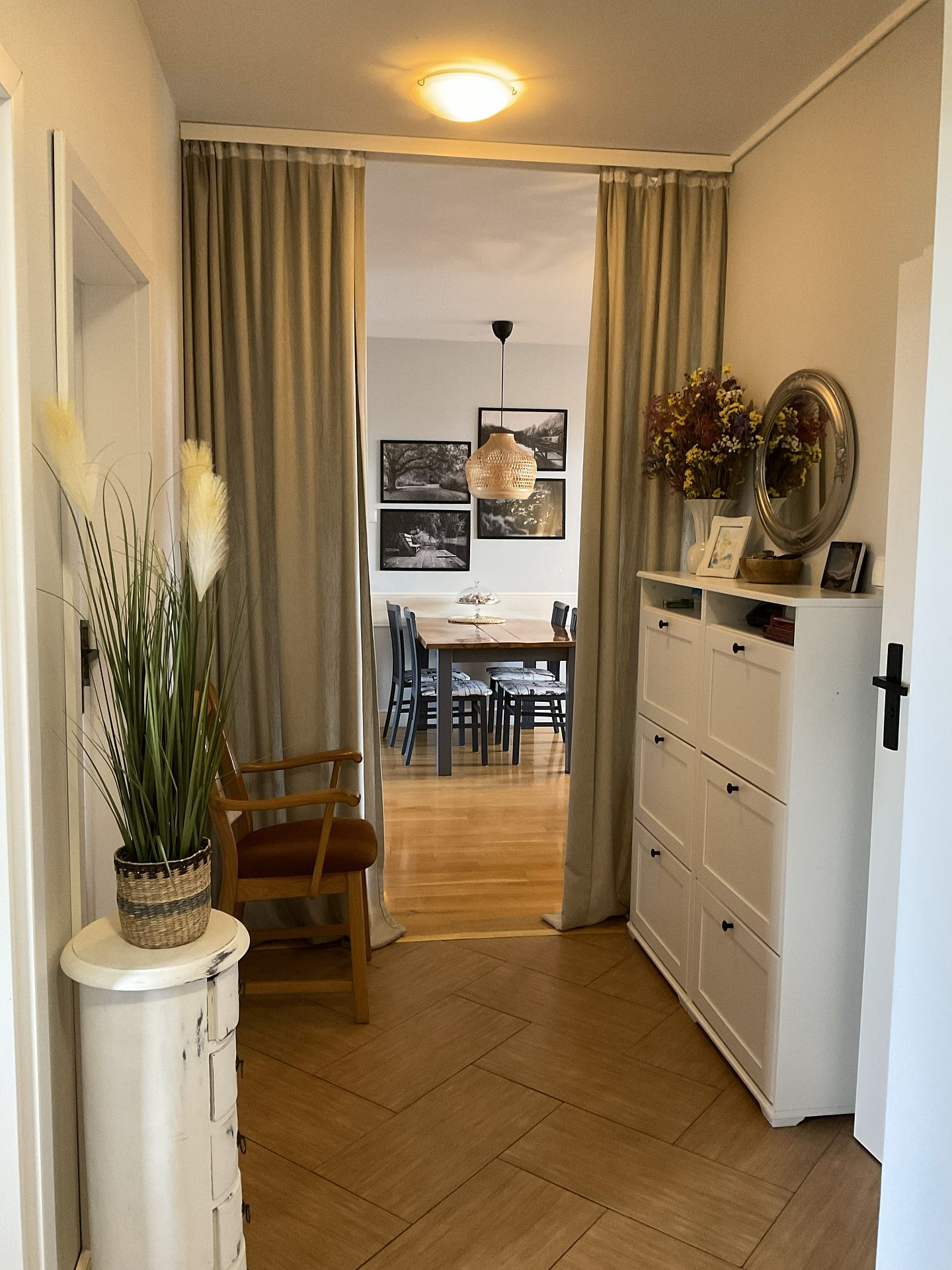 - ważną rolę pełni kotara, która zdobi okno ale także oddziela wizualnie strefę wejściową , korytarz od jadalni i części salonowej