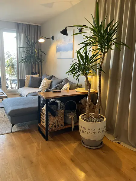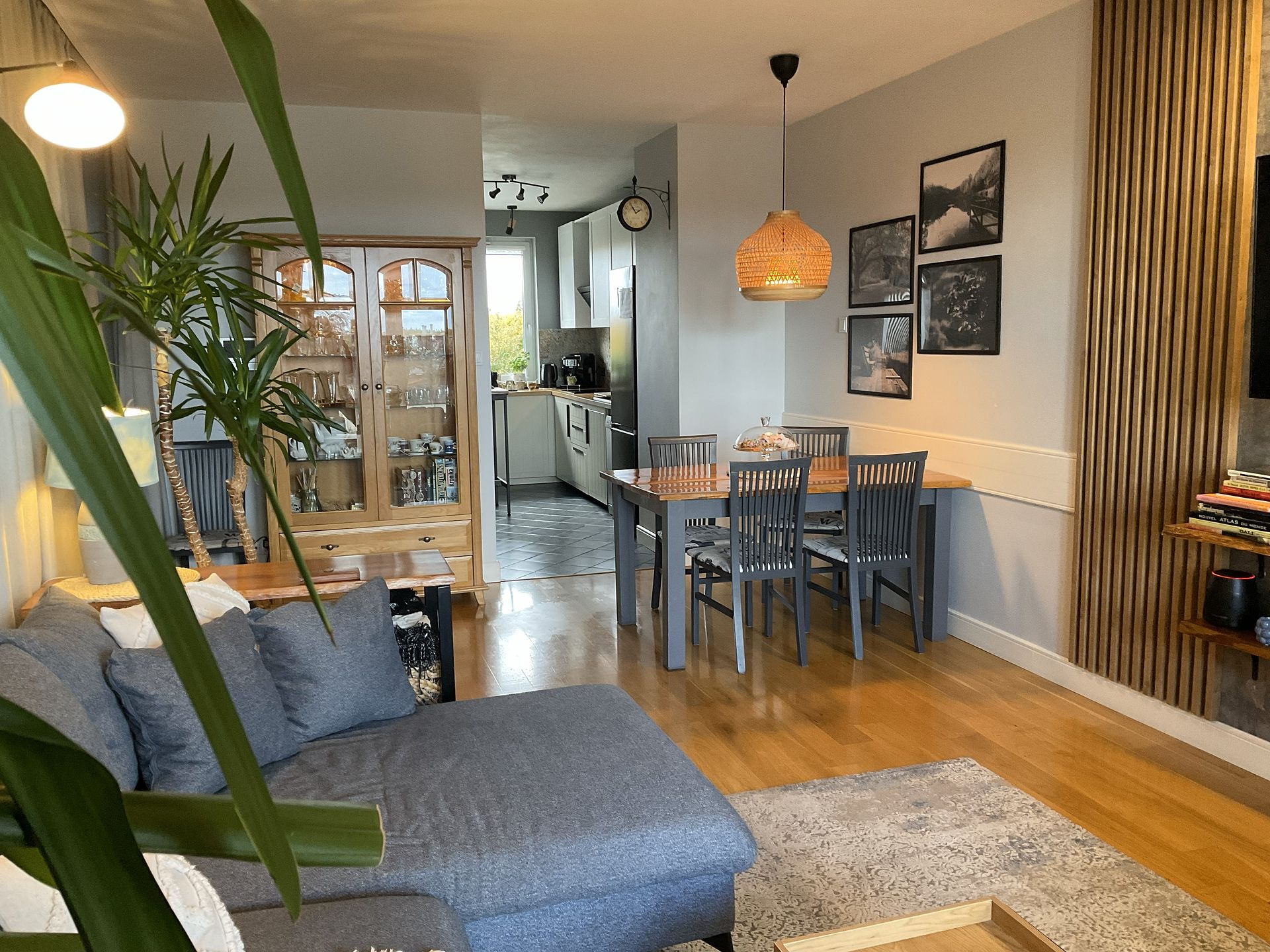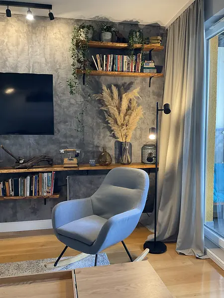 - dobrano kolorystykę ścian , mebli tapicerowanych w świeżych błękitach, granacie, a to wszystko w towarzystwie drewna.