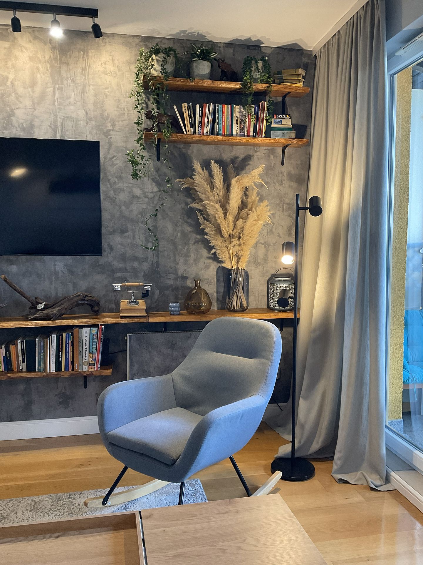 - wydzielono strefę jadalni i salonu za pomocą oświetlenia i podziału ściany na część malowaną farbą i część z betonem dekoracyjnym