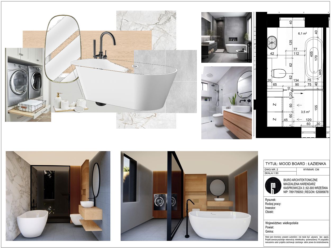 Projekt koncepcyjny łazienki z moadboardem, z zestawieniem listą elementów i kosztorysem.