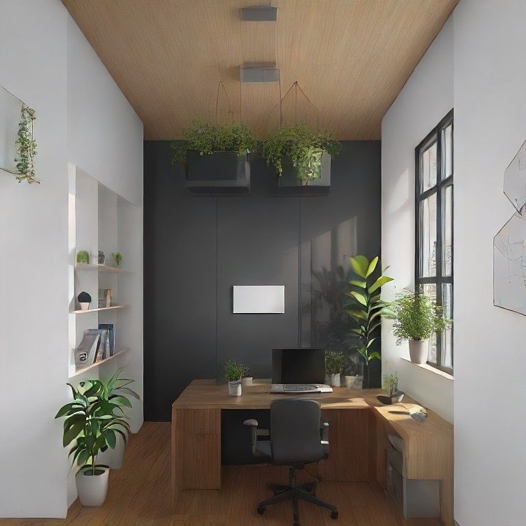 Biuro z drewnianym biurkiem, roślinami i szarymi ścianami w stylu vintage. 5 zdjęć w projekcie Zobacz projekt