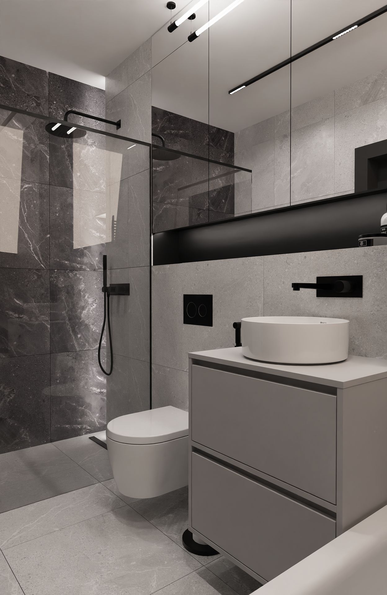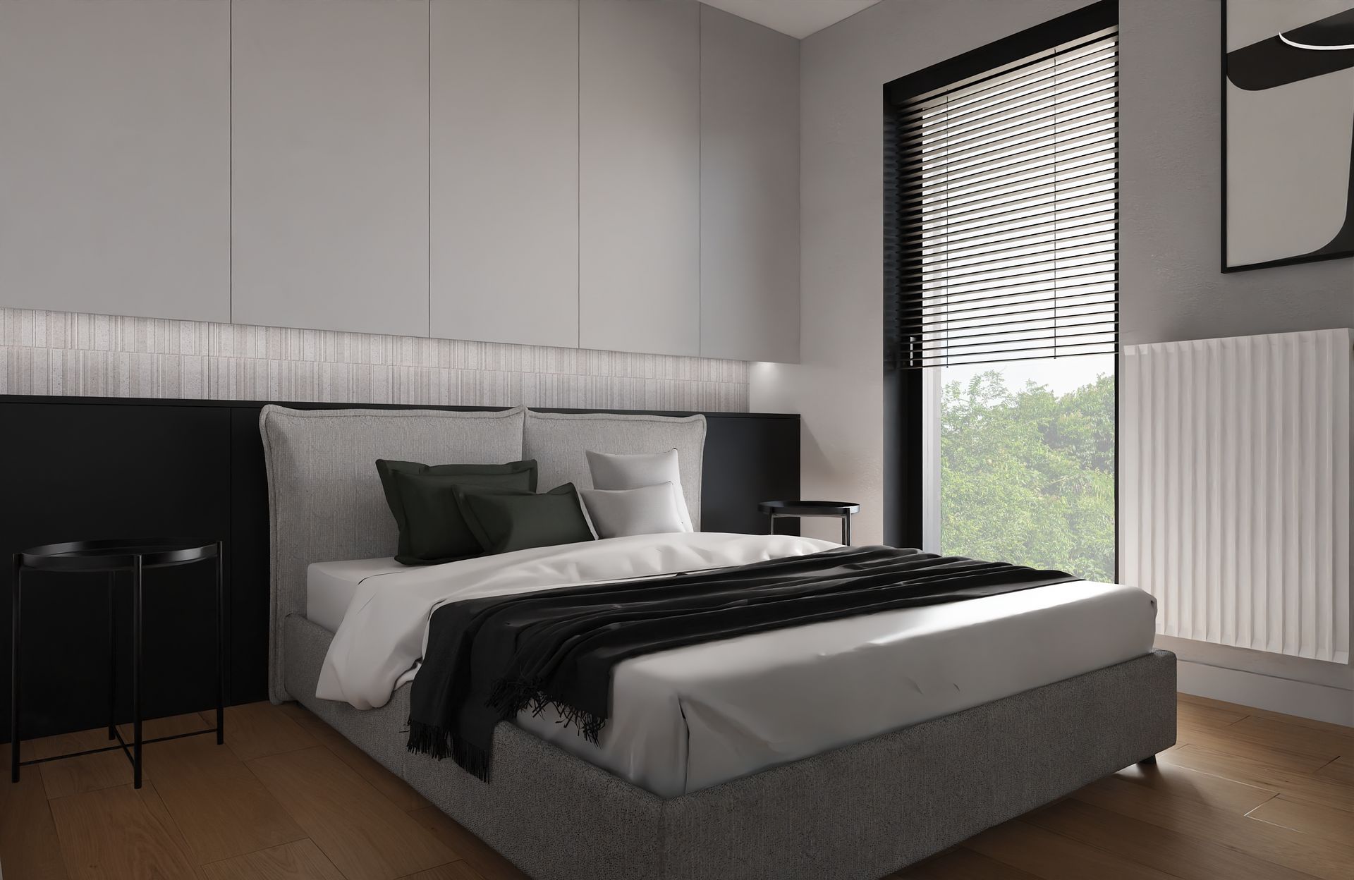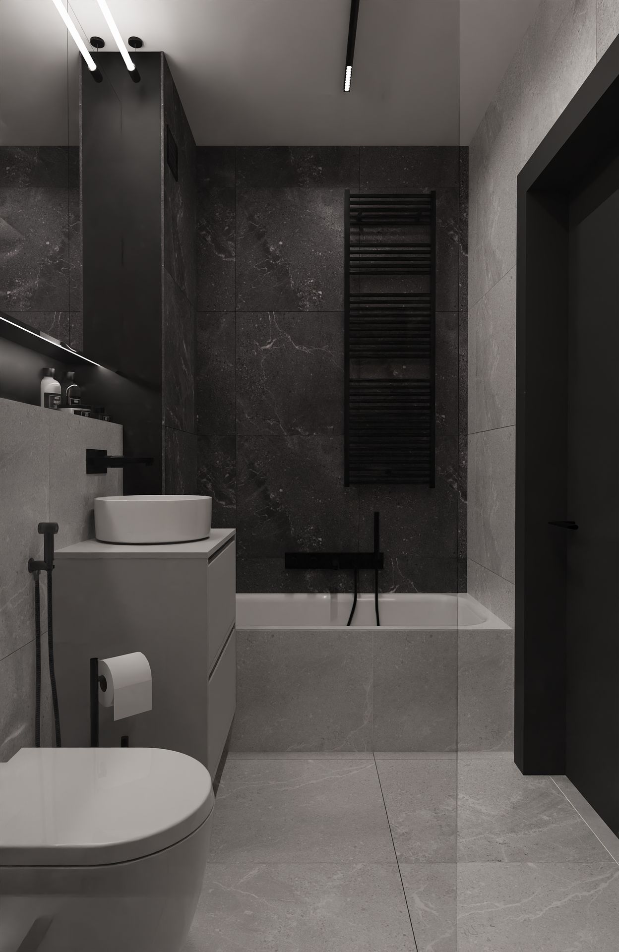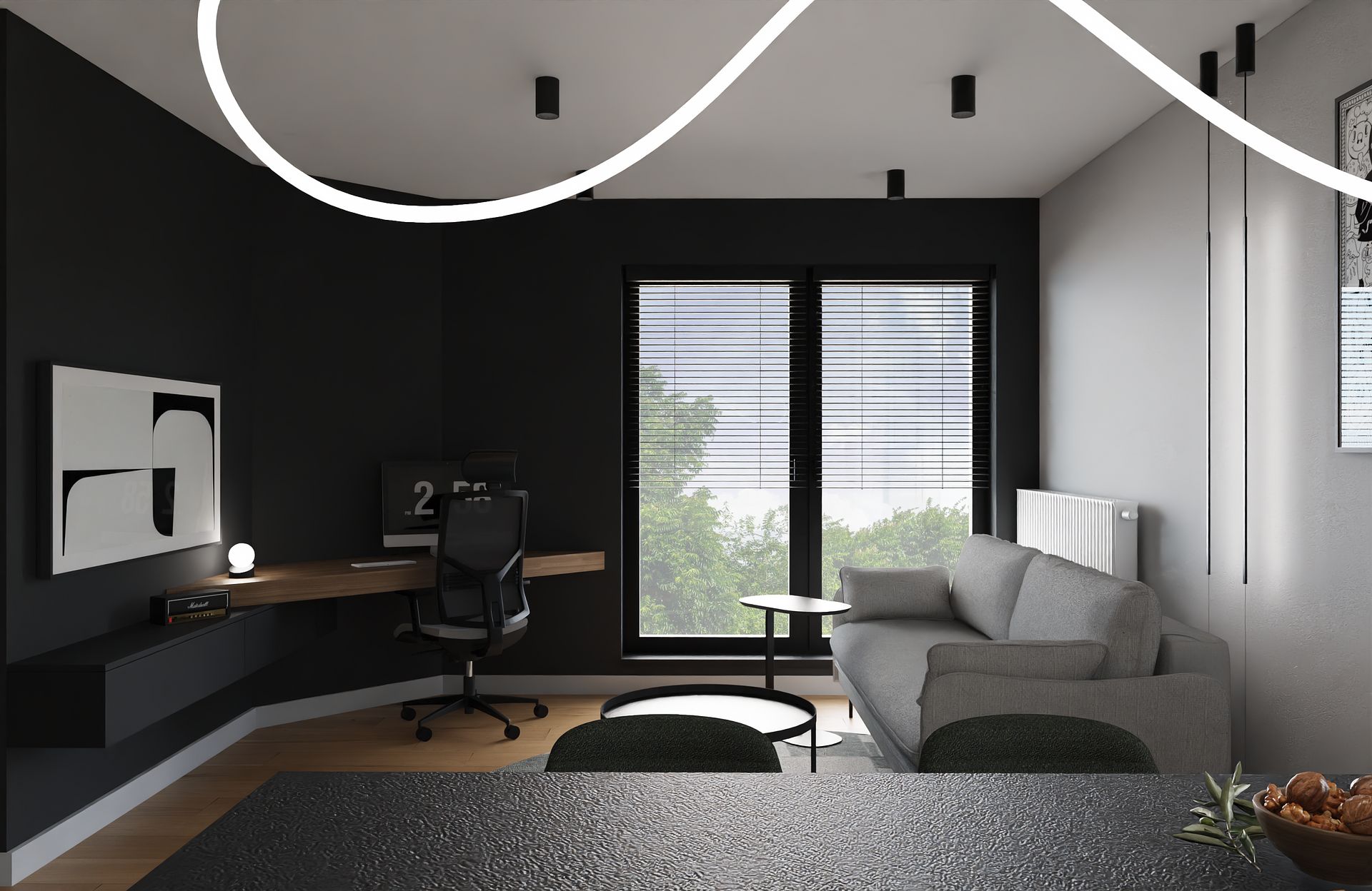 Ten projekt to esencja tego, co kocham w nowoczesnych wnętrzach, prostota, spójność i odrobina charakteru. Stworzyłam przestrzeń, w której chłodne odcienie szarości i czerni spotykają się z ciepłem drewna i delikatnym akcentem butelkowej zieleni.