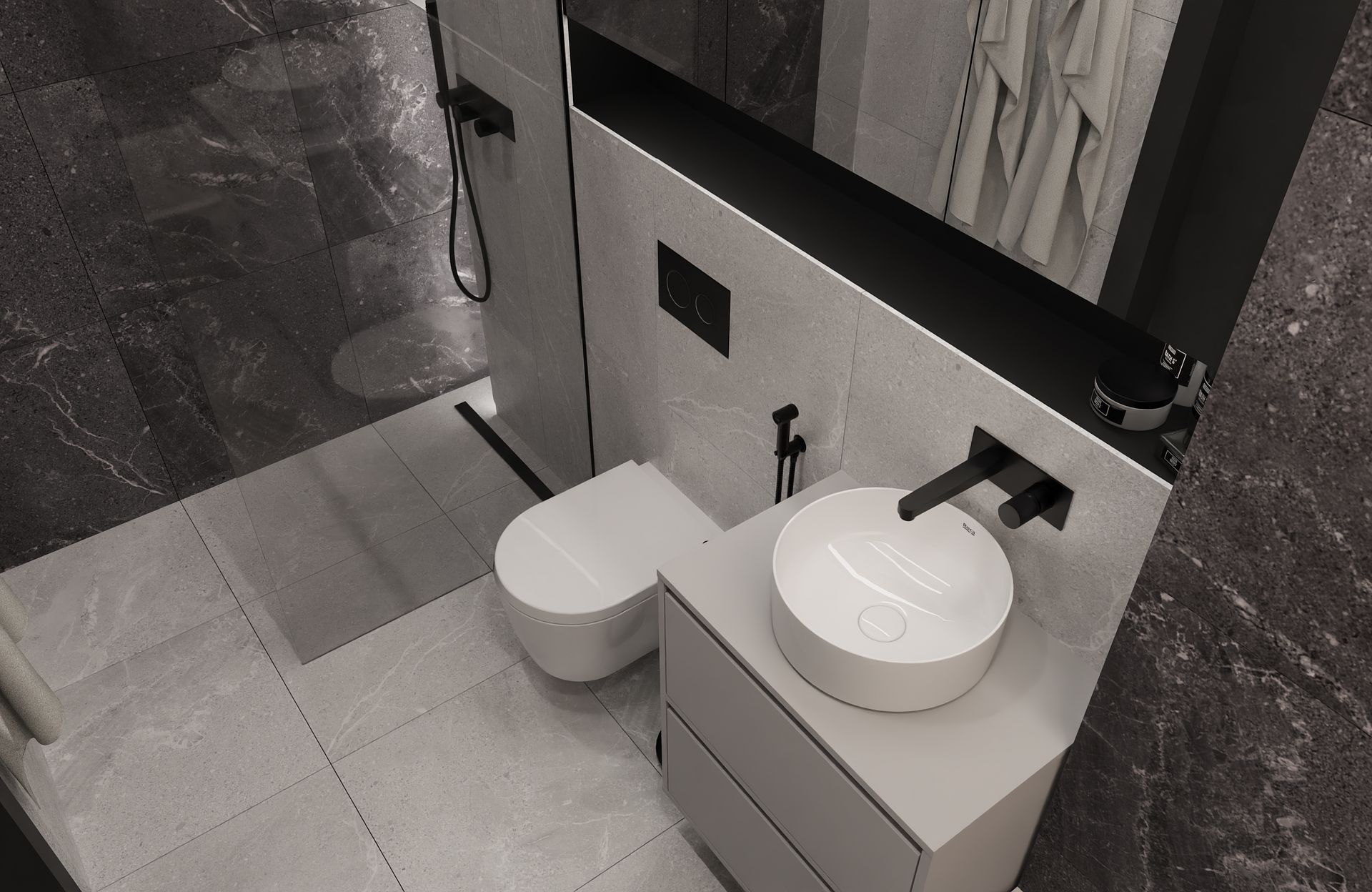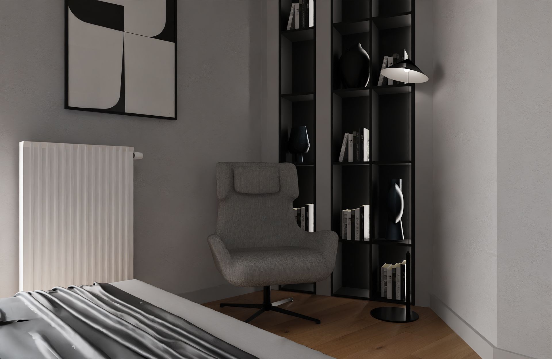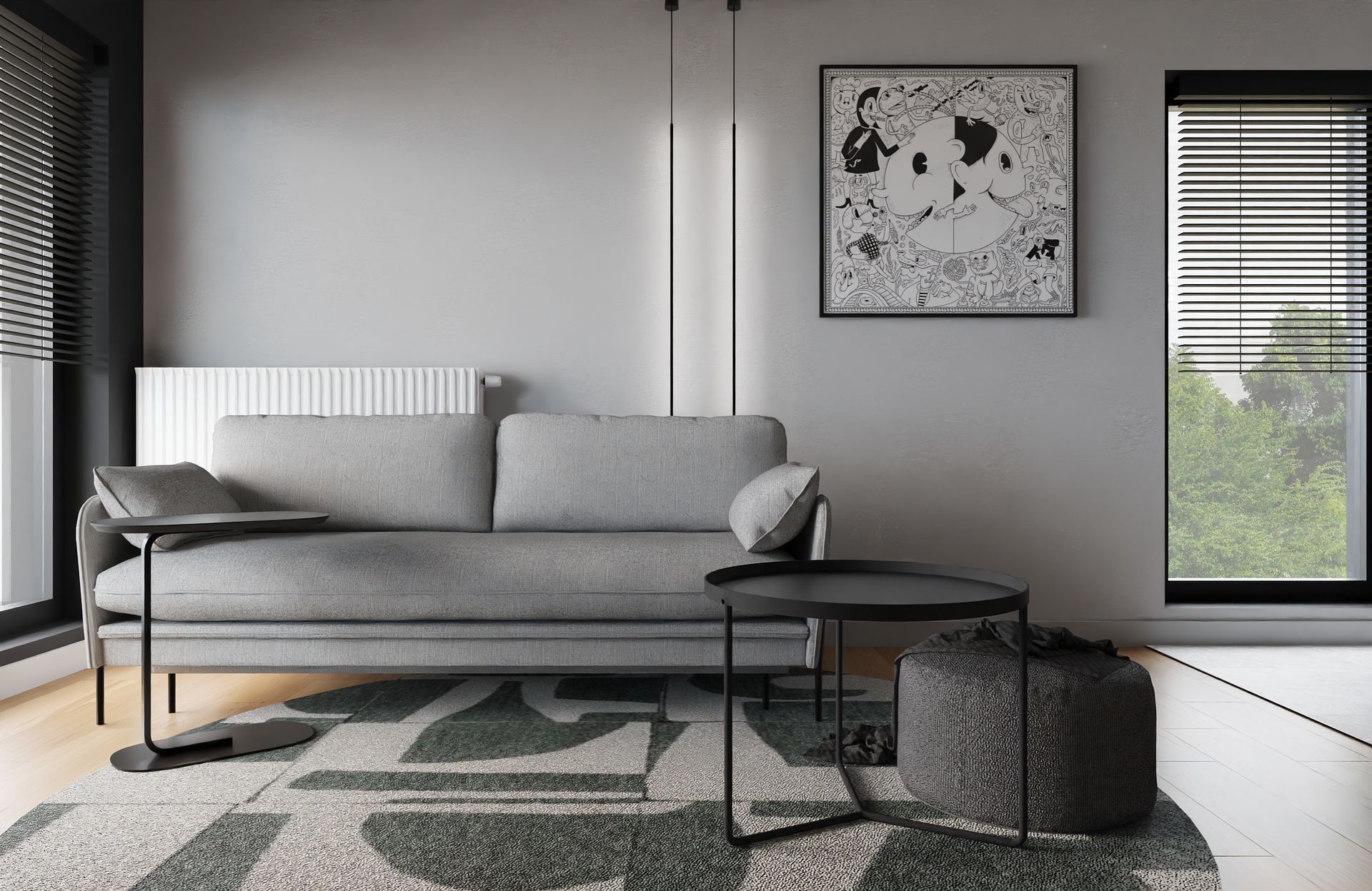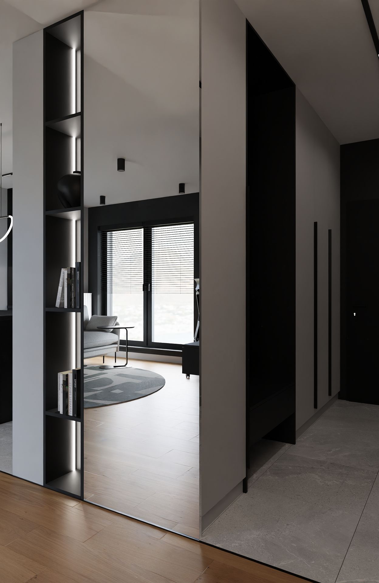 Ten projekt to esencja tego, co kocham w nowoczesnych wnętrzach, prostota, spójność i odrobina charakteru. Stworzyłam przestrzeń, w której chłodne odcienie szarości i czerni spotykają się z ciepłem drewna i delikatnym akcentem butelkowej zieleni.