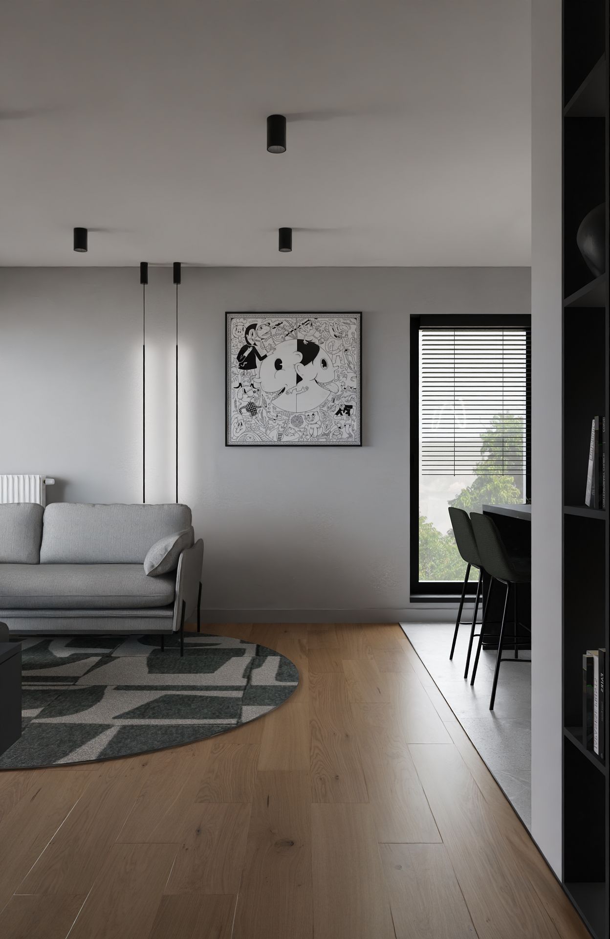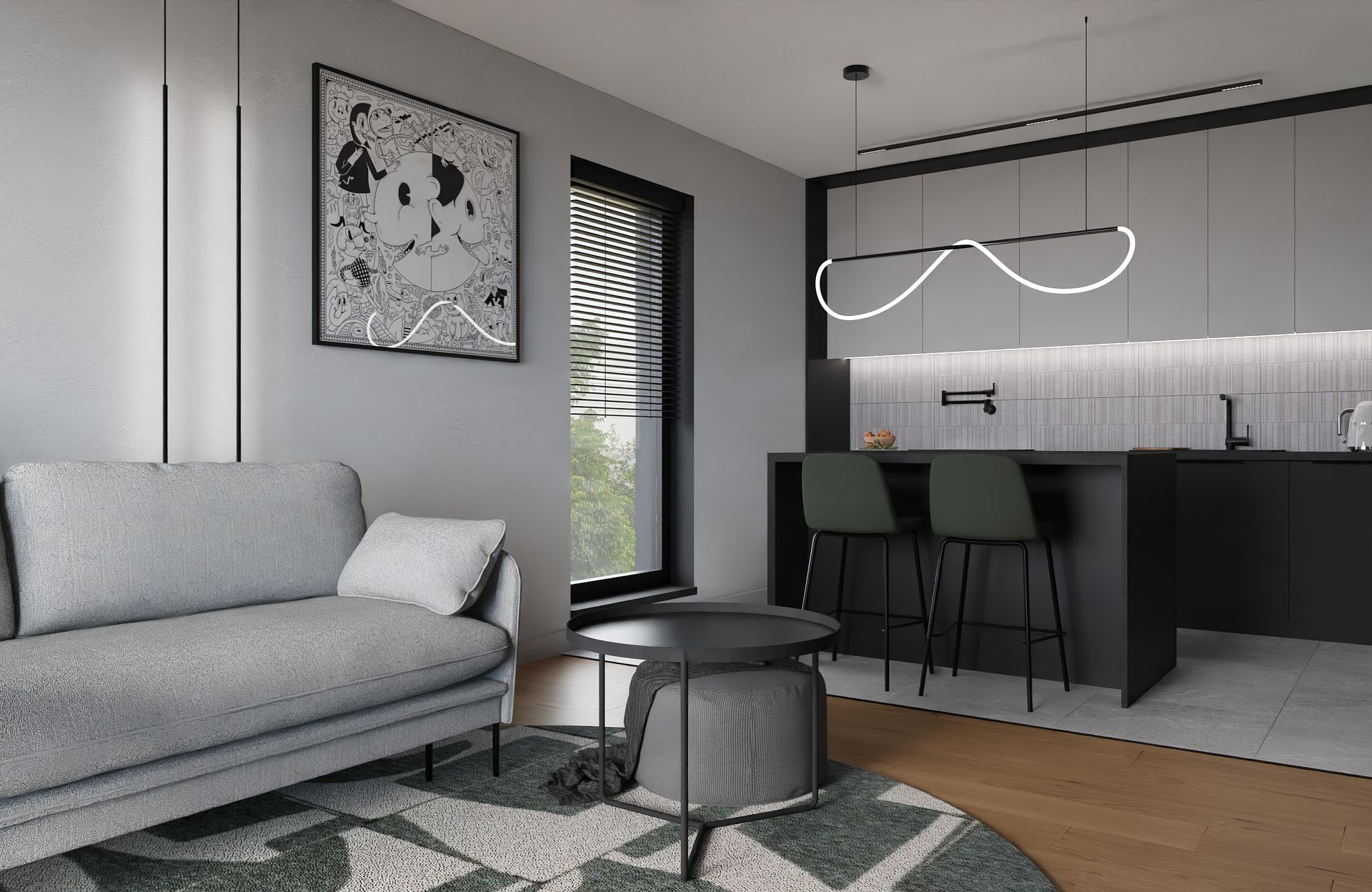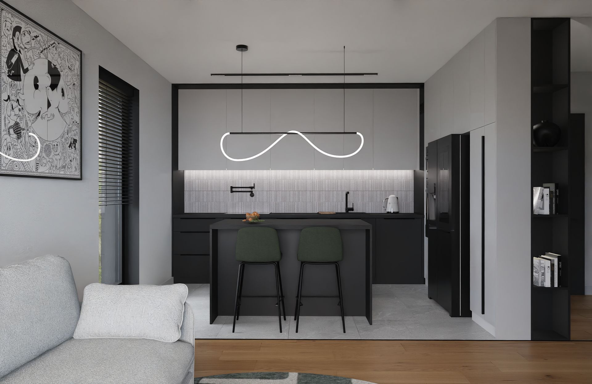 Salon z aneksem kuchennym to otwarta, lekka kompozycja, minimalistyczna, ale przytulna. Subtelne światło i geometryczne formy tworzą idealne tło do codzienności. Charakter wnętrza budują detale: rzeźbiarska lampa nad wyspą, grafika na ścianie i miękka tkanina sofy.