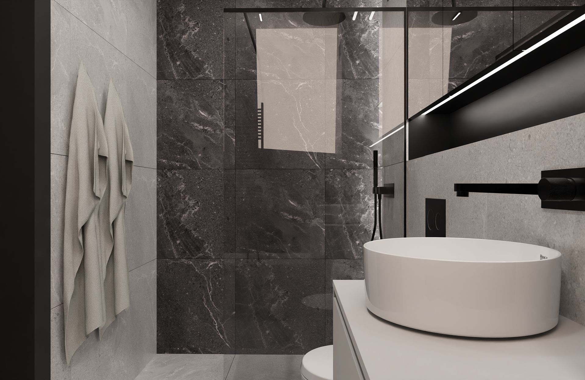 Sypialnia to spokojna oaza w jasnej tonacji, zintegrowane meble i tkaniny w naturalnych kolorach sprzyjają wyciszeniu. Z kolei łazienka, utrzymana w ciemnym kamieniu i bieli, ma w sobie elegancję hotelowego spa.