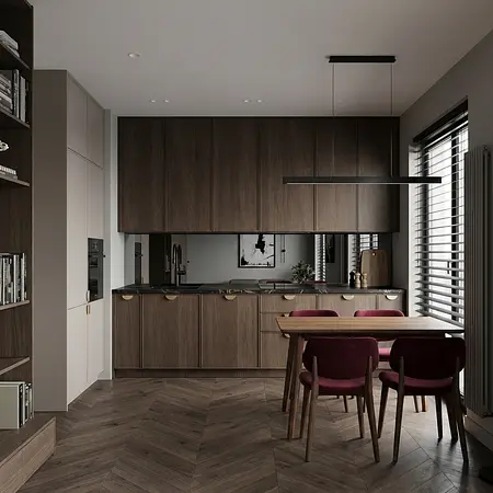 Wnętrze zaprojektowano w stylistyce nowoczesnej, minimalistycznej, z naciskiem na ponadczasowe materiały i stonowaną paletę barw. Część dzienna łączy kuchnię, jadalnię i salon w jedną spójną przestrzeń, co optycznie powiększa mieszkanie i poprawia jego ergonomię.