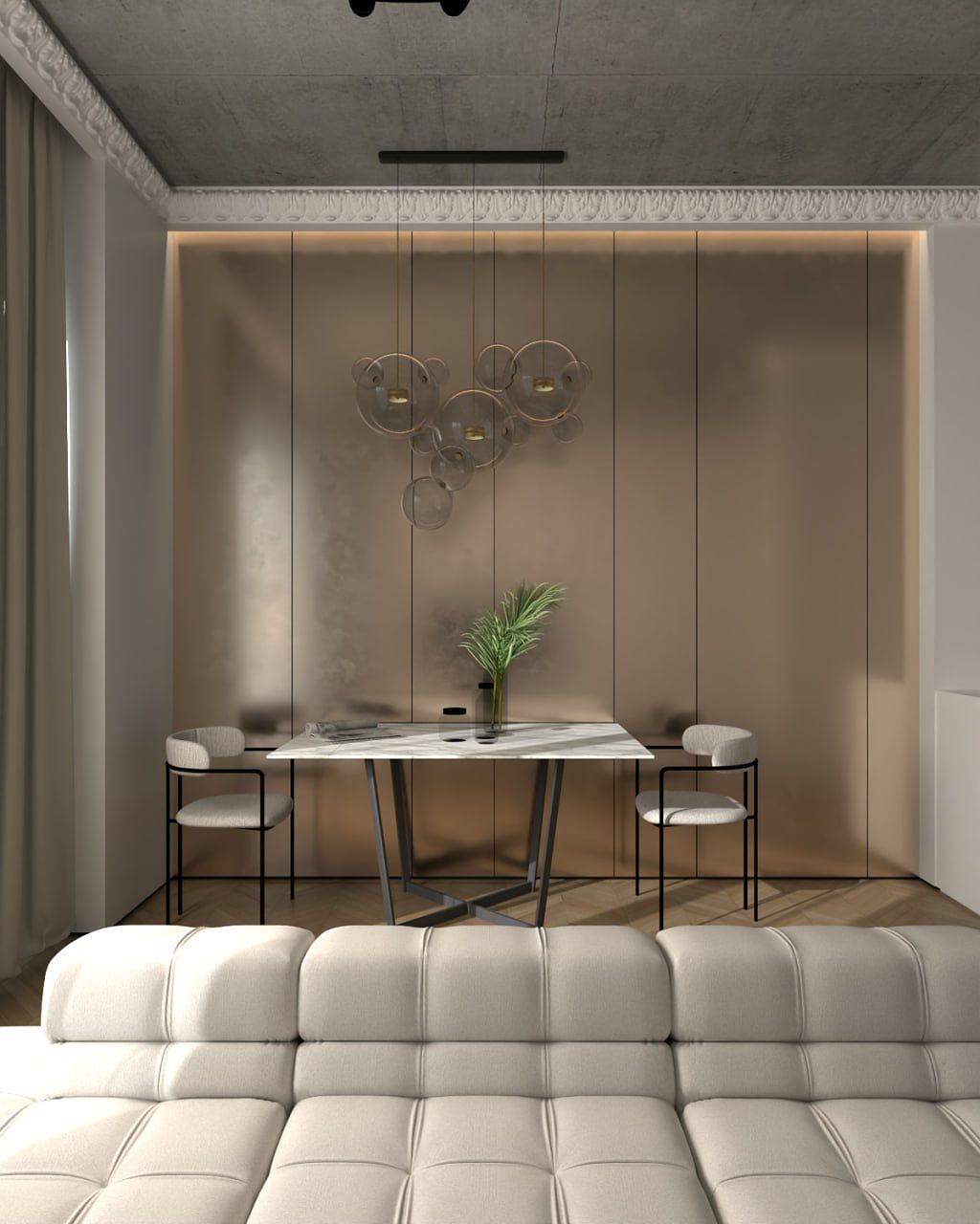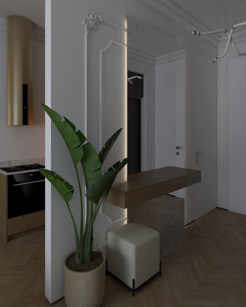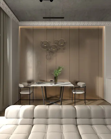 Nowoczesna klasyka z elementami loftu. Jasna, elegancka przestrzeń oparta na naturalnych materiałach, subtelnych detalach klasycznych i nowoczesnym oświetleniu. Projekt łączy komfort, funkcjonalność i ponadczasową estetykę.