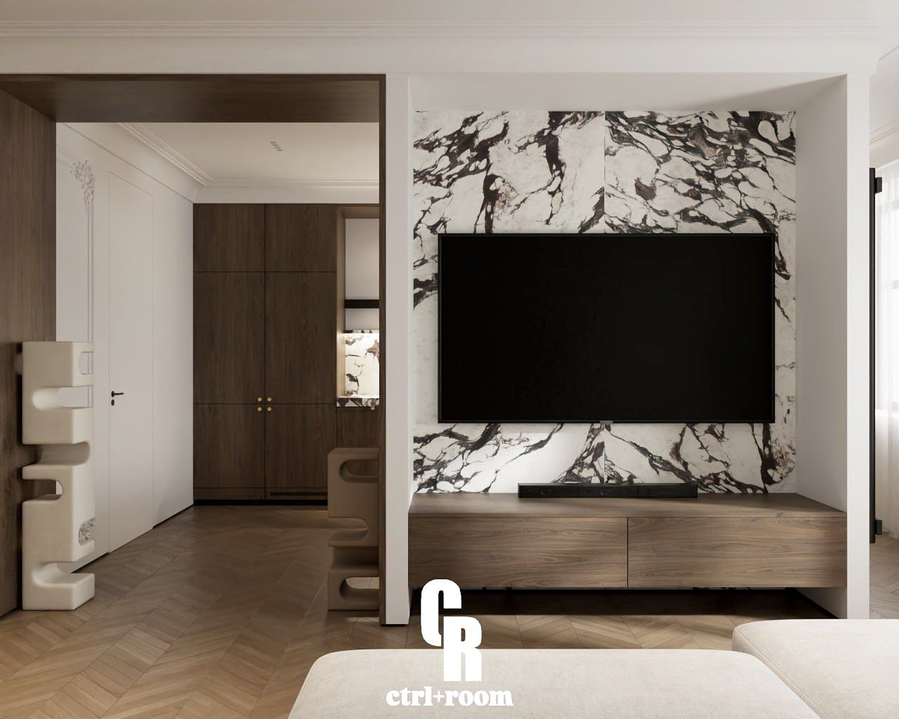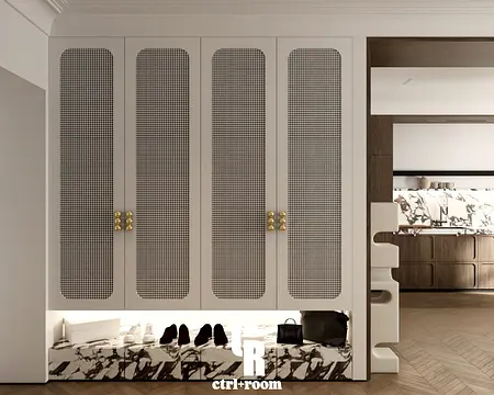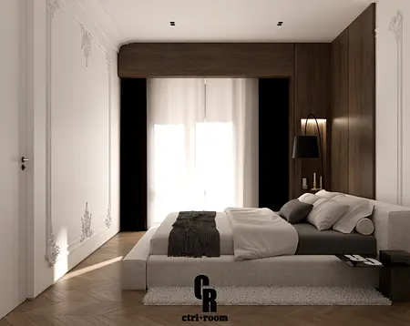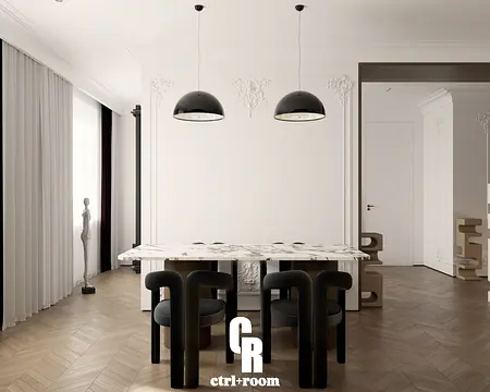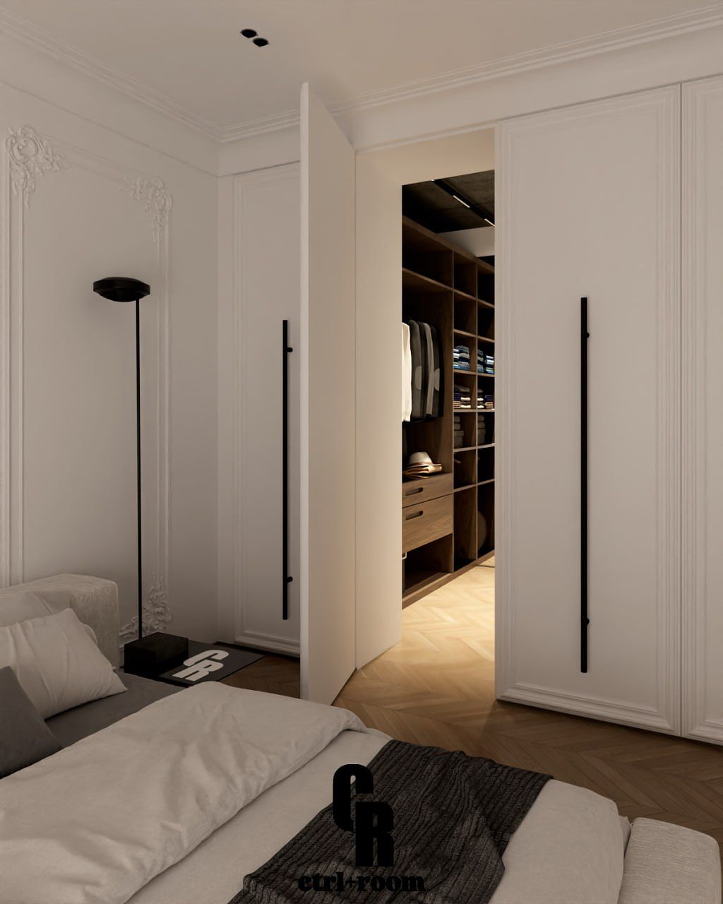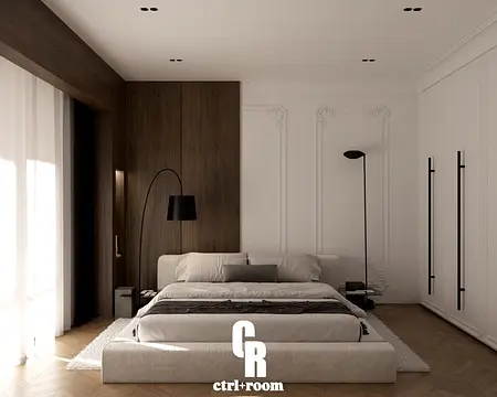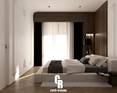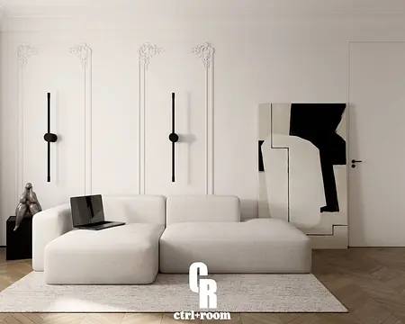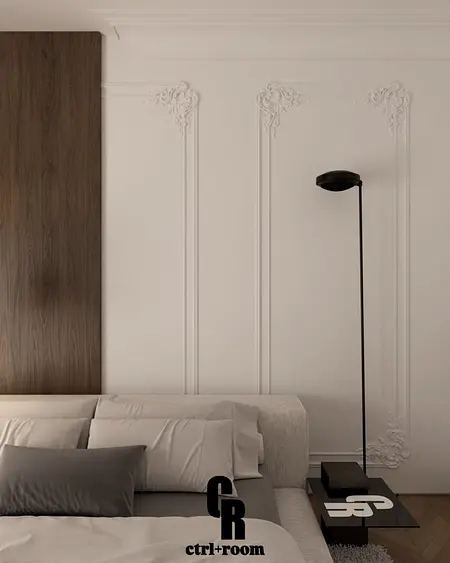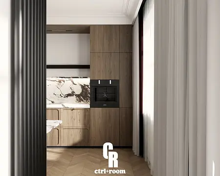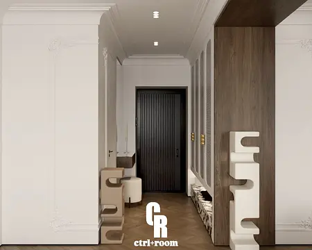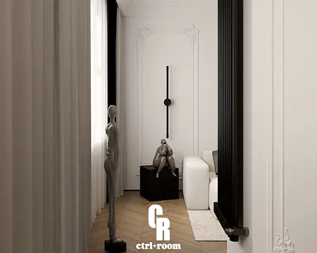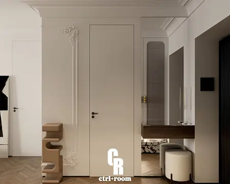 Projekt wnętrza w stylu soft modern classic, łączący klasyczne detale architektoniczne z nowoczesną, minimalistyczną formą zabudowy i mebli.