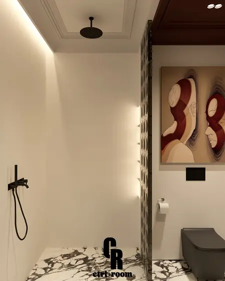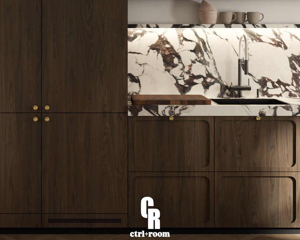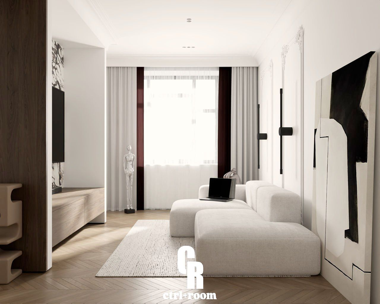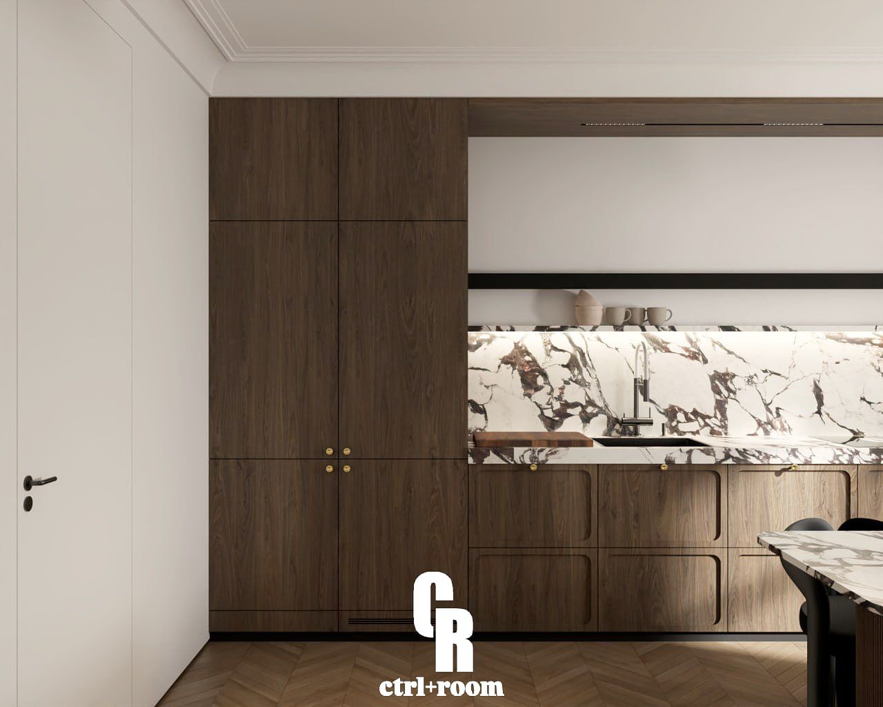 Projekt wnętrza w stylu soft modern classic, łączący klasyczne detale architektoniczne z nowoczesną, minimalistyczną formą zabudowy i mebli.