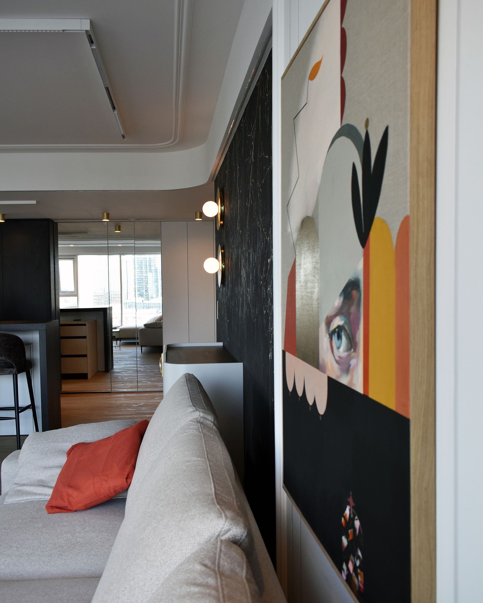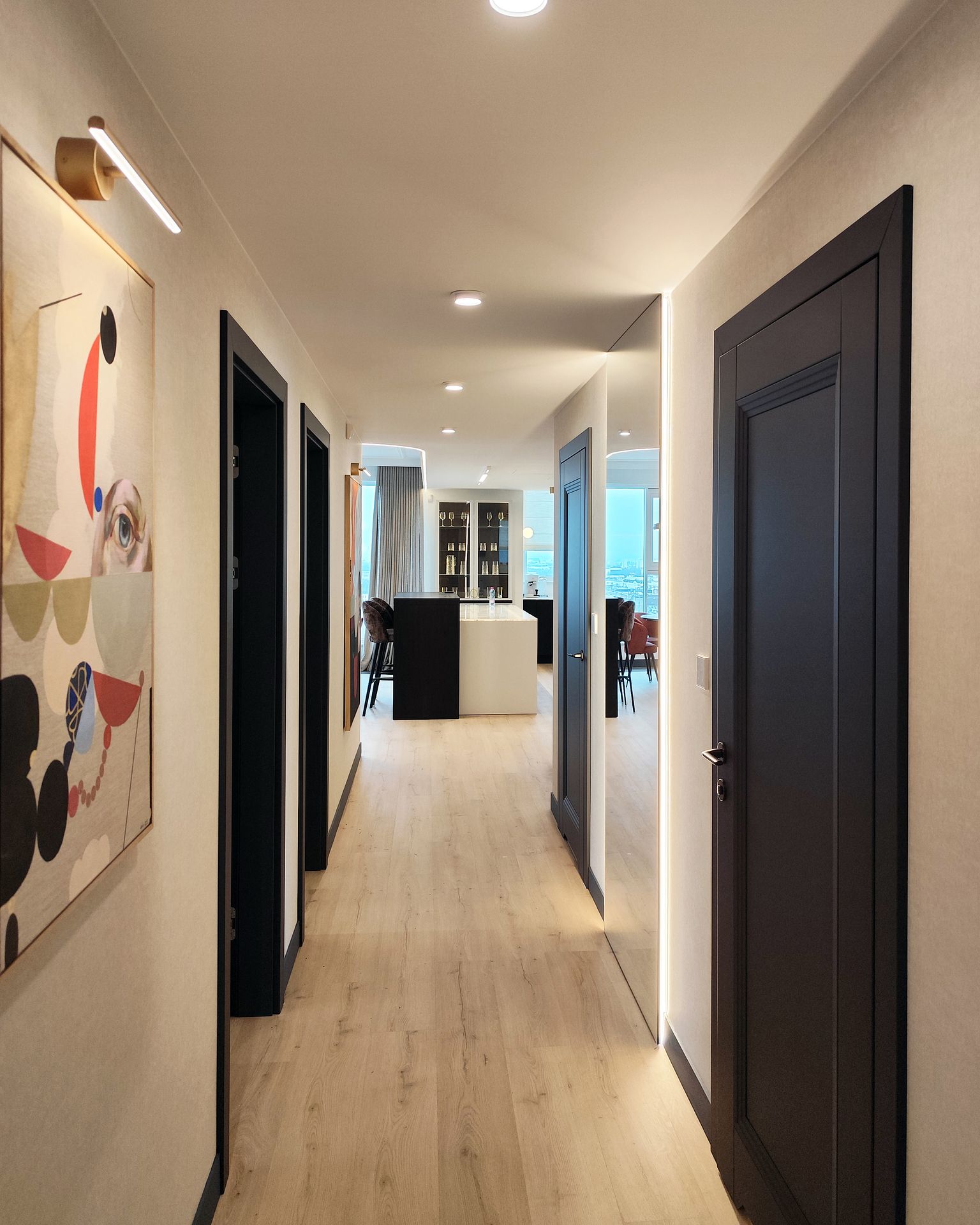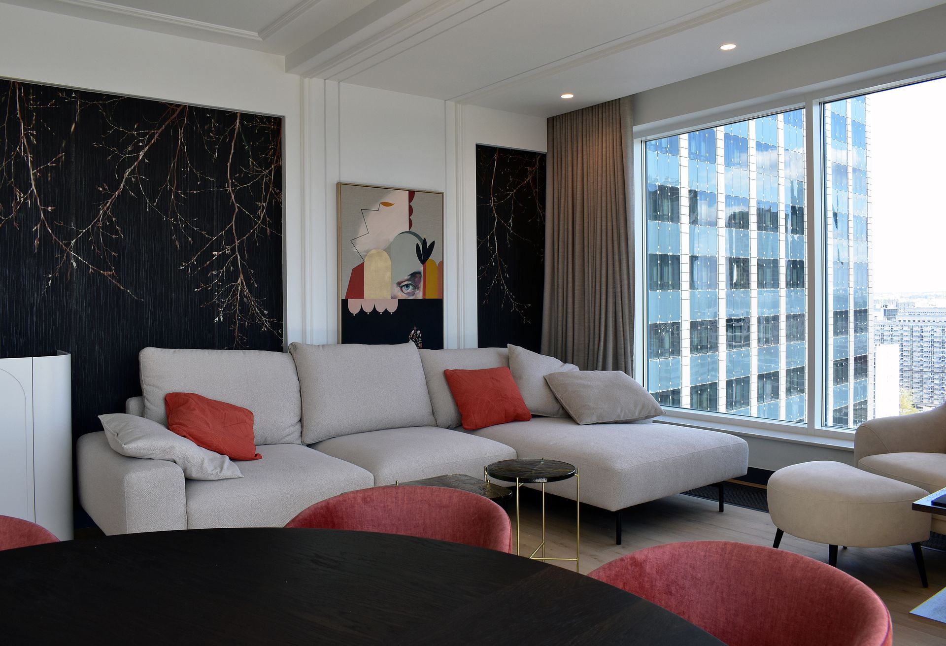 Mieszkanie potrzebowało pokazania poziomu Premium, ponieważ lokalizacja - to jeden z wieżowców w centrum Warszawy. Powierzchnia około 150m2 w czym dwie łazienki dwie sypialni gabinet salon z otwartą kuchnią. Wnętrze uzyskało niepowtarzalny charakter. Kontrasy i stylistyka nawiązują do nowoczesnych trendów i luksusu.