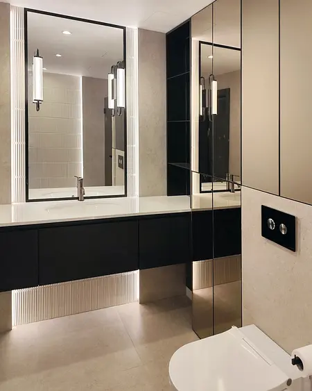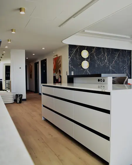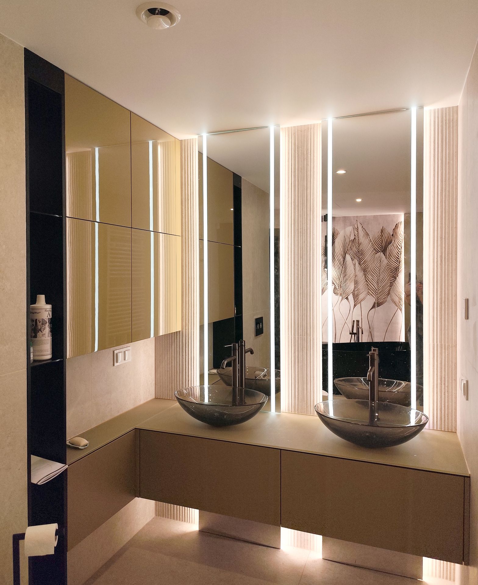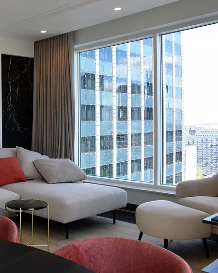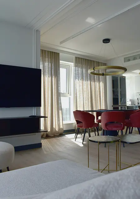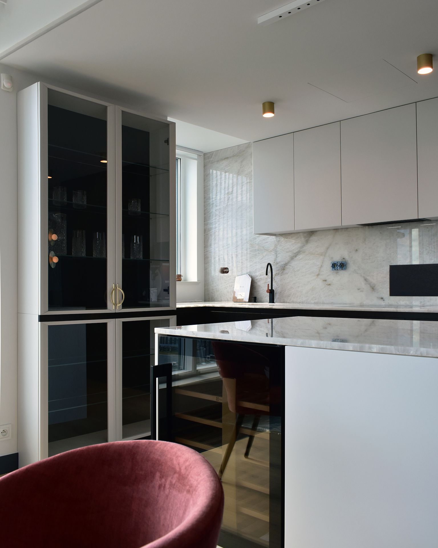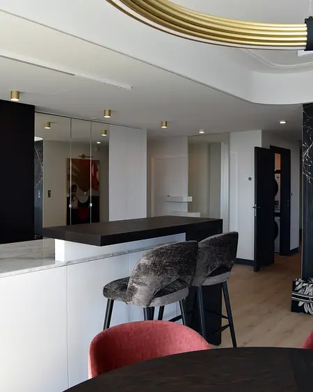 Mieszkanie potrzebowało pokazania poziomu Premium, ponieważ lokalizacja - to jeden z wieżowców w centrum Warszawy. Powierzchnia około 150m2 w czym dwie łazienki dwie sypialni gabinet salon z otwartą kuchnią. Wnętrze uzyskało niepowtarzalny charakter. Kontrasy i stylistyka nawiązują do nowoczesnych trendów i luksusu.