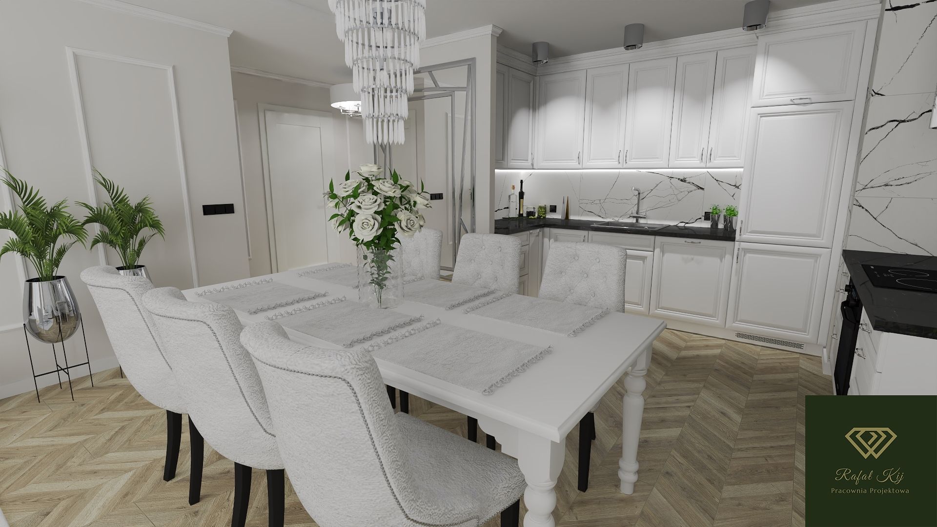 Jasna paleta barw, frezowane fronty, kryształowe lampy i naturalne drewno tworzą przestrzeń pełną światła i harmonii.
