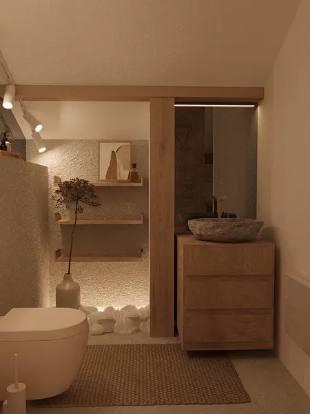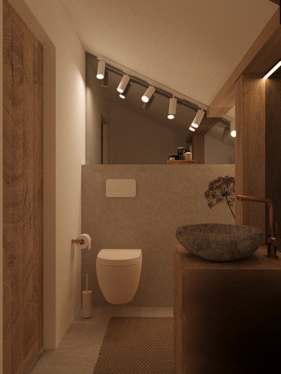 Ciemna łazienka z dużą ilością tekstur 3 zdjęć w projekcie Zobacz projekt
