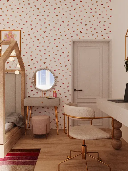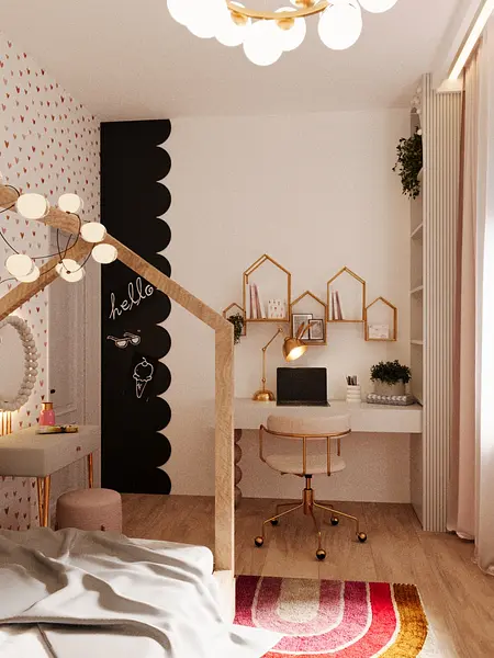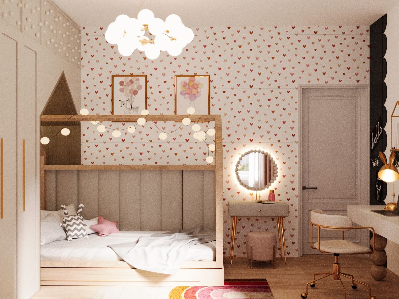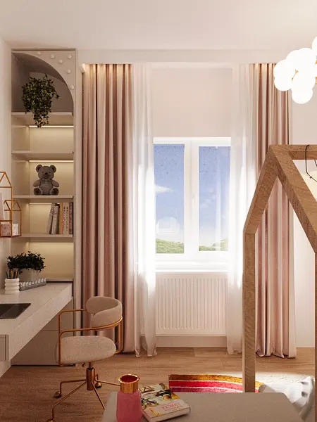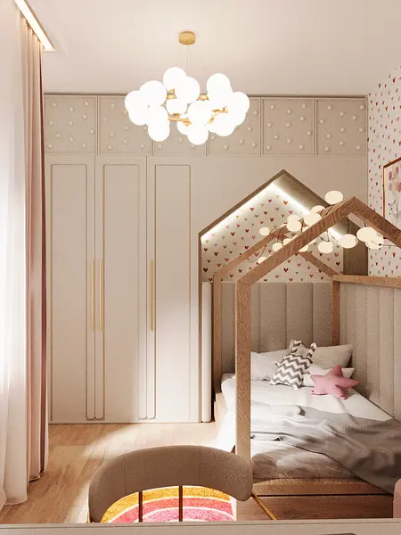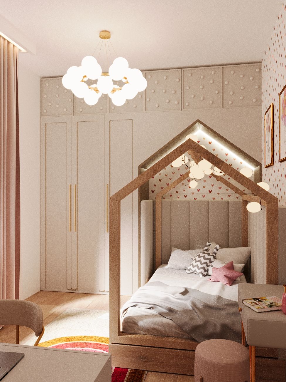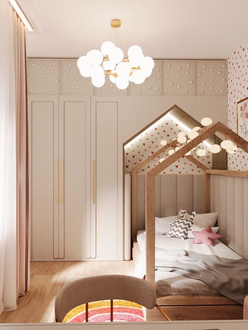 Projekt niewielkiego pokoju dla dziewczynki w inwestycji pod Poznaniem. Całość wykonana pod już zakupione przez inwestorów łóżko w kształcie domku. Inwestorom zależało na sporej zabudowie, efektu "porządku" oraz jasnych kolorach w pomieszczeniu.