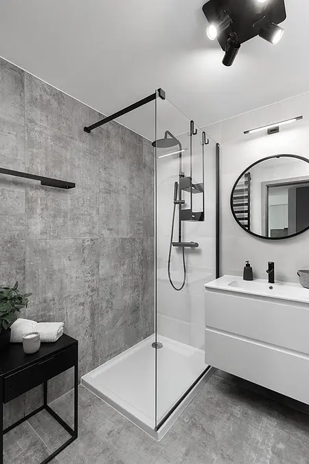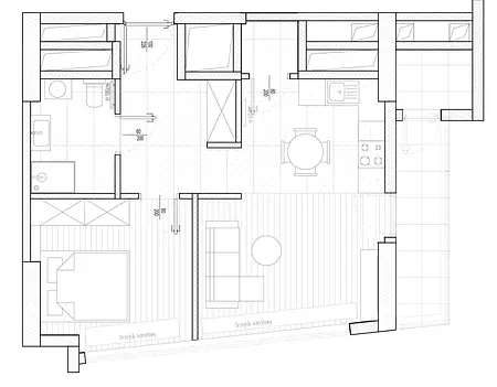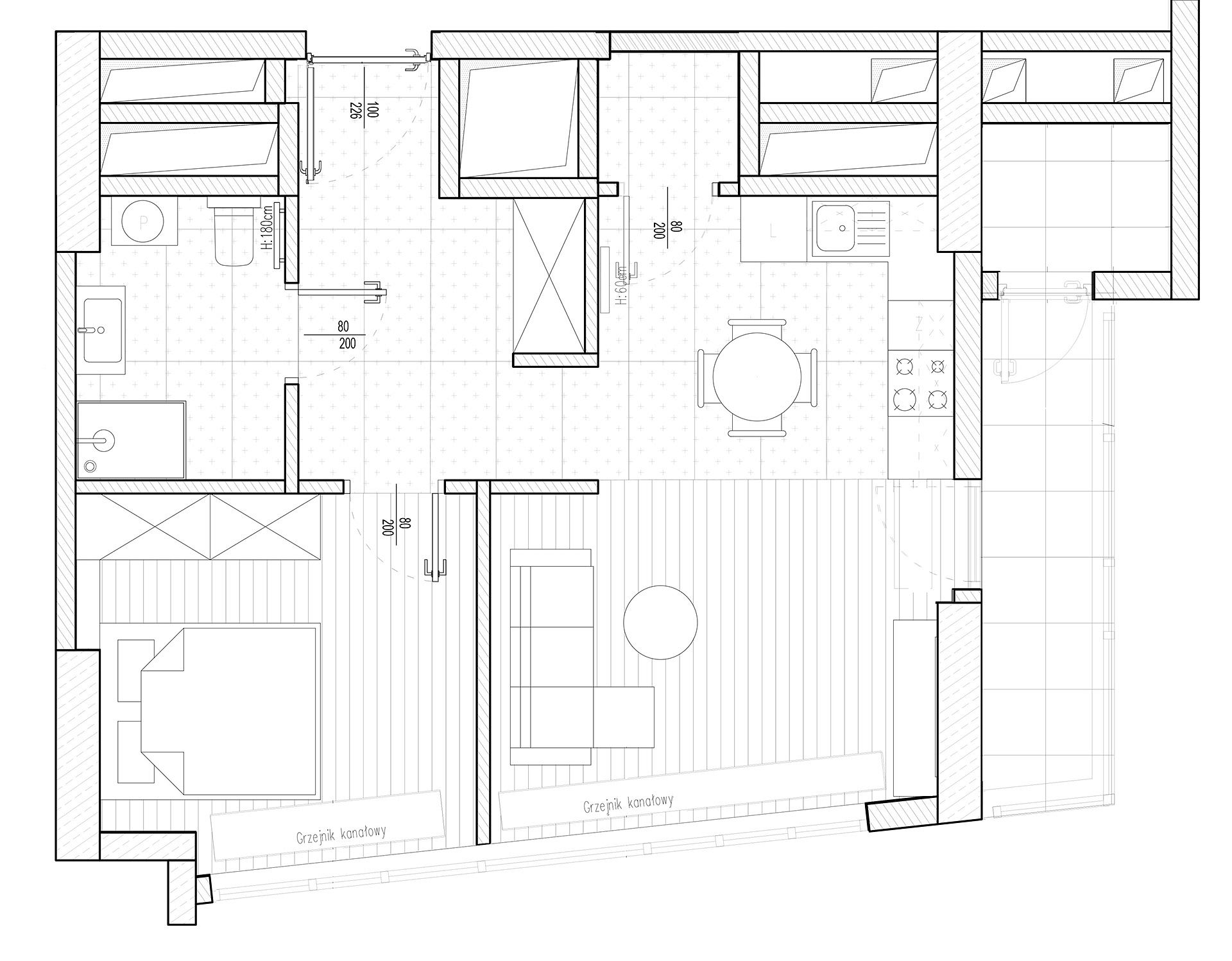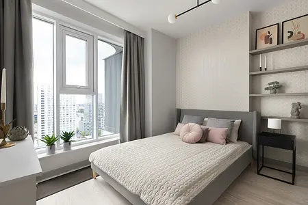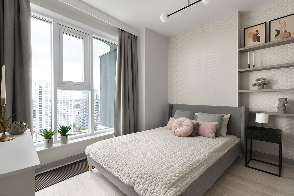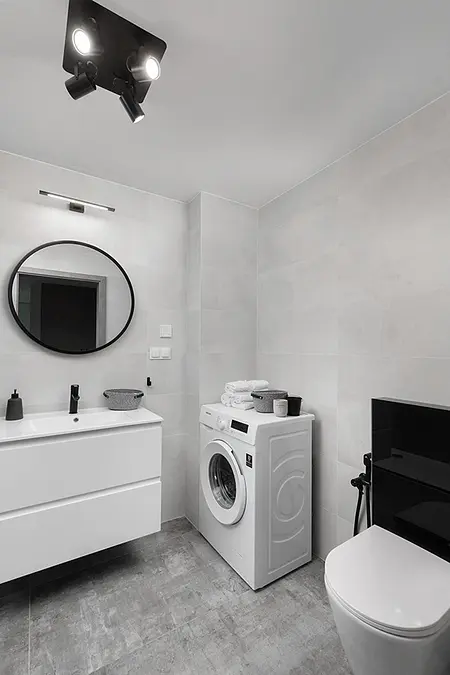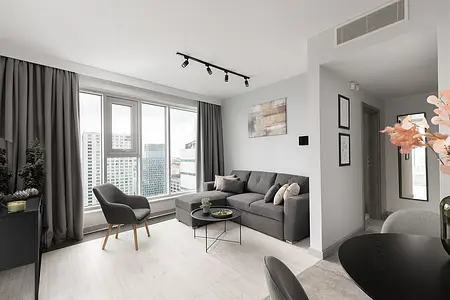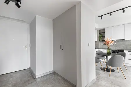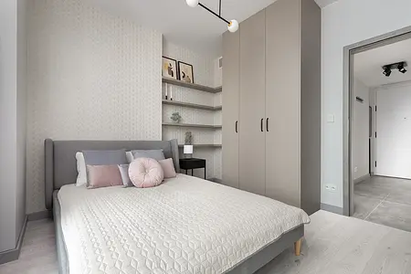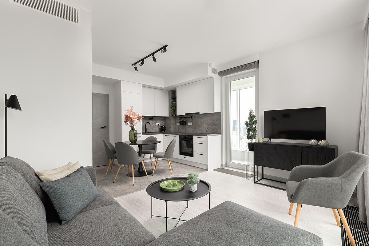 Mieszkanie zaprojektowane z myślą o wynajmie okazjonalnym, w pełni wyposażone - od mebli na wymiar, po meble ruchome i dodatki. Jasna, neutralna kolorystyka z przewagą szarości tworzy spójną i estetyczną przestrzeń, która jest łatwa w utrzymaniu czystości, a jednocześnie optycznie powiększa wnętrze i zapewnia wrażenie lekkości oraz świeżości.