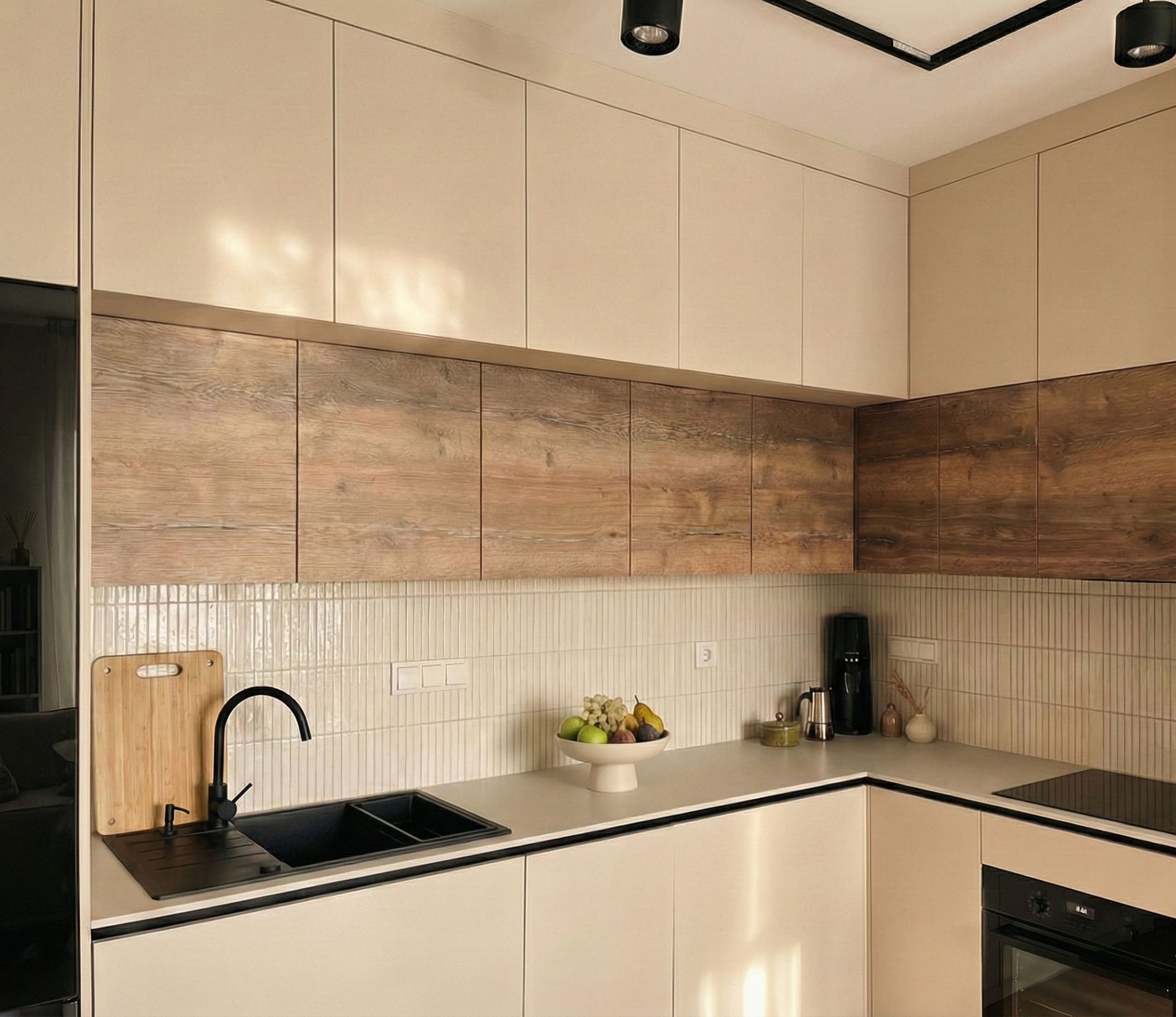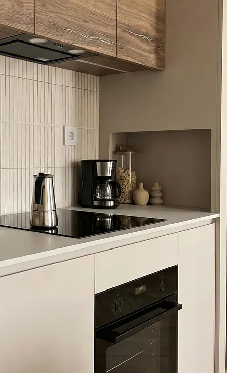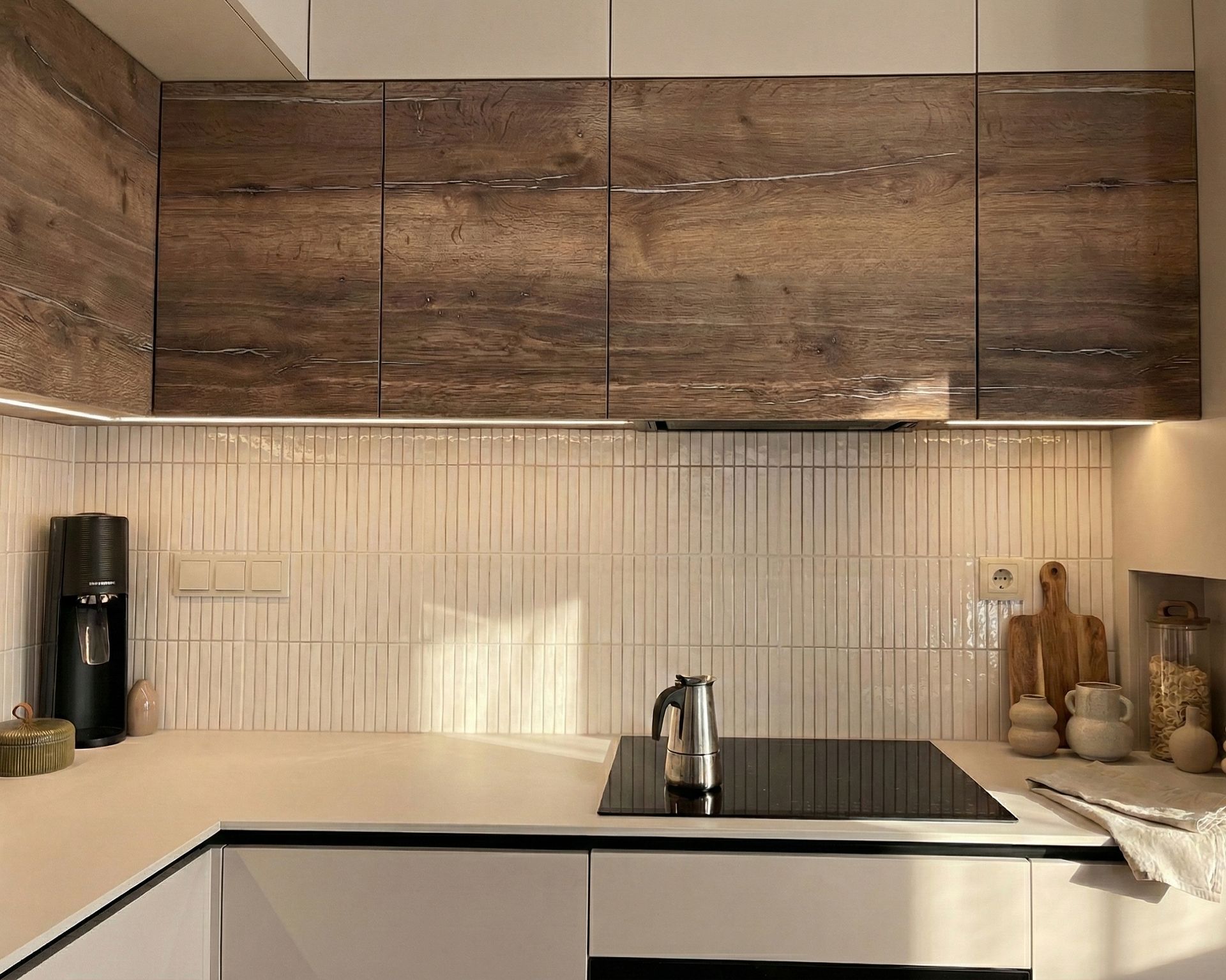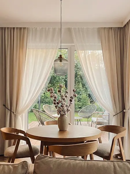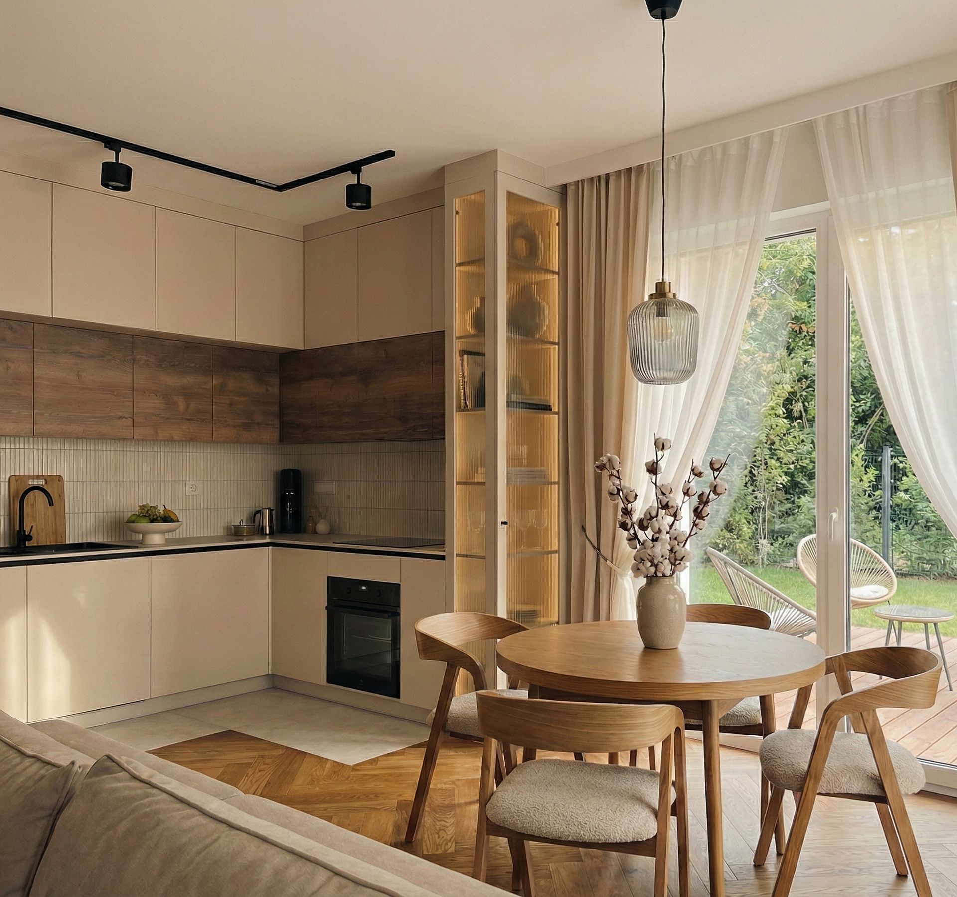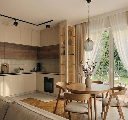 W salonie króluje nowoczesna elegancja z nutą przytulności. Meble o miękkich liniach, naturalne drewno w jadalni oraz efektowny kominek elektryczny tworzą harmonijną całość. Aneks kuchenny zachwyca stonowaną kolorystyką, idealnie dopasowaną do reszty wnętrza, a nietuzinkowa lampa nad stołem dodaje całości charakteru. Duże przeszklenia wprowadzają do środka mnóstwo naturalnego światła, podkreślając piękno materiałów i faktur.