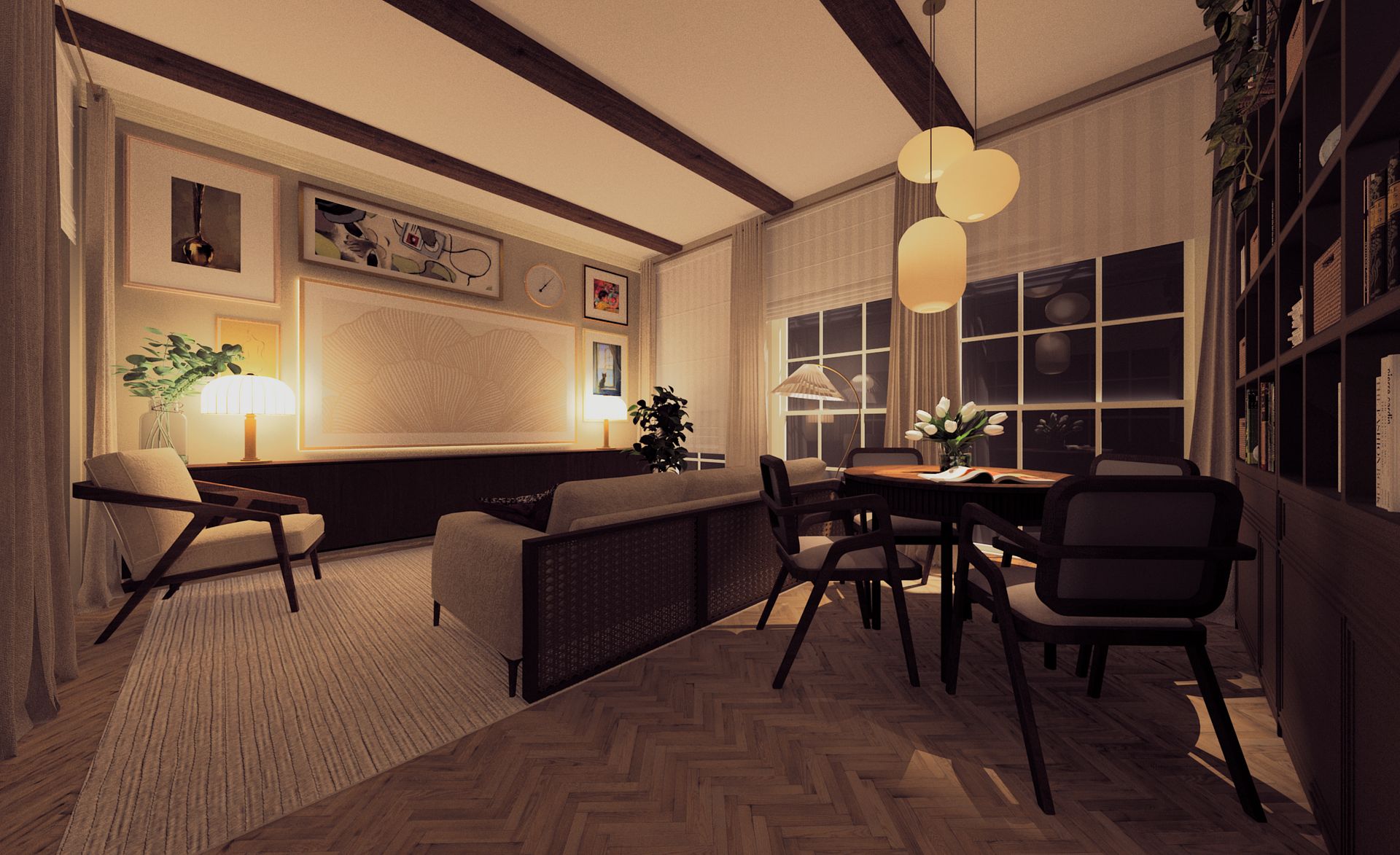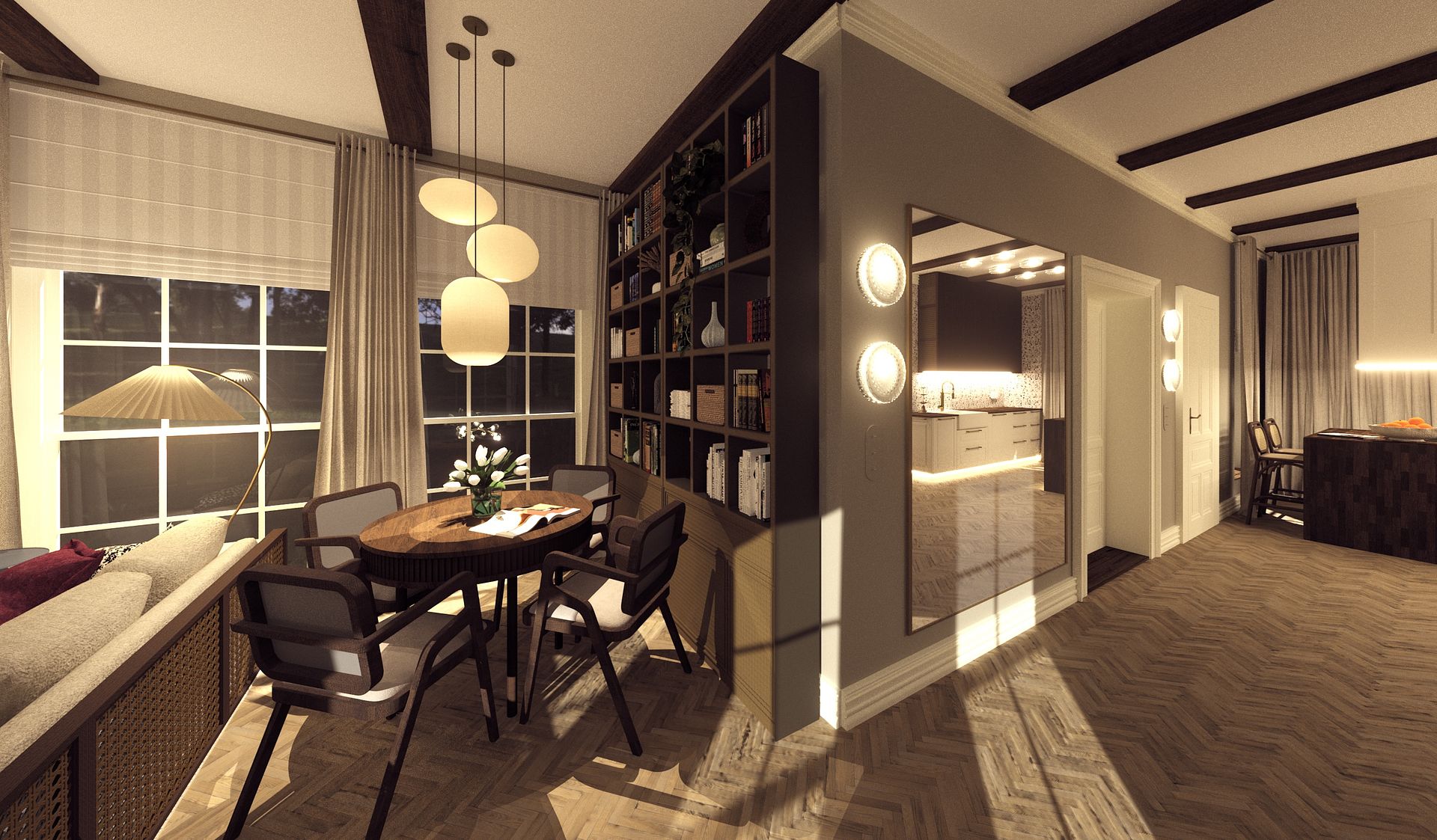 • ma ciepły i elegancki charakter o kolorach kremu, brązu i ciepłych odcieniach drewna, co daje poczucie spokoju i przytulności