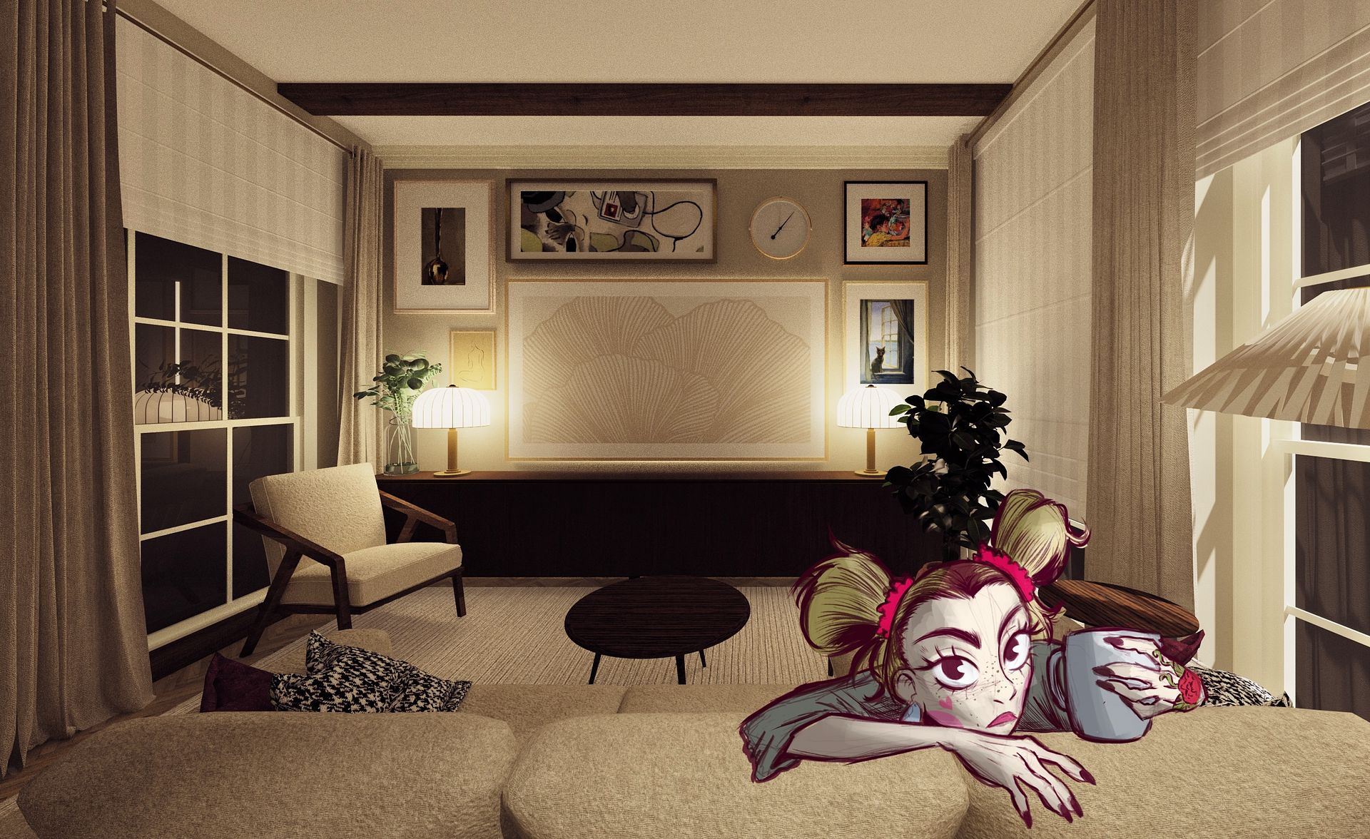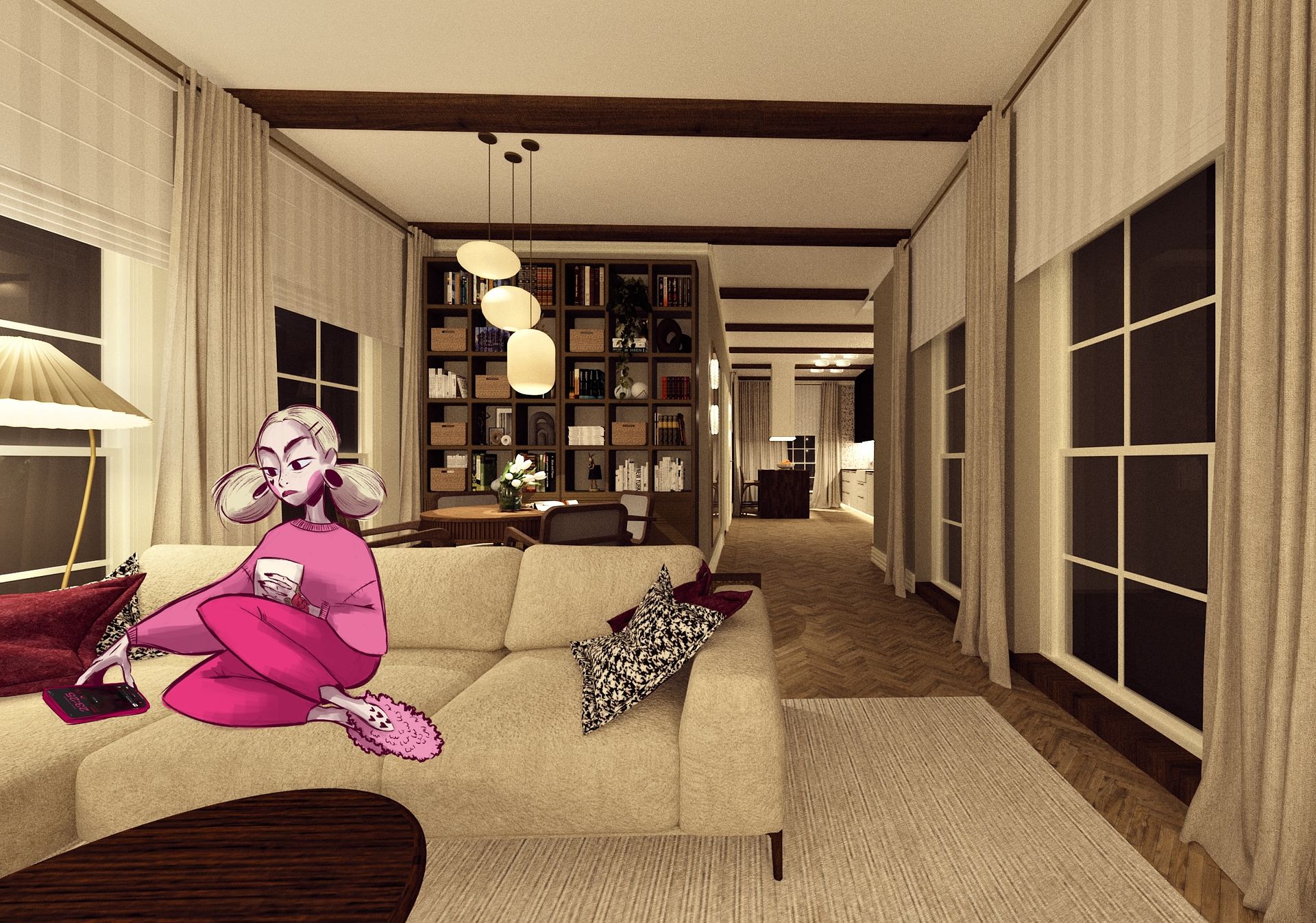 • ma ciepły i elegancki charakter o kolorach kremu, brązu i ciepłych odcieniach drewna, co daje poczucie spokoju i przytulności