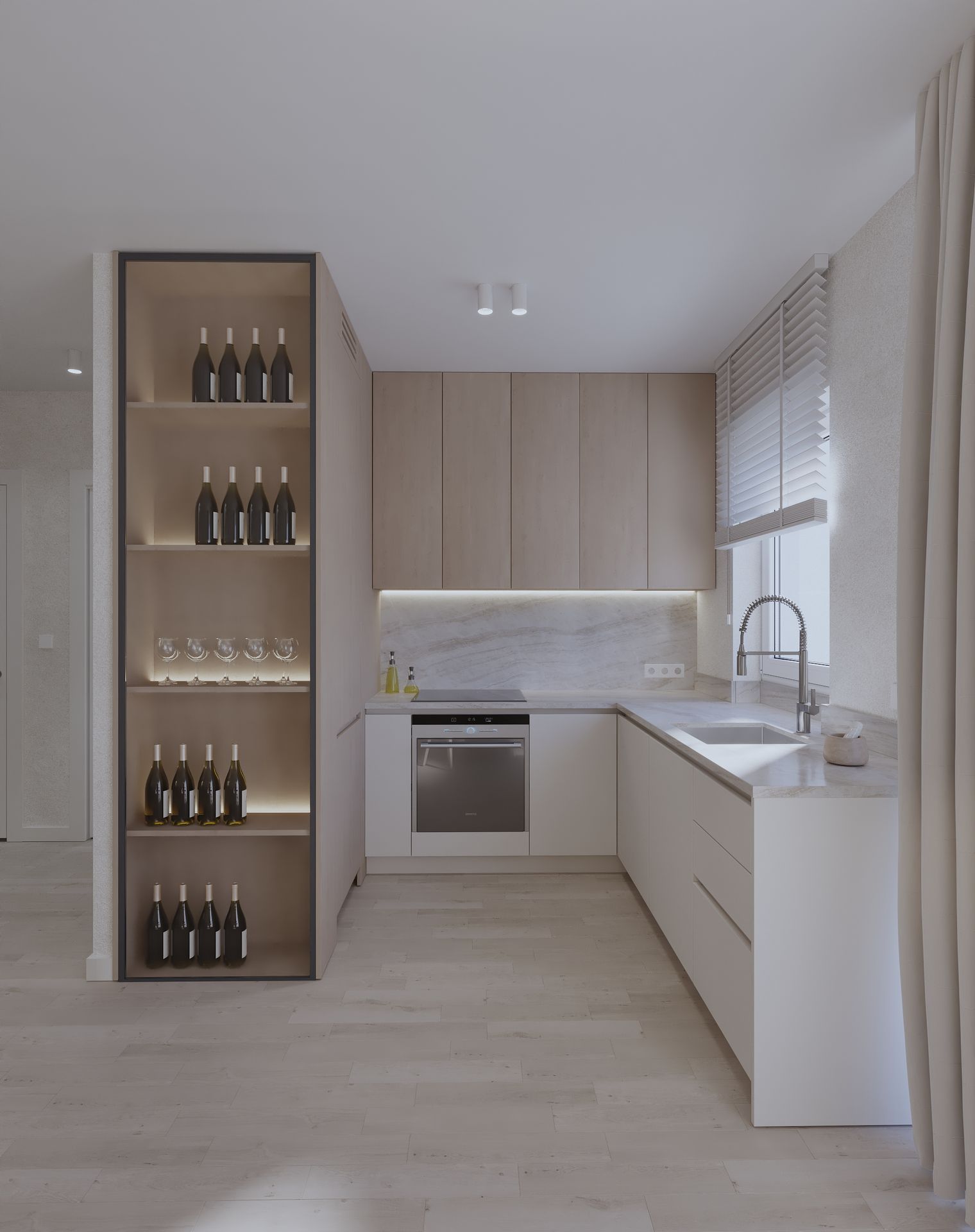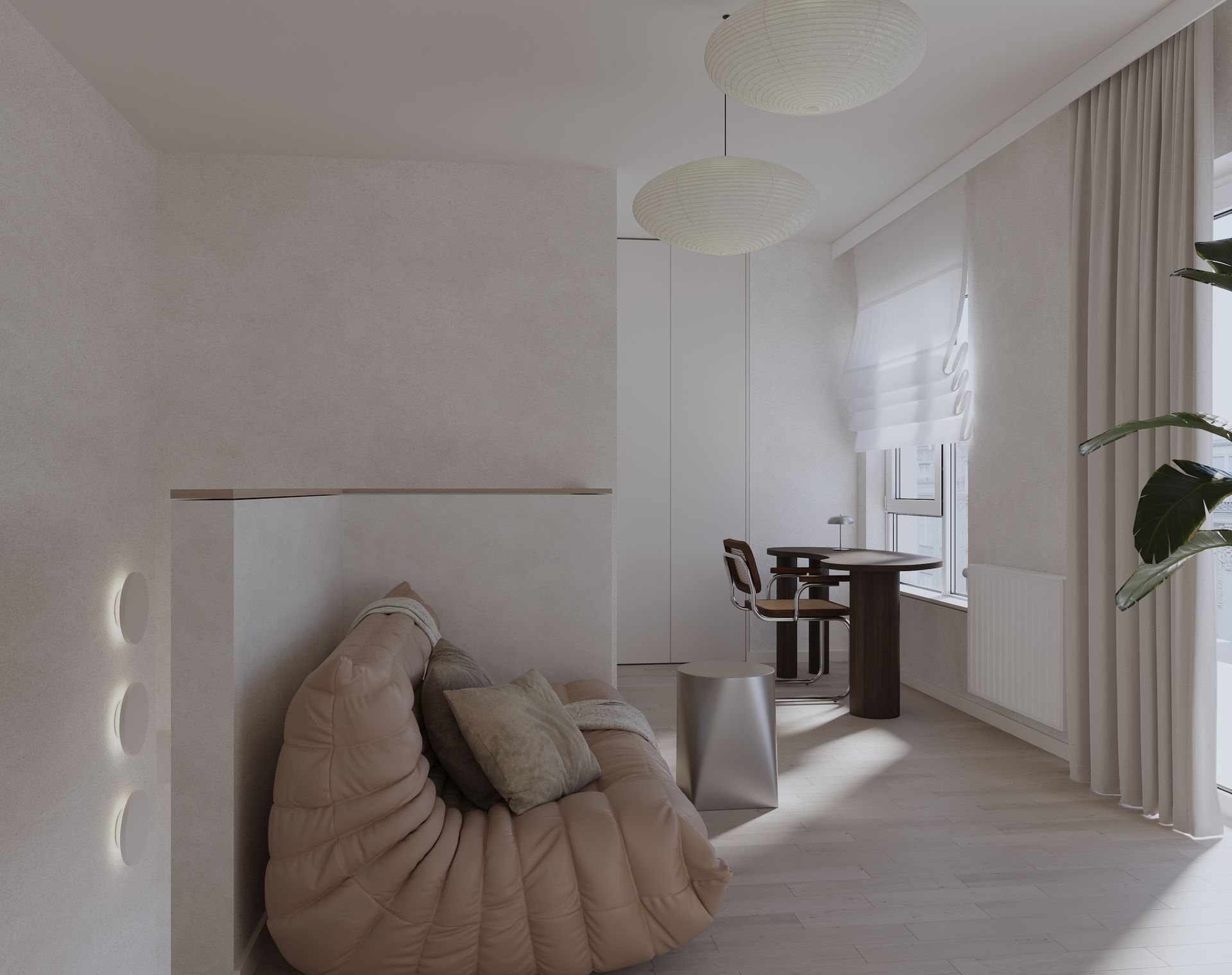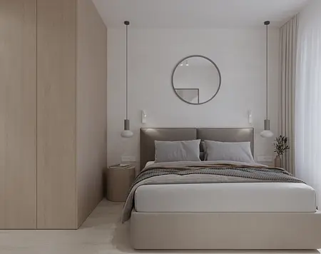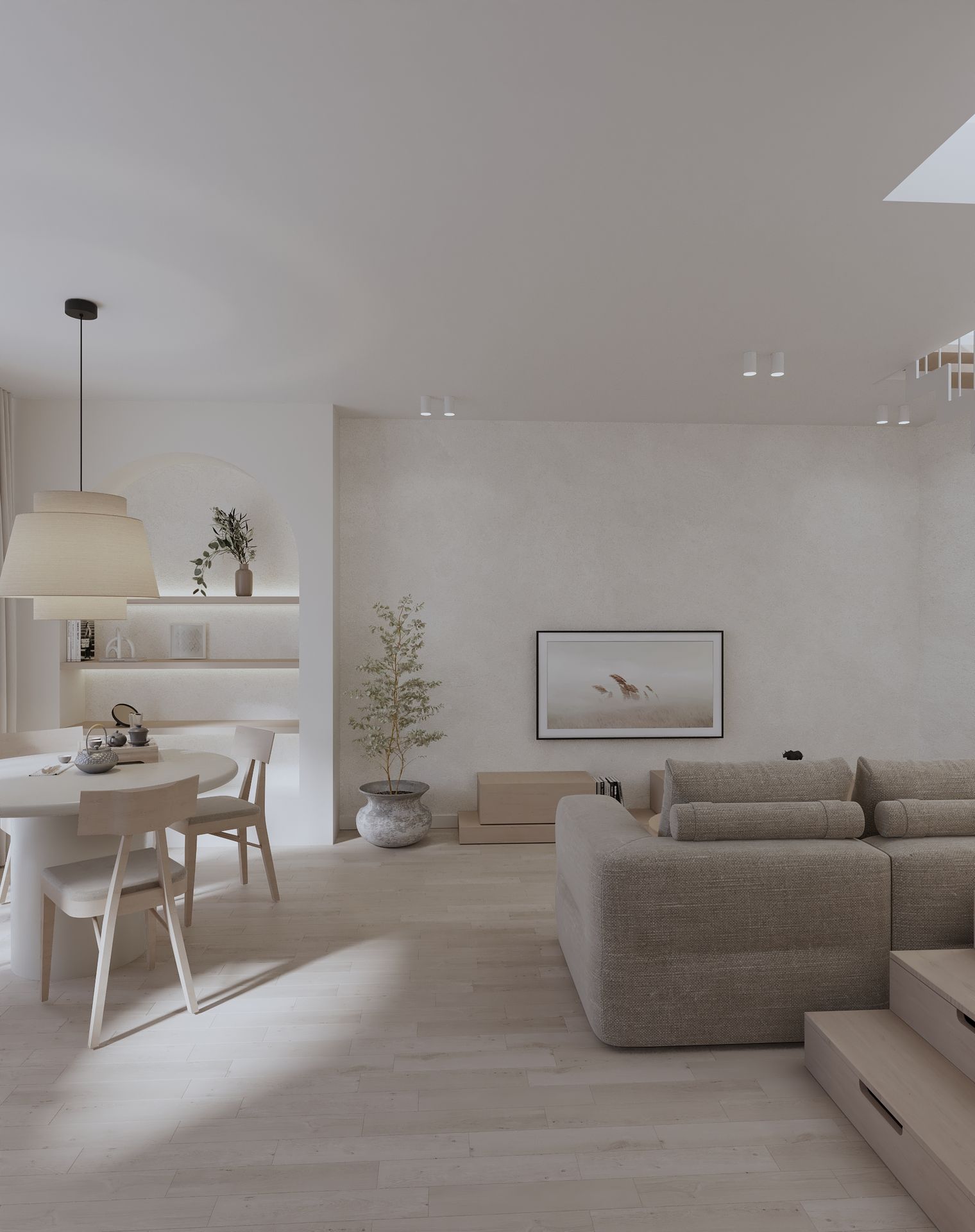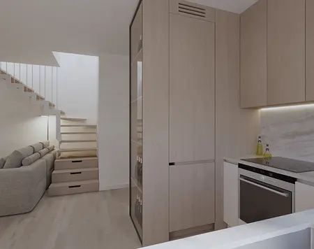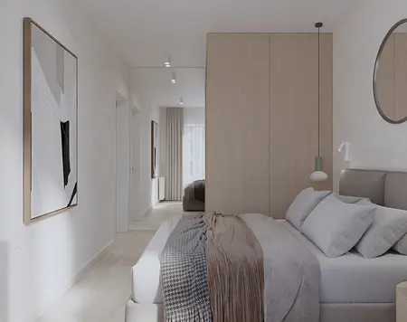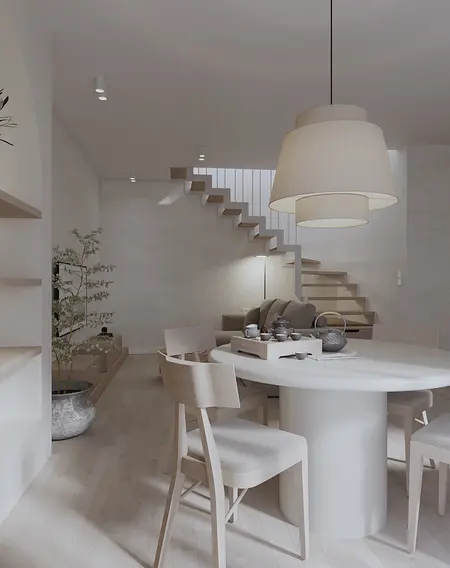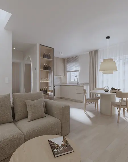 Mieszkanie w stylu japandi to nowoczesny projekt wnętrz łączący minimalizm, funkcjonalność i naturalne materiały. Styl japandi, inspirowany estetyką japońską i skandynawską, tworzy harmonijną i ponadczasową przestrzeń do życia. Wnętrze utrzymane jest w jasnej kolorystyce – beże, biele i drewno podkreślają ciepły minimalizm oraz elegancki charakter aranżacji. Otwarta strefa dzienna obejmuje salon, jadalnię i kuchnię, zaprojektowane zgodnie z zasadami prostoty i ergonomii. Minimalistyczna kuchnia z zabudową na wymiar oraz łazienka w stylu japandi z elementami spa zapewniają komfort i estetykę. Projekt wnętrza opiera się na naturalnym świetle, prostych formach i ukrytych systemach przechowywania. To idealne mieszkanie dla osób ceniących nowoczesne wnętrza, design japandi, funkcjonalne rozwiązania oraz spokojną, minimalistyczną przestrzeń.