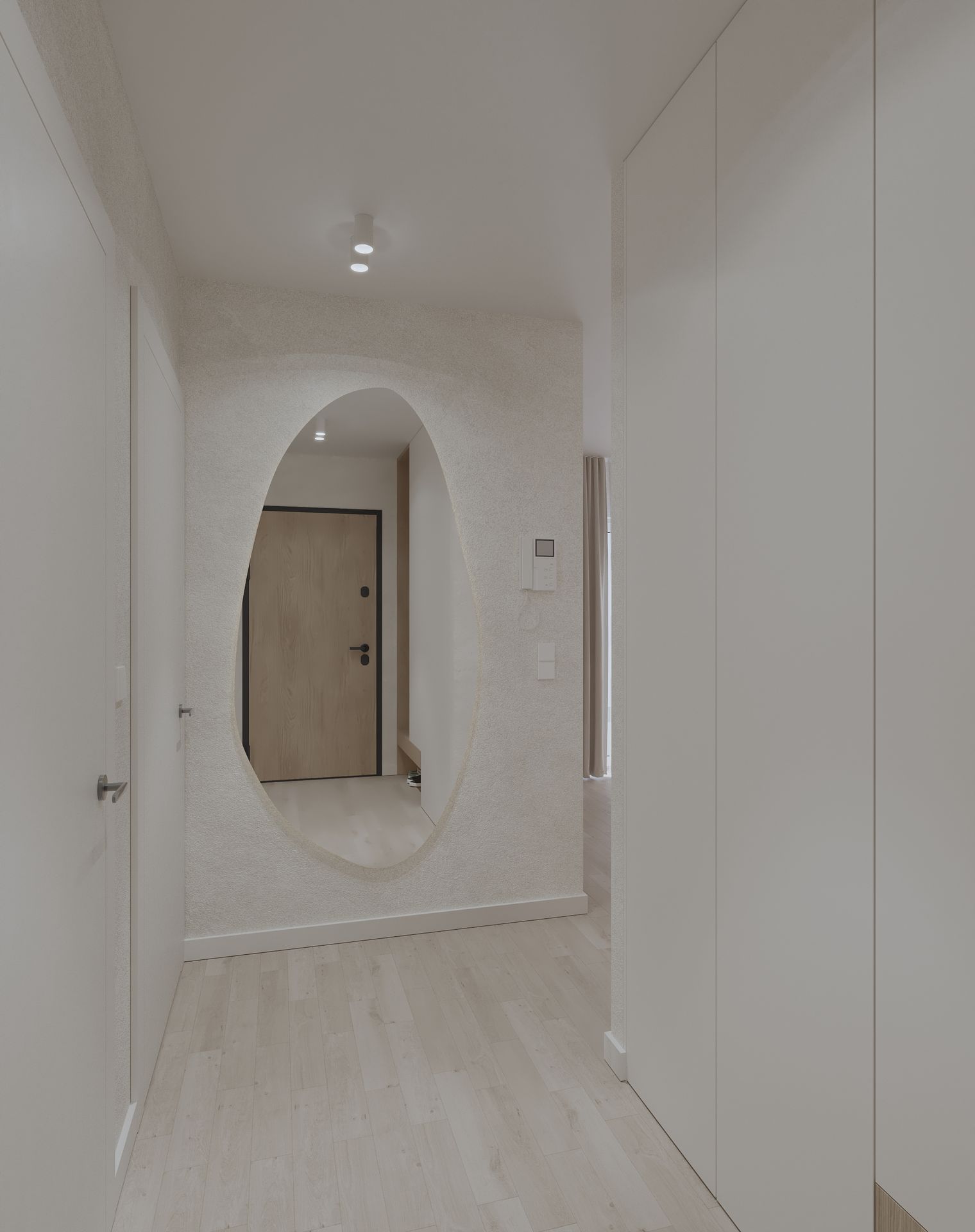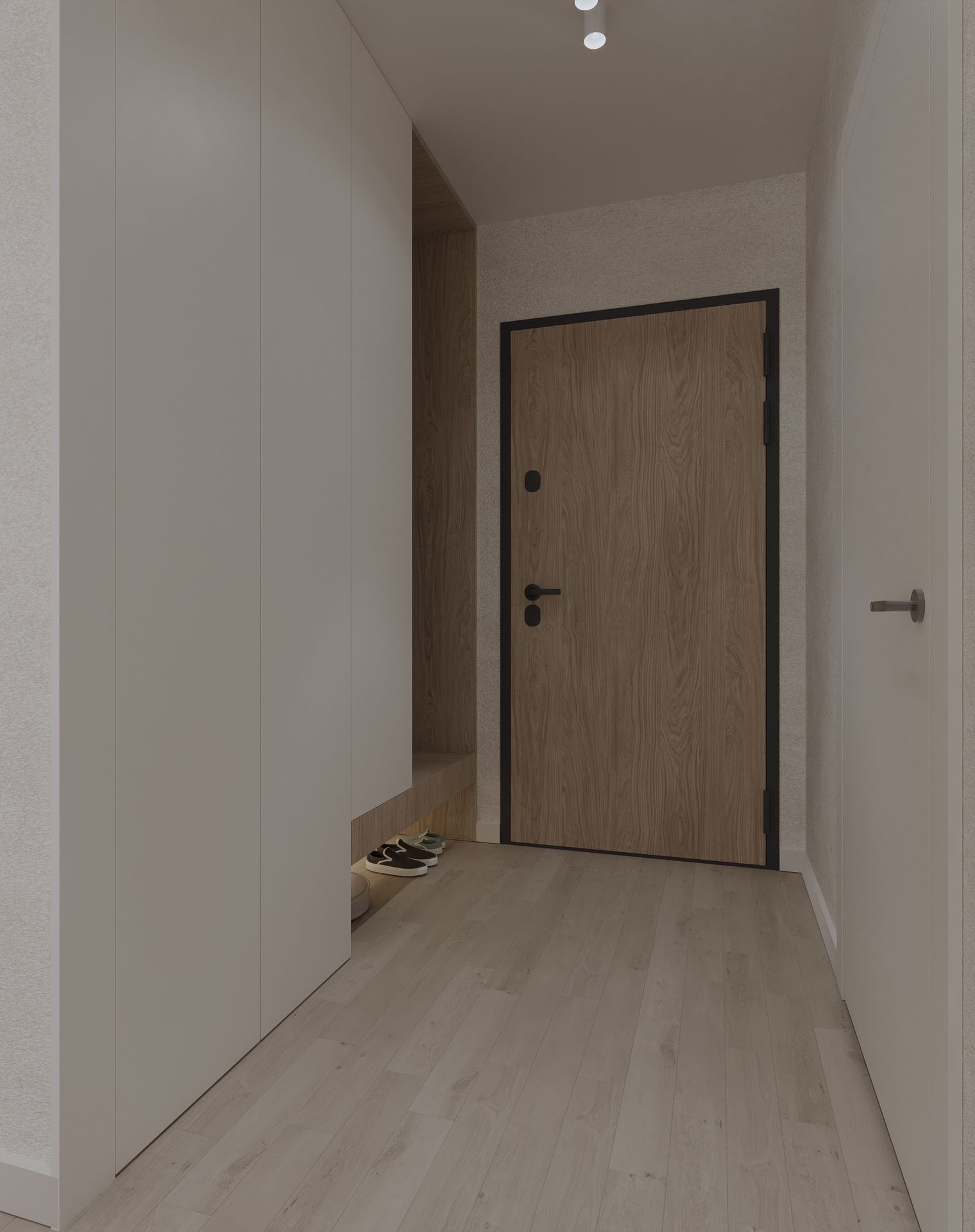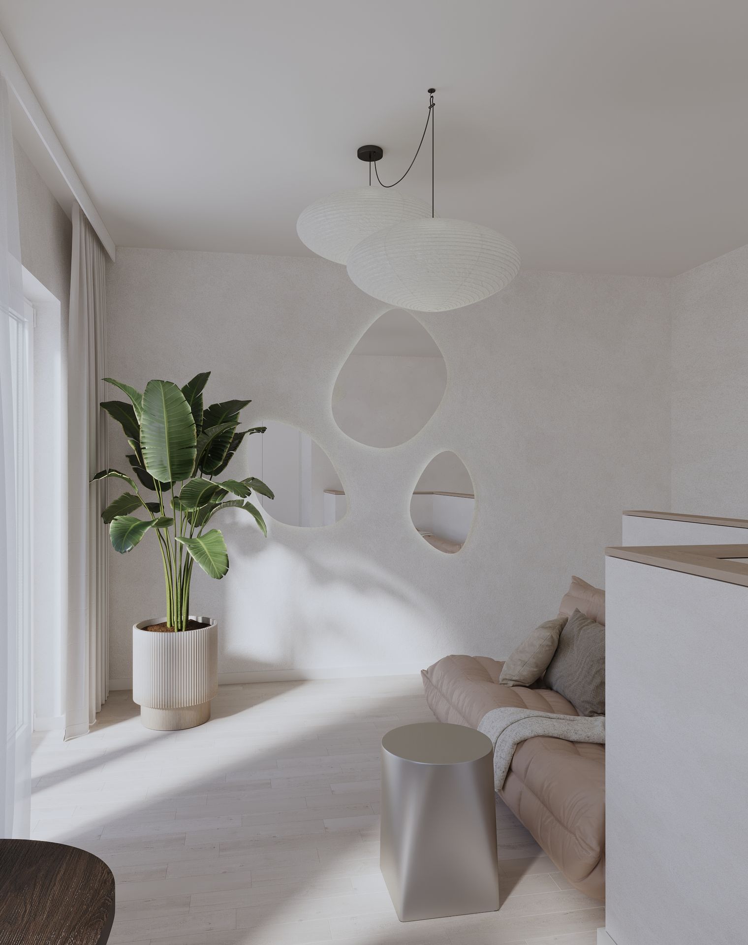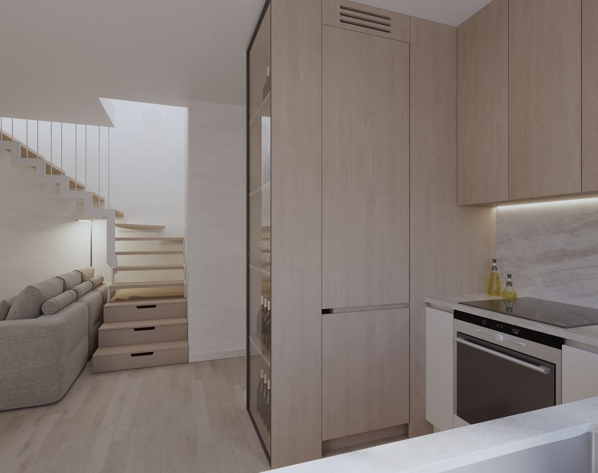 Mieszkanie w stylu japandi to nowoczesny projekt wnętrz łączący minimalizm, funkcjonalność i naturalne materiały. Styl japandi, inspirowany estetyką japońską i skandynawską, tworzy harmonijną i ponadczasową przestrzeń do życia. Wnętrze utrzymane jest w jasnej kolorystyce – beże, biele i drewno podkreślają ciepły minimalizm oraz elegancki charakter aranżacji. Otwarta strefa dzienna obejmuje salon, jadalnię i kuchnię, zaprojektowane zgodnie z zasadami prostoty i ergonomii. Minimalistyczna kuchnia z zabudową na wymiar oraz łazienka w stylu japandi z elementami spa zapewniają komfort i estetykę. Projekt wnętrza opiera się na naturalnym świetle, prostych formach i ukrytych systemach przechowywania. To idealne mieszkanie dla osób ceniących nowoczesne wnętrza, design japandi, funkcjonalne rozwiązania oraz spokojną, minimalistyczną przestrzeń.