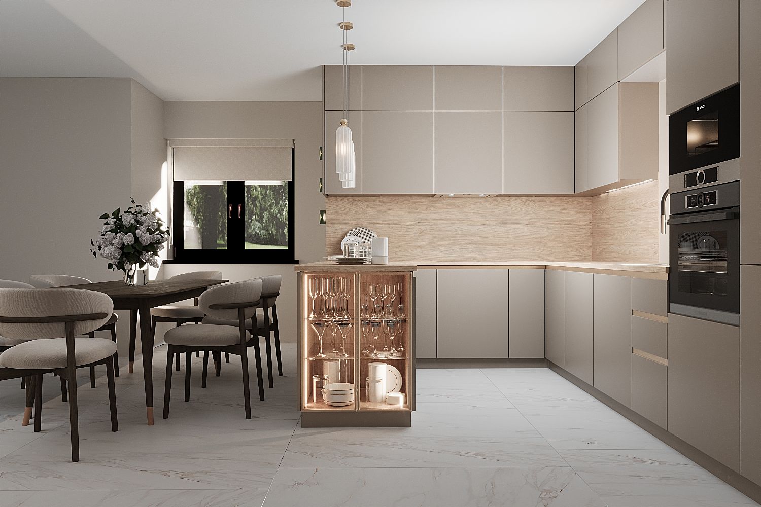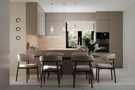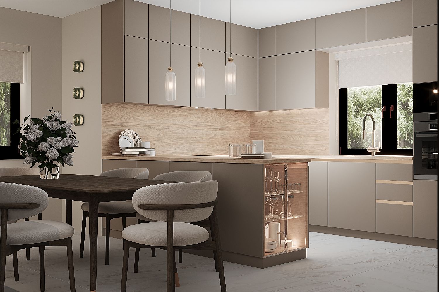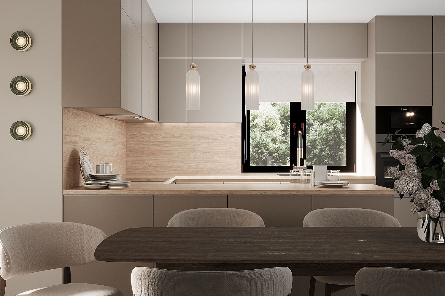 Wizualizacja współczesnej kuchni w minimalistycznym stylu dla naszego klienta z Polski. Fronty koloru kaszmir ciemny z metalowym profilem Gala tworzą elegancki i funkcjonalny wnętrze. Wysokie okna zapewniają naturalne oświetlenie, a drewniany blat dodaje ciepłego akcentu. Wnętrze wyposażone jest współczesną AGD, która idealnie się integuje z meblami.