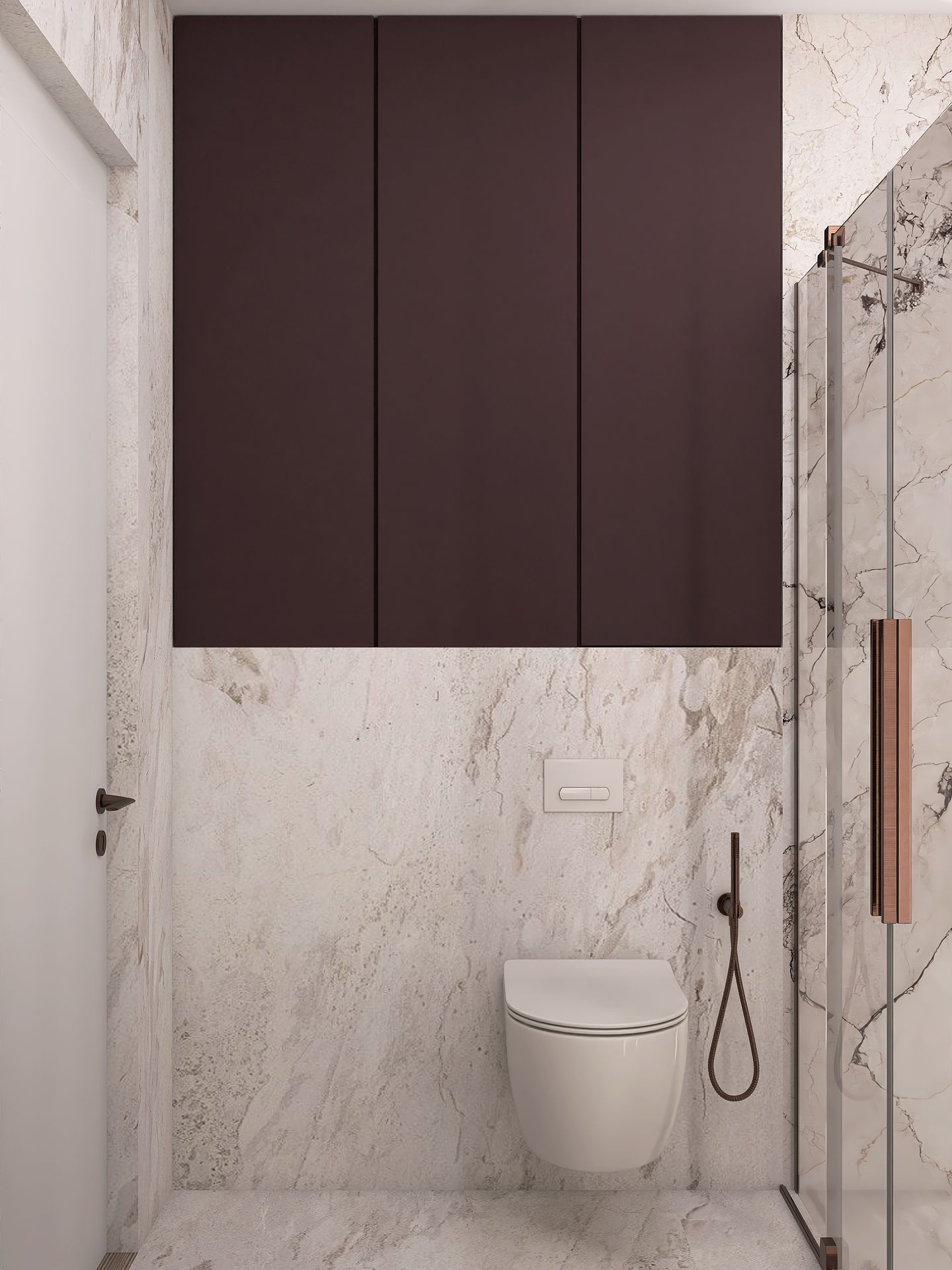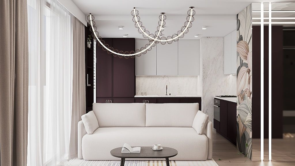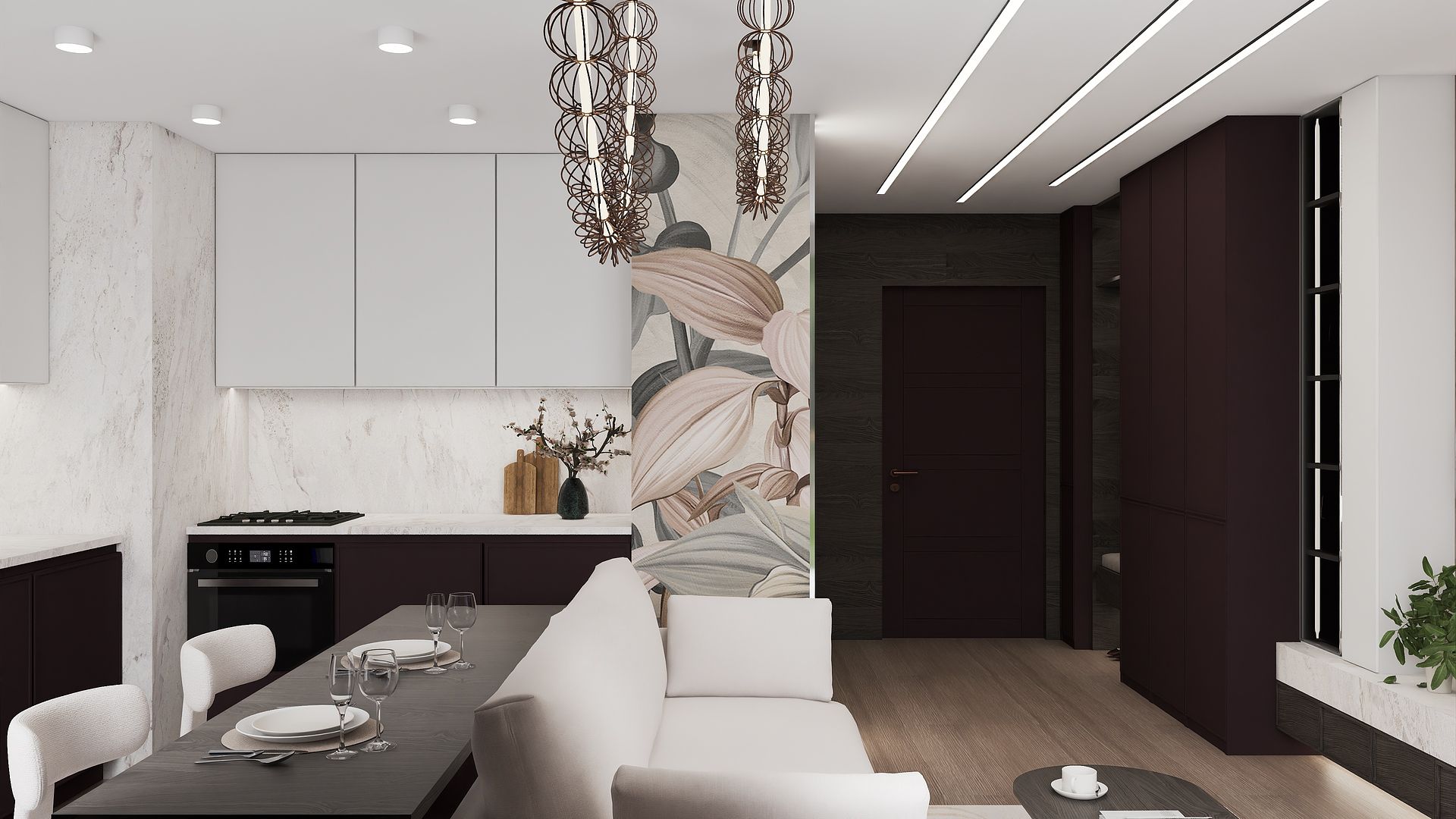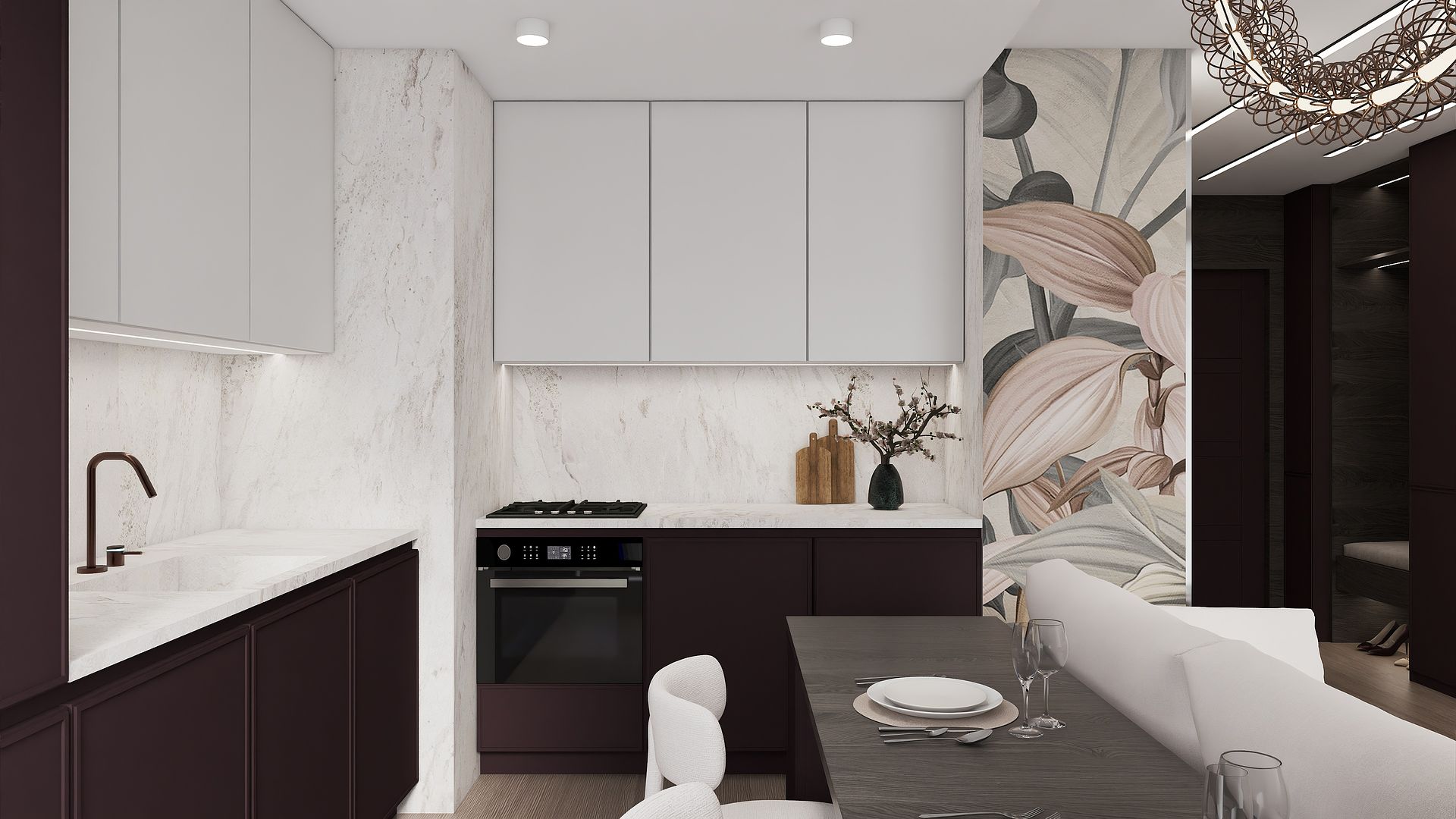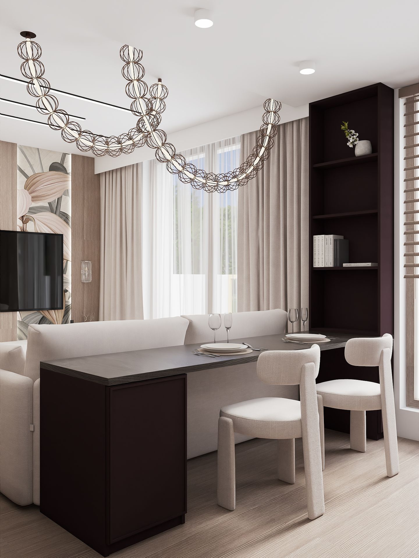 Na niewielkim metrażu udało się całkiem sporo zmieścić :) Układ mieszkania pozwolił na wydzielenie w pełni funkcjonalnej kuchni ze stołem jadalnianym, który w razie potrzeby zamienić się może w miejsce do pracy. Nie brakuje tu również przestrzeni do przechowywania, a sprytne ukrycie pralki w zabudowie kuchennej pozwoliło zaprojektować perfekcyjną łazienkę z przestronną strefą prysznica.