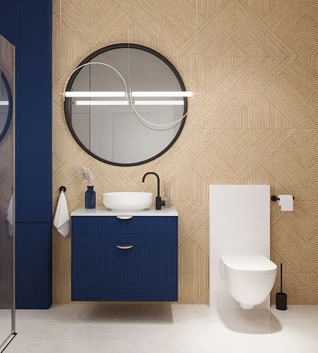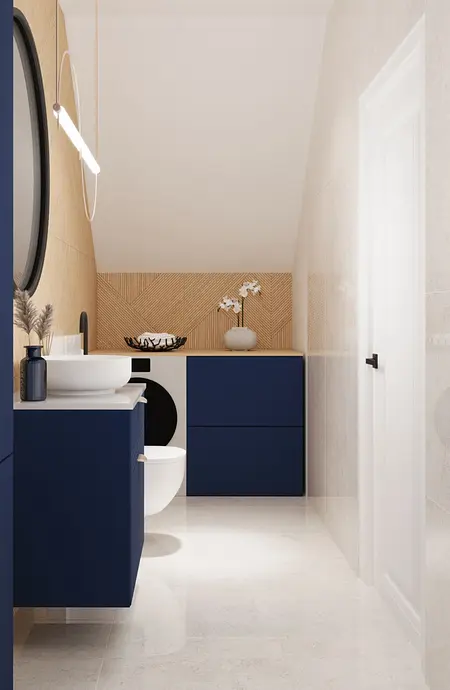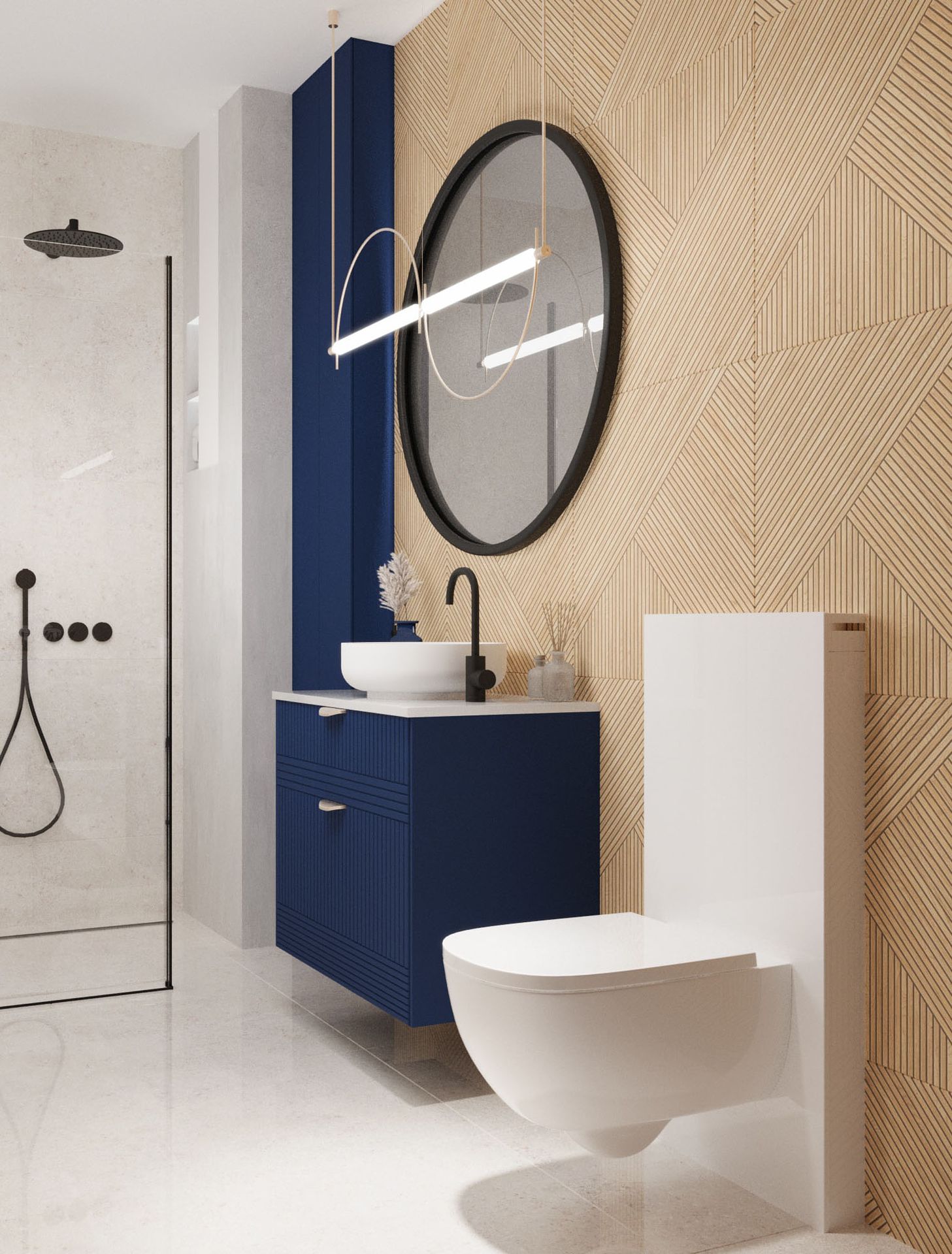 Ta łazienka łączy nowoczesny minimalizm z ciepłem skandynawskich akcentów. Geometryczna ściana z jasnego drewna nadaje wnętrzu wyjątkowego charakteru, a granatowe meble wprowadzają elegancki, wyrazisty kontrast. Jasne płytki, czarna armatura i proste formy tworzą harmonijną, funkcjonalną przestrzeń o lekkim, współczesnym stylu.
