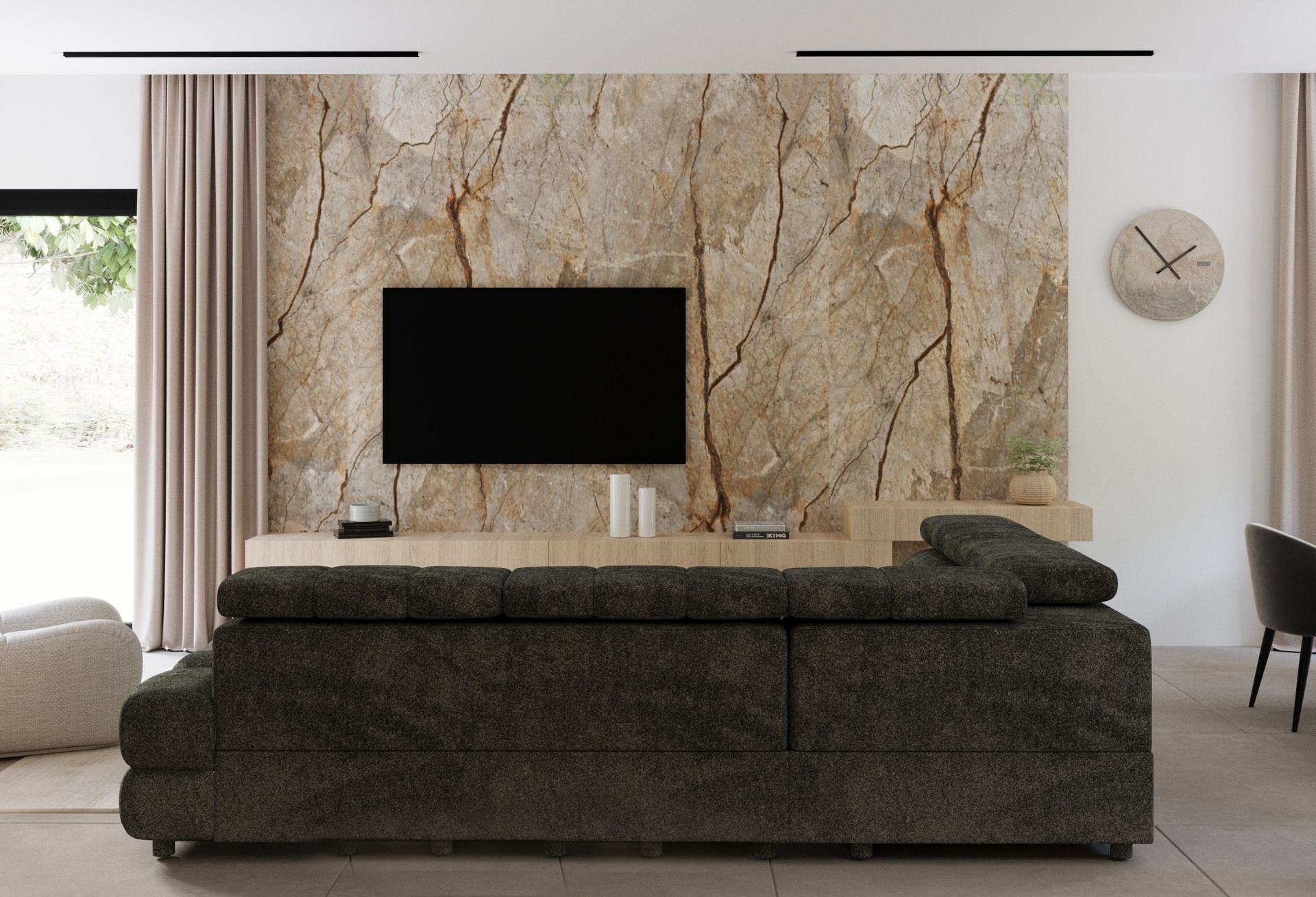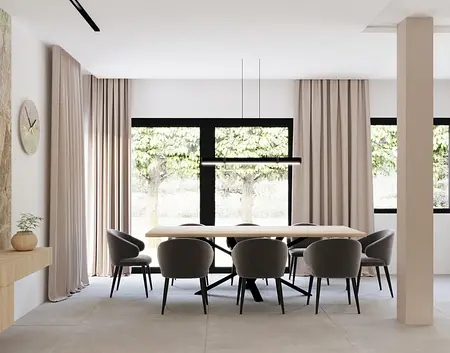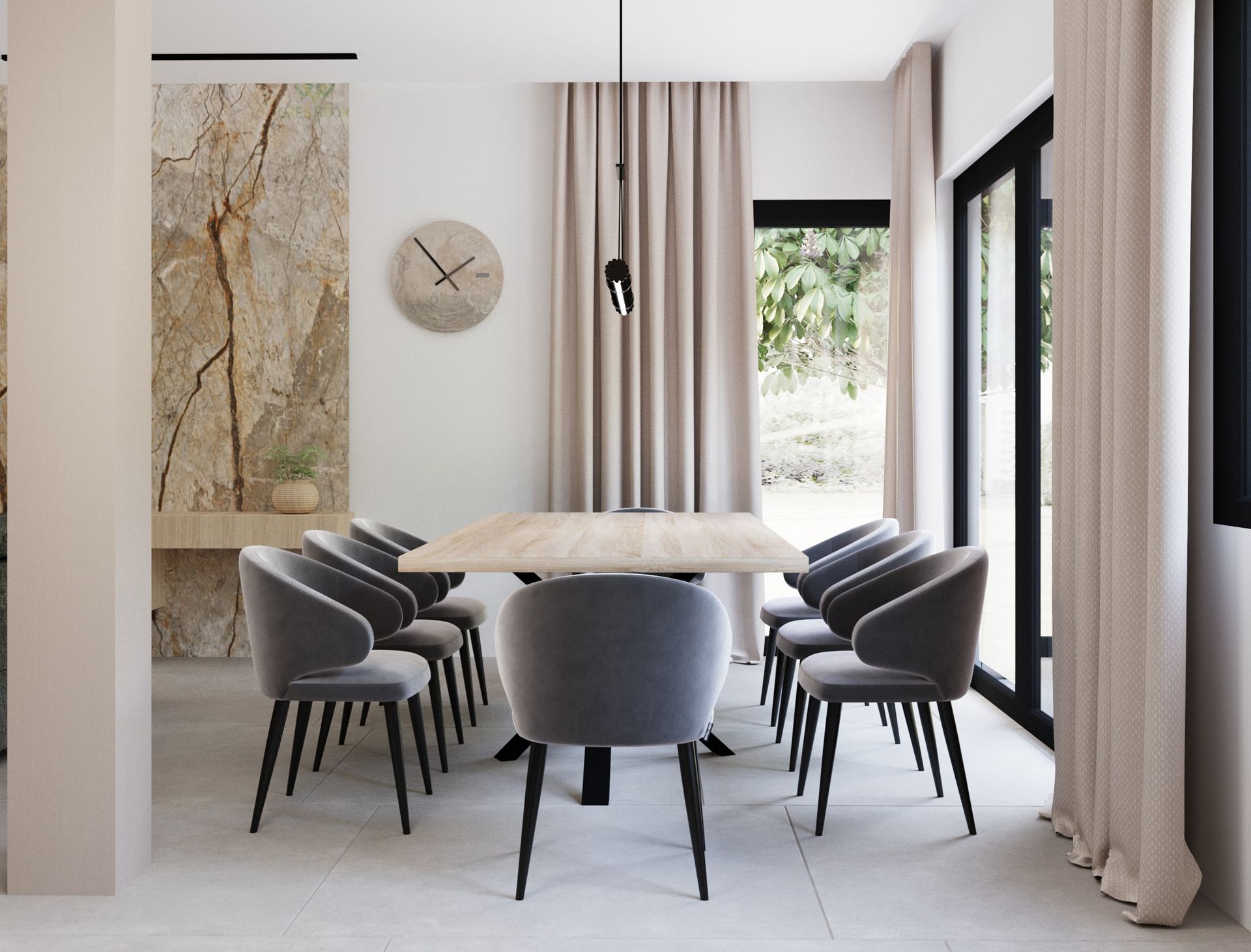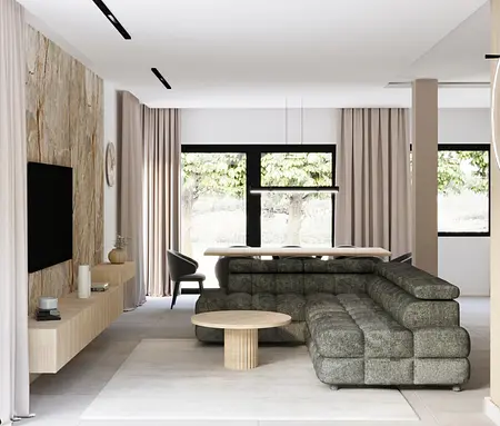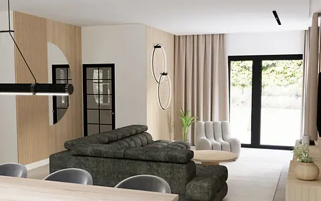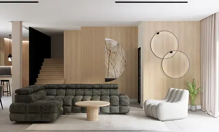 To wnętrze utrzymane jest w nowoczesnym, spokojnym stylu z wyraźnymi wpływami Japandi i organic modern. Jasne drewno, naturalny kamień i miękkie, obłe formy mebli tworzą harmonijną, wyciszającą przestrzeń. Minimalistyczne dekoracje oraz subtelne czarne akcenty podkreślają elegancję i lekkość aranżacji, nadając wnętrzu przytulny, a jednocześnie nowoczesny charakter.