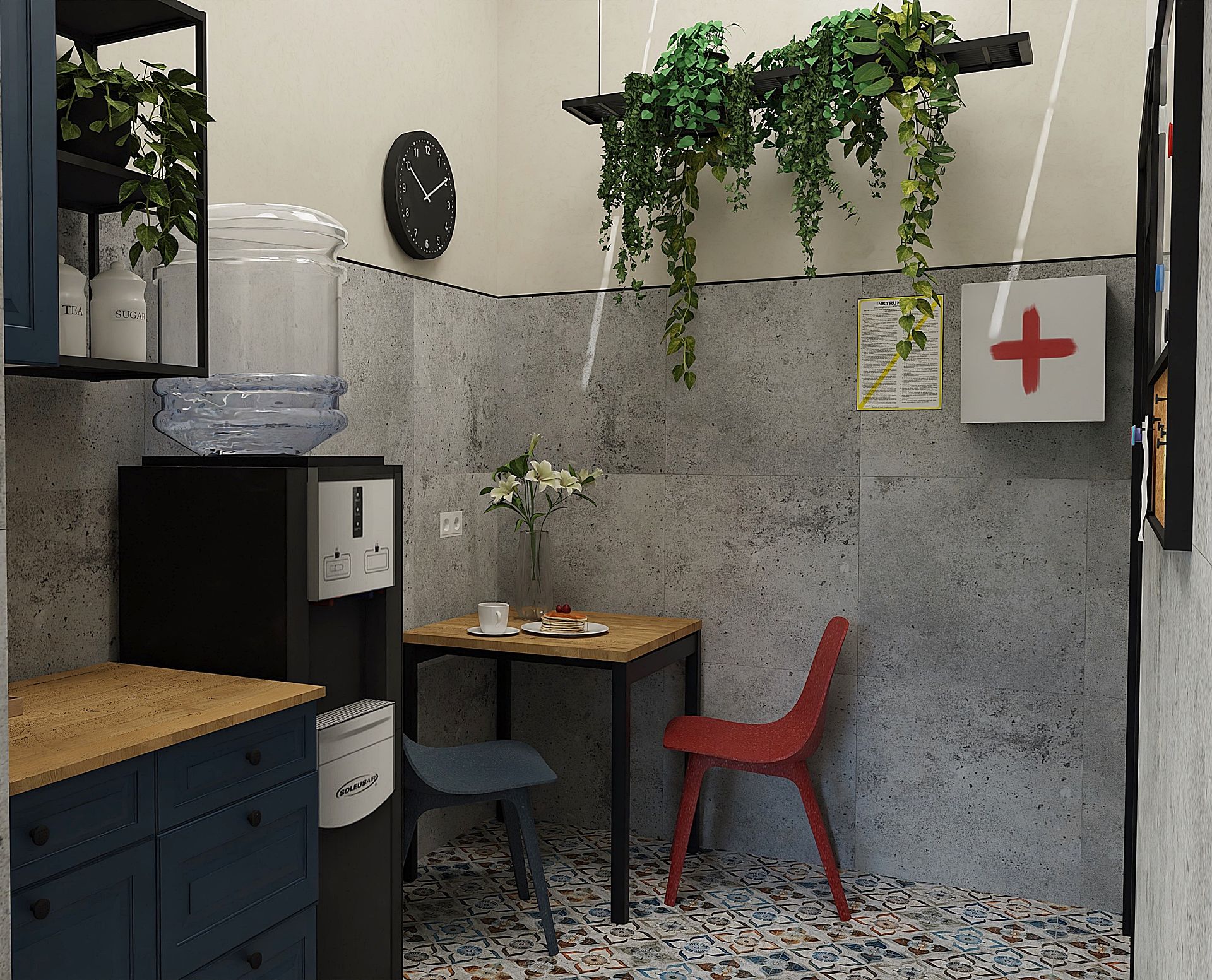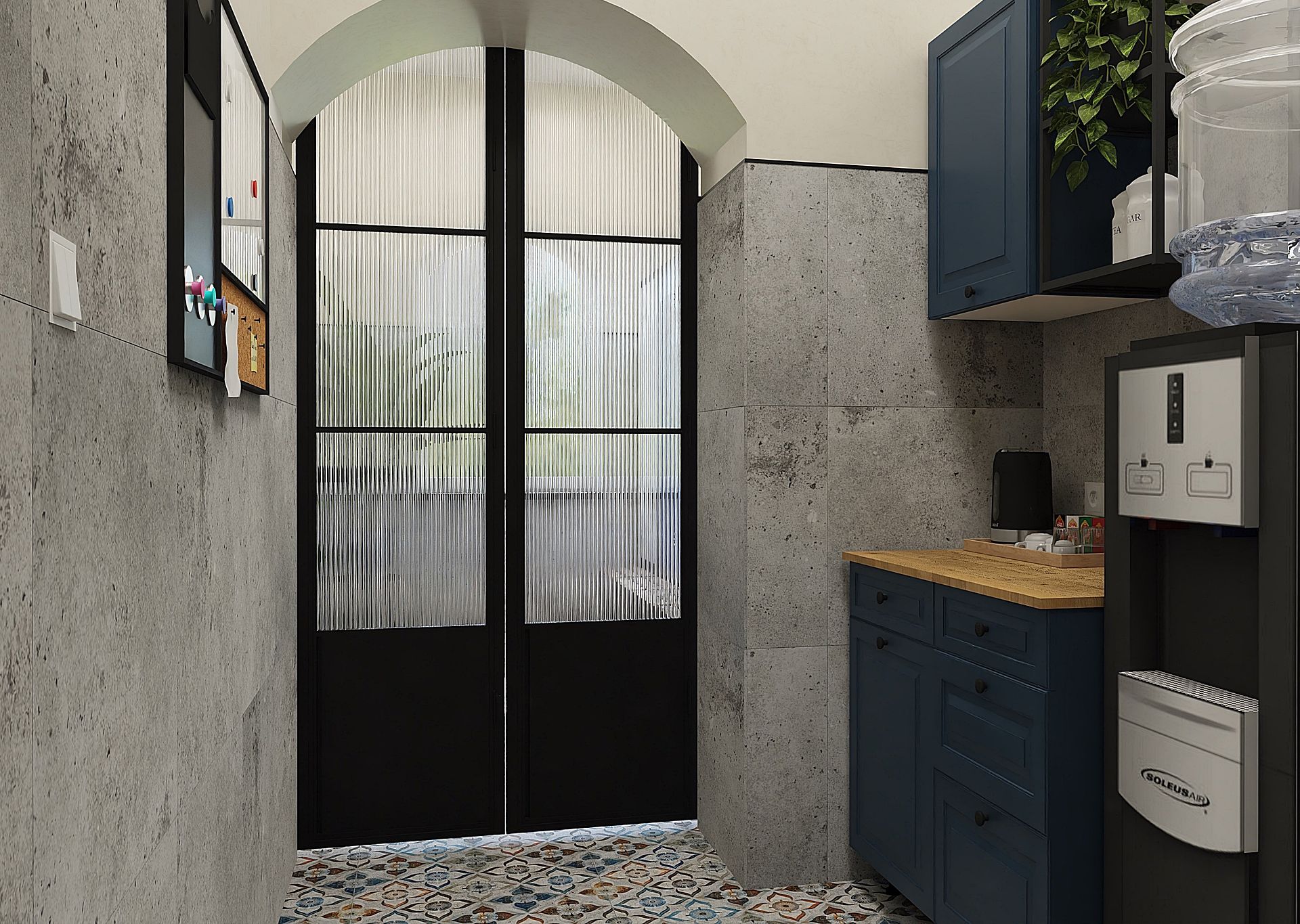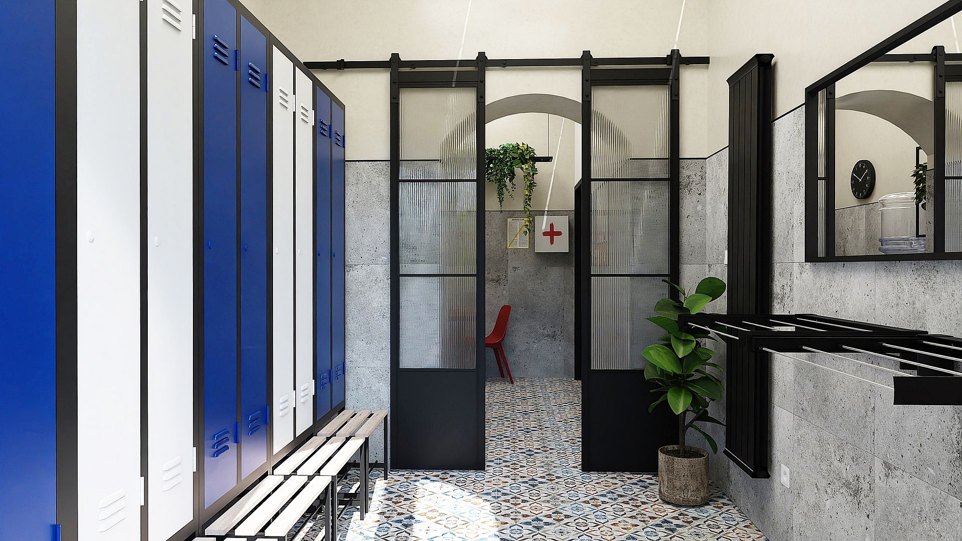 Projekt pomieszczenia socjalnego w Słodowni w Strzegomiu.
