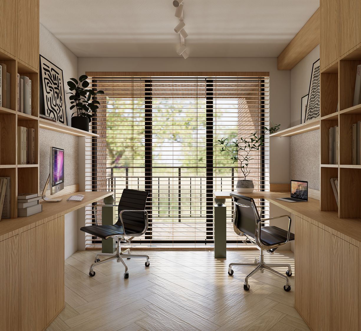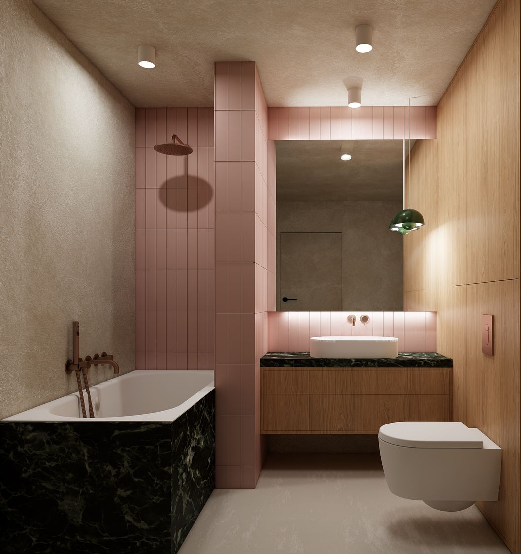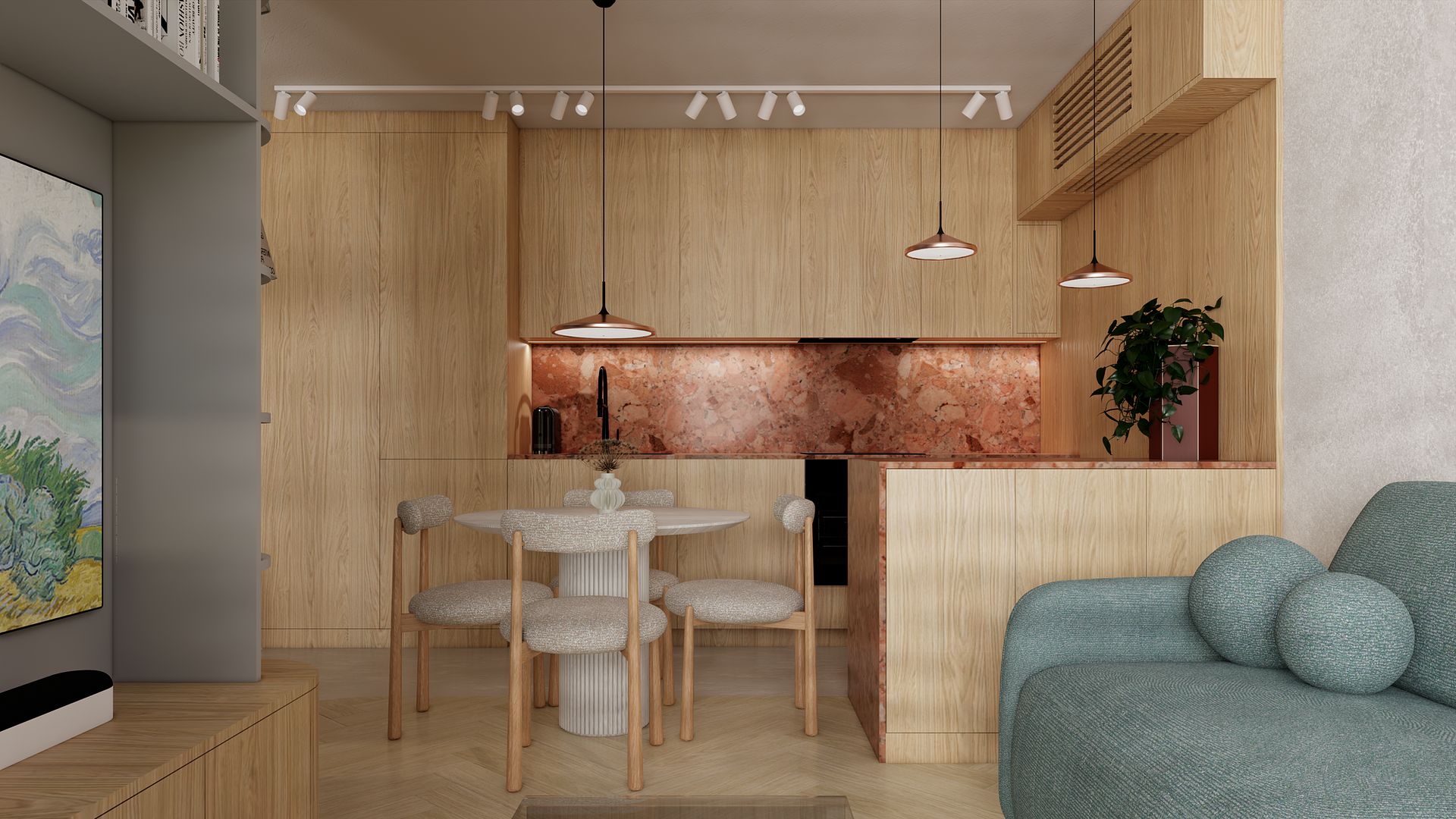 Projekt wnętrza charakteryzuje się ciepłą, harmonijną kolorystyką i naturalnymi materiałami. Dominują odcienie drewna, zgaszona zieleń i przytłumione różowo-terakotowe akcenty, które nadają przestrzeni przytulności i elegancji. Kuchnia łączy minimalistyczną zabudowę z marmurowym, rdzawym tłem, tworząc efektowny, ale spójny detal. Łazienka wyróżnia się odważnym zestawieniem różowych płytek z ciemnym marmurem i drewnem, co wprowadza artystyczny klimat. Sypialnia utrzymana jest w zmysłowych, ziemistych tonach - oliwkowej zieleni i burgundzie - które sprzyjają relaksowi. Całość projektu jest spójna, nowoczesna i dopracowana w detalach, z wyraźnym naciskiem na naturalne faktury i nastrojowe oświetlenie.