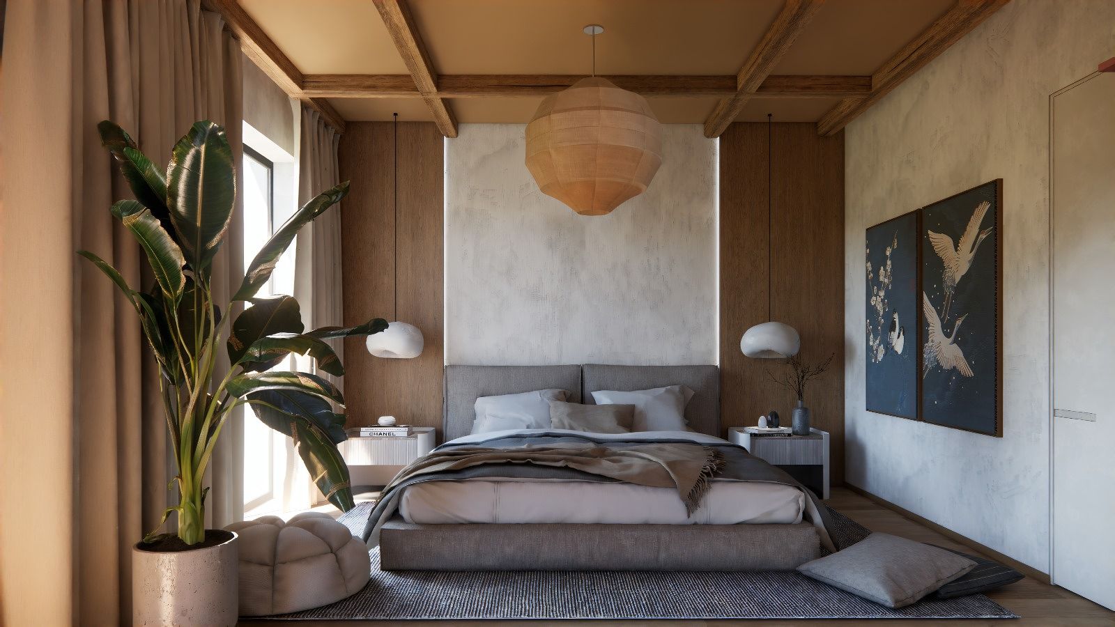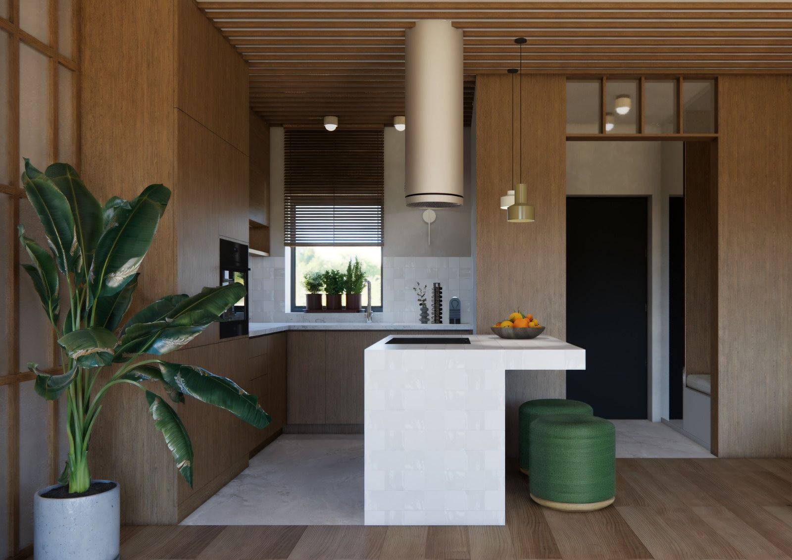 Ten projekt to harmonijne połączenie natury, subtelnego luksusu i wyważonej kolorystyki. Każde pomieszczenie opiera się na spójnej palecie barw ziemi, uzupełnionej o akcenty inspirowane japońskim minimalizmem i organicznymi formami. Wnętrza są pełne ciepła dzięki zastosowaniu naturalnego drewna, miękkich tkanin i delikatnego światła. Projekt łączy nowoczesność z przytulnością, tworząc przestrzeń sprzyjającą wyciszeniu i codziennemu komfortowi.