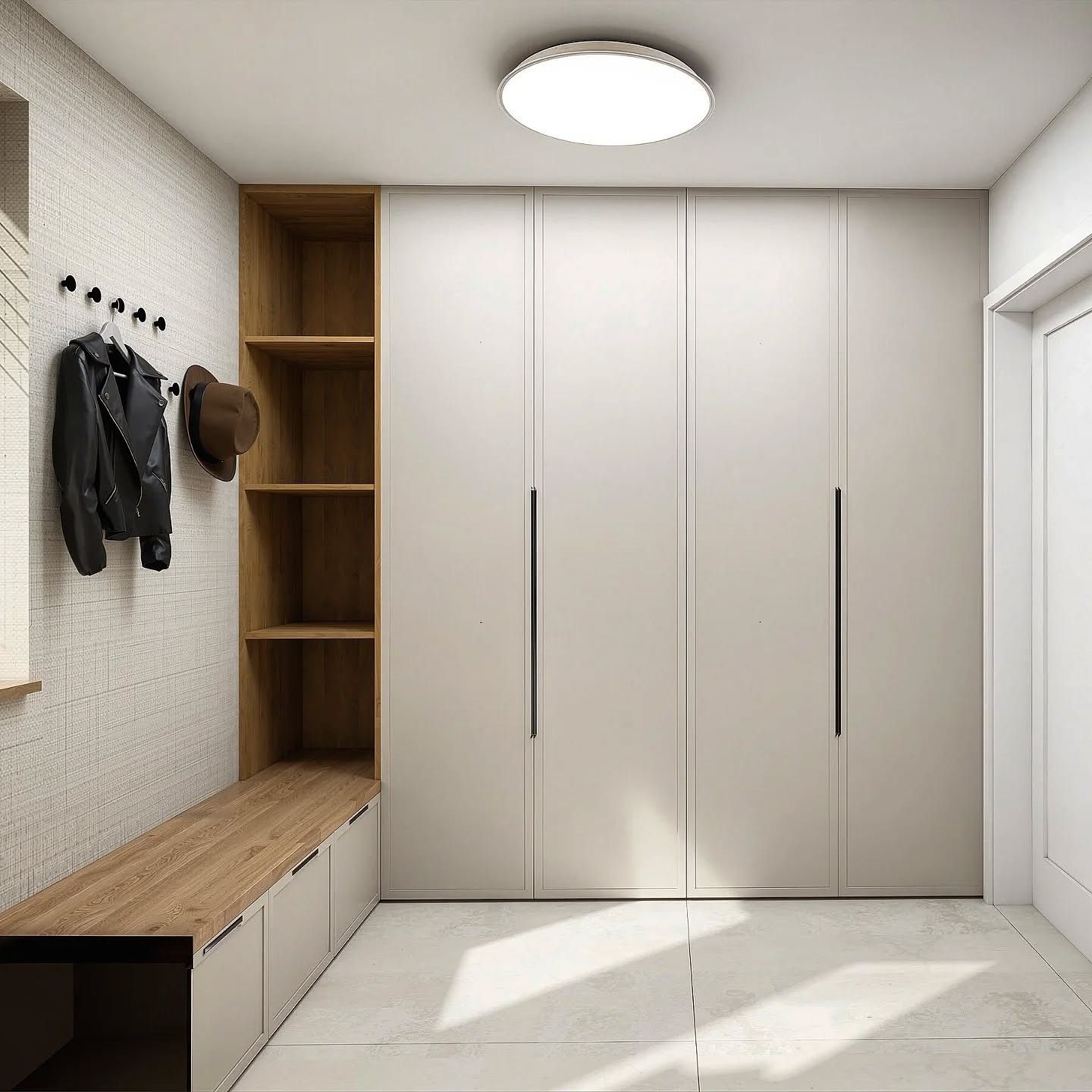 Najważniejsze w wiatrołapie (oprócz łapania wiatru 😉) jest dobre zorganizowanie przestrzeni. Ten wiatrołap spełnia wszystkie swoje funkcje. Jest przestronny, z mnóstwem miejsca do przechowywania, a zabudowa meblowa i jasne kolory sprawiają, że przestrzeń staje się uporządkowana, a jednocześnie przytulna 🤎