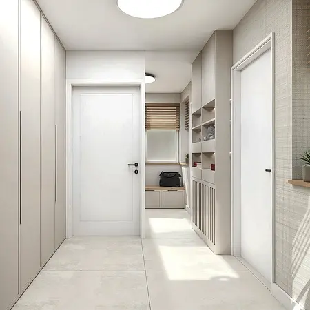 Przedpokój w stylu minimaluxe z beżowymi meblami i dodatkami w soft minimalizm. 3 zdjęć w projekcie Zobacz projekt