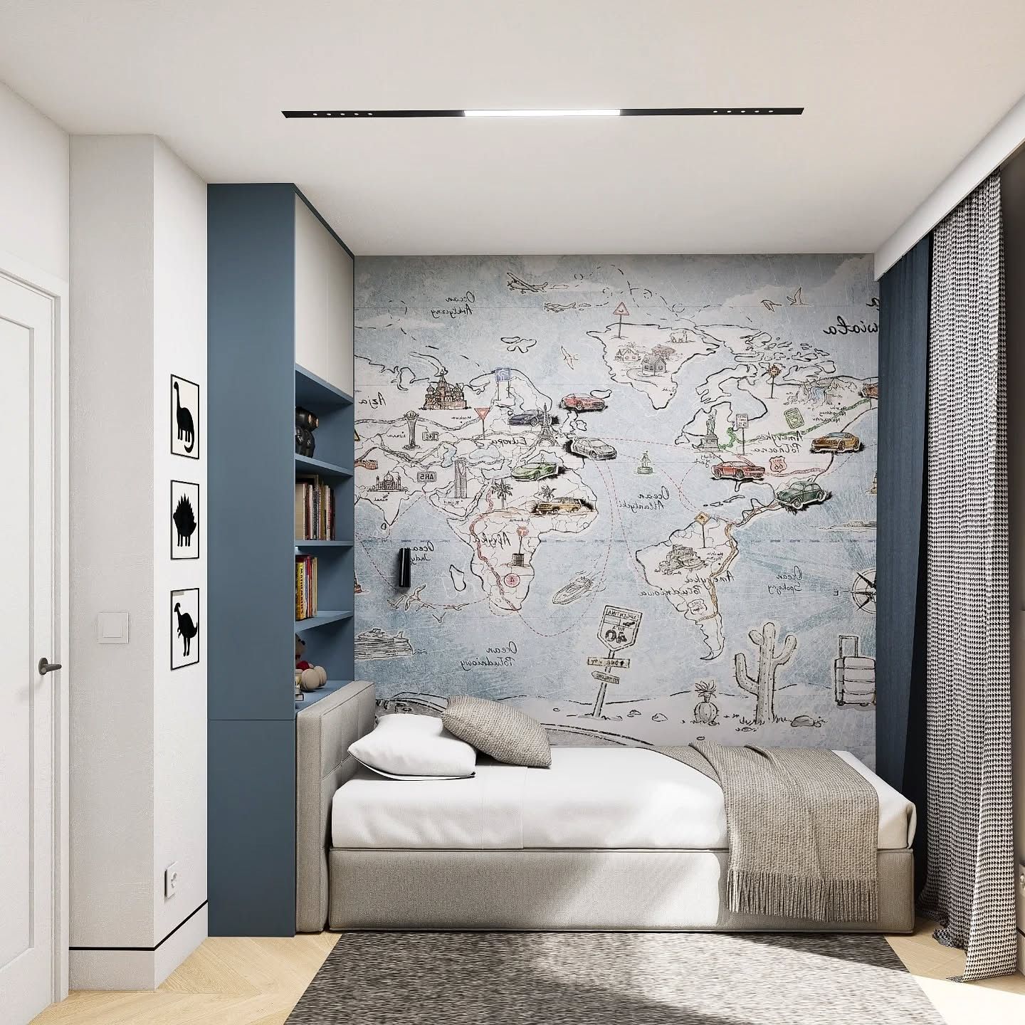 Motyw mapy na ścianie nie tylko zdobi wnętrze, ale też inspiruje do odkrywania świata i marzeń o pierwszych podróżach.
