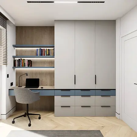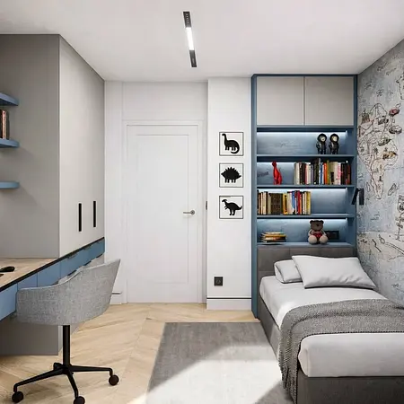 Jasna baza kolorystyczna, zabudowa stolarska na wymiar, wygodne miejsce do nauki oraz przytulna strefa snu tworzą przestrzeń idealną na co dzień.